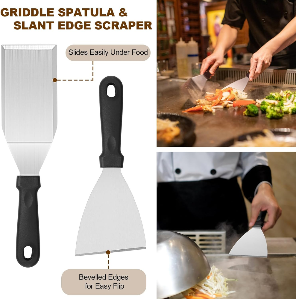 Store New Arrivals Add to Favorite View Feedback 14PCS Griddle Accessories Kit, Flat Top Grill Accessories Set for Blackstone and Camp Chef, Grill Spatula Set with Enlarged Spatulas, Scraper for Outdoor Barbecue Description Item model number Dee-8964US Manufacturer Deedro Item dimensions L x W x H 15 x 10 x 3 inches Product Dimensions 15 x 10 x 3 inches Material Stainless Steel Country of Origin China Is Dishwasher Safe Yes Item Weight 1.48 Kilograms Handle Material Stainless Steel Number of Pieces 14 Brand Deedro Included Components Spatula 【Perfect 14pcs BBQ Accessories】This griddle accessories kit includes: 1* long slotted spatula, 1* long griddle spatula, 1* small spatula, 1* slant edge scraper, 1* chopper, 1* cleaning brush, 1* sauce brush, 2* egg rings, 2* squeeze bottles, 1* grill tongs, 1* storage bag, 1* gift box. 【Premium Stainless Steel】Compared with other stainless steel on the market, Our metal flat top grill is made of high quality stainless steel, heat-resistant and rust-proof, safer and more durable. So you can easy enjoy your grilling, camping or cooking without worry about your tools bending, breaking or rusting again, which is BPA free you can use it with confidence. 【Easy to Clean & Storage & Carry】Our griddle tool kit is dishwasher safe, or easily wash by hand with water and soap, so you can enjoy a delicious barbecue with your family without hassle. Each tool can be placed in an orderly manner and better protected in the compact storage bag. Convenient hangers are provided for easy storage and food grade grill tools are easily cleaned with warm, soapy water. Note: After washing the spatula and scraper, please make sure to dry them to avoid rust. 【Chef's Choice griddle accessories kit】This grill tools set with griddle scraper, spatulas and oil bottles helps you to grill as easily as a restaurant chef. Great for flipping burgers, pancakes, veggies, cutting bread,meat and sausage, scraper & chopper to dice food and scrape griddles clean. The Long Griddle Spatula can move large amounts of food quickly and accurately. Egg rings and pepper shakers to enhance your griddle cooking experience. 【Great Gift Choice】This practical barbecue tools set with beautifully designed gift box is ideal gift choice for Fathers Day, Thanksgiving or Christmas. It includes all the tools needed for yard, outdoor, and camping barbecues an ideal gift for friends, lovers, or family members who love cooking or barbecue and camping enthusiast. Product Description ABOUT US We offer the best prices around on high quality products. Our E-store includes media such as books, movies, music and games while offering electronics, toys, sporting apparel, clothing, tools, general home, garden items and more. SHIPPING We are always working hard to ensure your package arrives as soon as possible. Please understand that some factors like weather, high postal traffic, and the performance of shipping companies are outside of our control. We offer free shipping to the lower 48 states and ship within 2 business days of payment, usually sooner. We do not accept P.O. Boxes. Please provide a physical address. RETURNS We offer a 30-Day Return Policy on items which you are not completely satisfied with. You have the option for a full-refund or an exchange of the item. No returns are available on items shipped outside of the USA. PAYMENT We accept PayPal. CONTACT US This page content is yet to come Please ad us to your favorite seller and visit again later Thank You