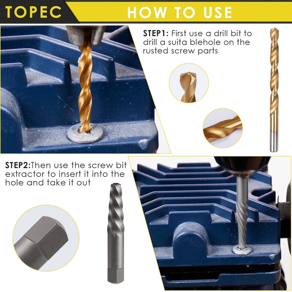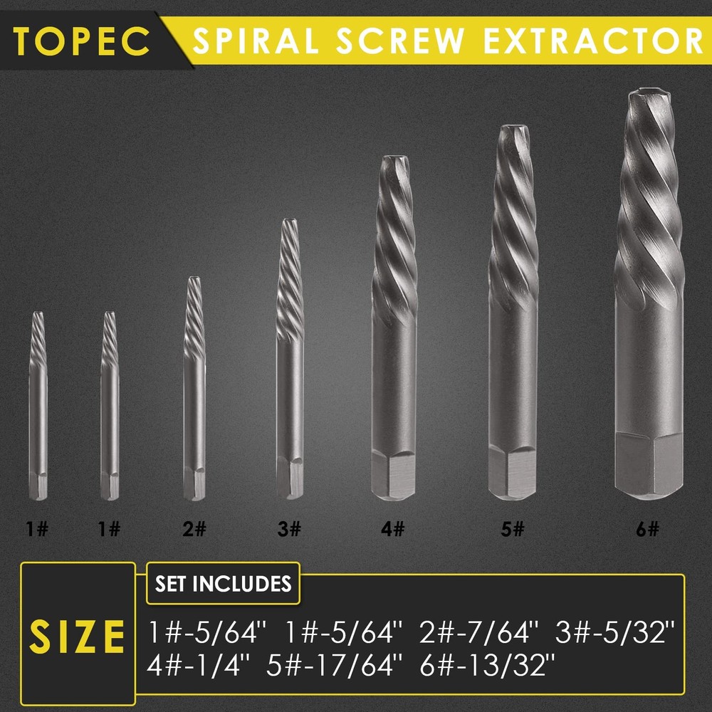 14-Piece Screw extractor Set : Including 7-piece screw extractor set and 7-piece drill bit set. With sizes ranging from 5/64", 7/64", 5/32", 1/4", 17/64", 13/32", as well as backup sizes of 5/64", this set has everything you need to tackle a variety of bolt and stud removal tasks. Durable Chrome Steel Material: Made of high-quality chrome steel, this set is built to last. It can withstand heavy use and is designed to be resistant to wear and tear, making it an excellent investment for both DIY enthusiasts and professionals. Sturdy Storage Case: The extractor and drill bit set comes with a sturdy storage case, making it easy to keep your tools organized and protected when not in use. The case is also designed to be compact and portable, making it perfect for on-the-go use. Versatile Applications: Whether you need to remove rusted, stripped, or damaged bolts and studs, or simply want to disassemble fasteners, this set is an excellent choice. It includes both screw extractors and drill bits, making it easy to tackle even the toughest tasks. Easy to Use: With its user-friendly design and high-quality materials, this extractor and drill bit set is easy to use and provides excellent results. Simply select the appropriate extractor or drill bit for the job, and let the tool do the work for you. Whether you're a seasoned pro or a beginner, this set is sure to make your job easier and more efficient.