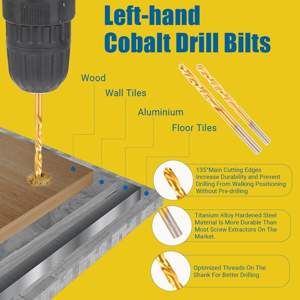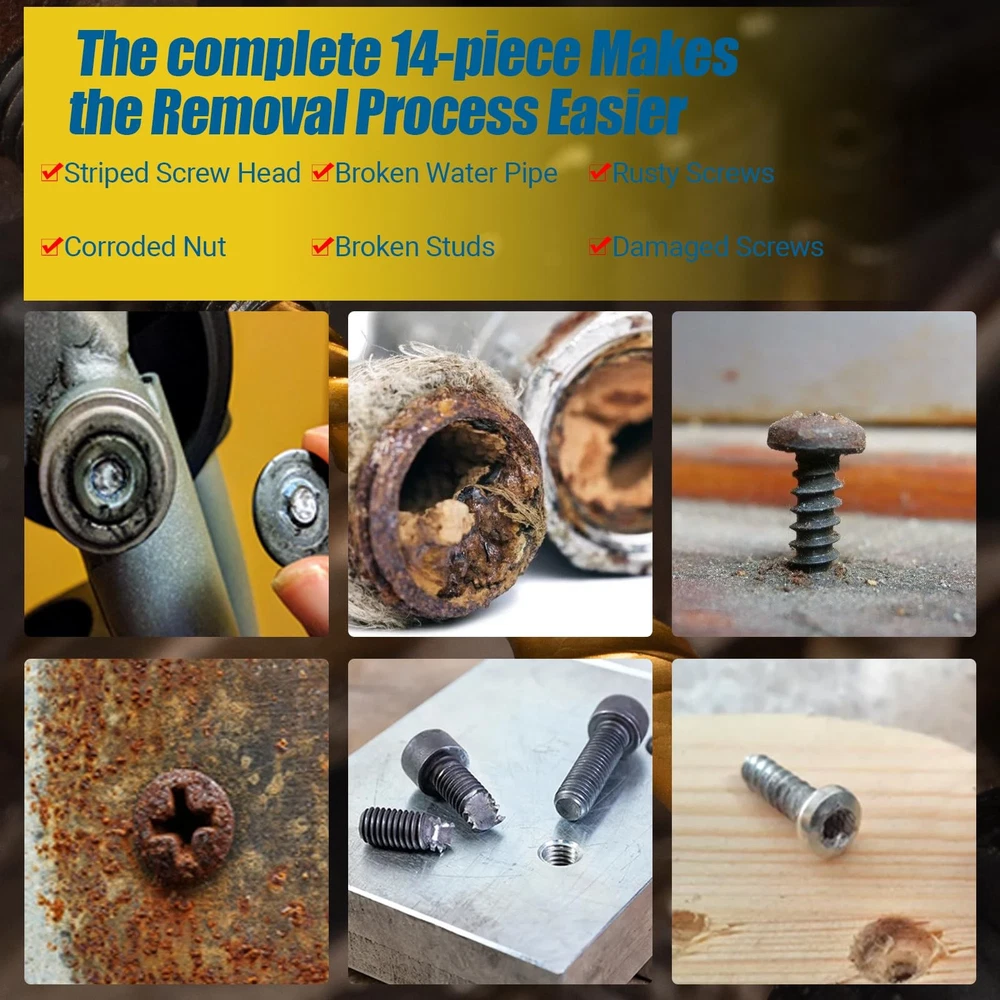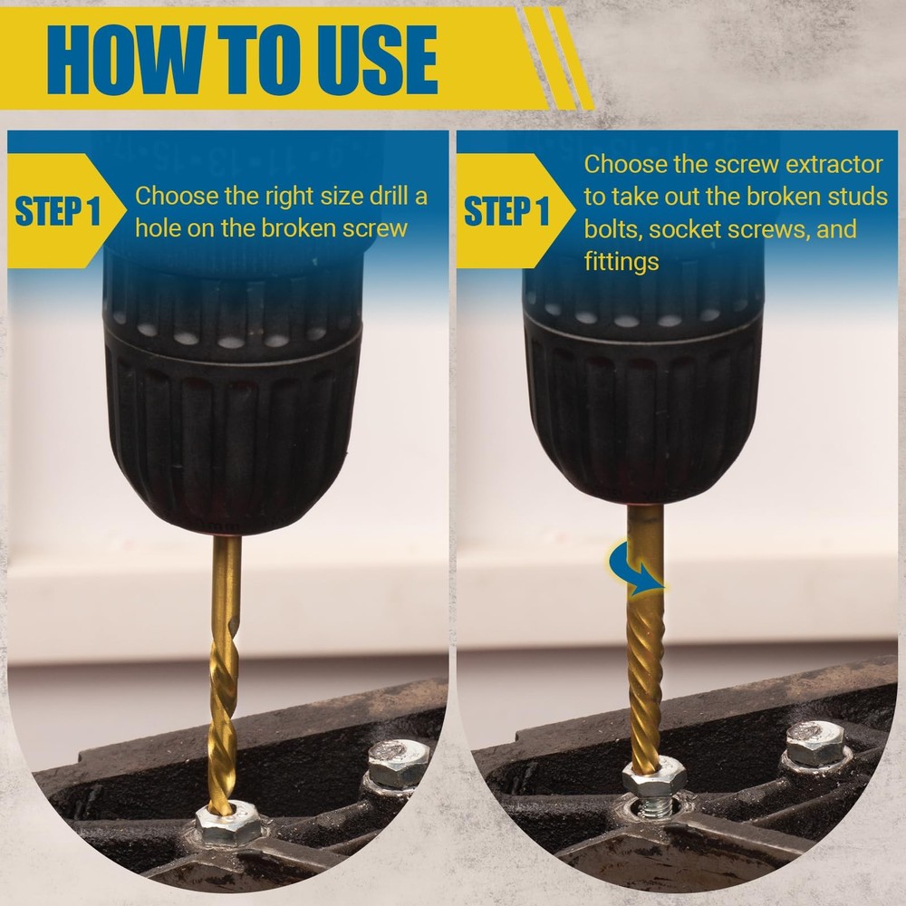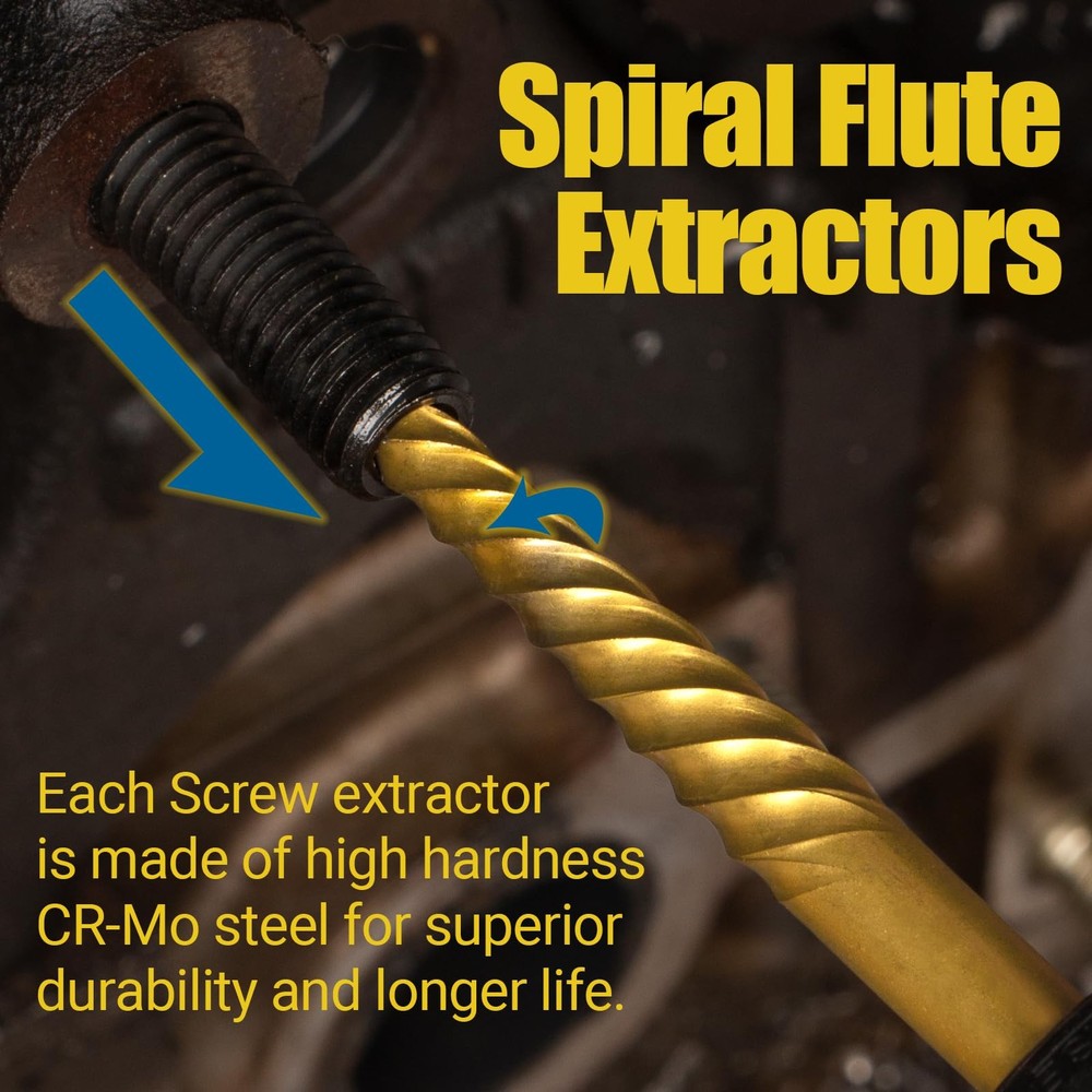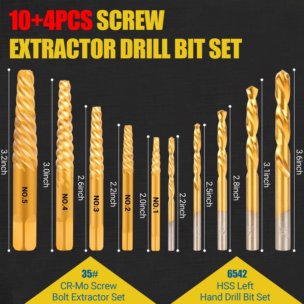 Why choose this Screw Extractor Set? This bolt extractor kit makes it easy to remove stuck, broken or tightened tools. Broken bolt extractor kit removes damaged screws, whether working on wood or metal, saving you valuable time and effort. All screw extractor are made of high hardness CR-MO, which is harder and tougher than chrome vanadium steel. The left-handed drill bit is constructed of high-speed 6542 HSS with a titanium coating for strength and endurance. 7pcs HSS left-hand drill bits and 7pcs easy out screw extractor. Screw extractors include 2*1#, 2*2#, 3#, 4#, 5#. Left-hand drill models include 2*1/8", 2*5/32", 3/16", 1/4", 19/64". The easy out bolt extractor set comes with a sturdy storage box that keeps the tools organized and protected when not in use. The compact size of the box also makes it easy to store and transport the set. Bolt extractor set are designed to remove stripped screws, bolt. Whether working on wood or metal, are ideal for construction, automotive, home DIY projects, or industrial use. Specifications: Screw extractors include 2*1#, 2*2#, 3#, 4#, 5#. Left-hand drill models include 2*1/8", 2*5/32", 3/16", 1/4", 19/64". 35# Cr-Mo Screw Extractors: The screw extractor are made of high hardness CR-MO steel. Spiral flutes are designed to embed themselves deeper into the metal as you turn the tool, making it easier to drill, rotate and remove damaged screws or bolts. 6542 HSS Left Hand Drill Bits: EZ Out bolt extractor set is designed with a 135°angle, which makes it easier to cut into the workpiece and has less axial resistance. Good process performance, high strength and toughness, suitable for impact resistant metal cutting tools. Durability: Enhanced with a titanium gold-plated surface, more durable and better resist corrosion than most screw extractors on the market, easy to remove any damaged screws. Additionally, the gold-colored bits add a touch of style and make it easy to distinguish them from other tools in my collection. All-in-One: 7pcs HSS left-hand drill bits and 7pcs easy out screw extractor. Screw extractors include 1#, 2#, 3#, 4#, 5#. Left-hand drill models include 1/8", 5/32", 3/16", 1/4", 19/64". Ensure that you have the right extractor for every situation. Come with 4 extra sizes: 1#, 2#, 1/8", 5/32". Our Commitment: We take pride in delivering a quality product. The bolt extractor kit comes with a sturdy storage box that keeps the tools organized and protected when not in use. Any problem can be solved. Buy with confidence and add to cart now!