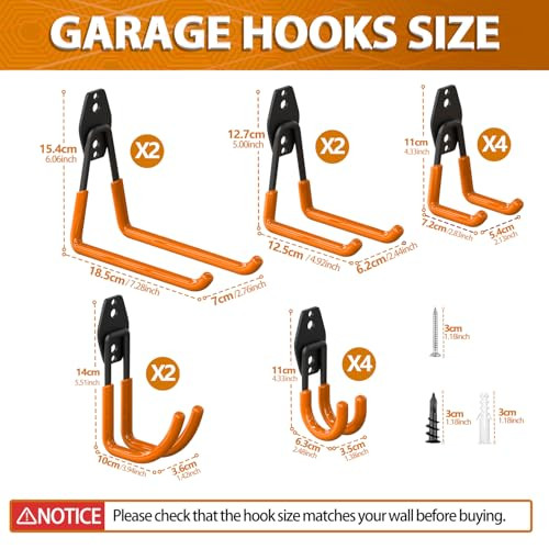 Return Policy Fast Delivery Trusted seller Garage Wall Hooks 14 Pack,Garage Hooks Heavy Duty with Extra Welding Spots,Garage Hooks for Hanging,Garage Organizer for Garden,Lawn,Yard Tools,Chairs,Ladders,WeedEater,Shovel,Blower(Orange) Product Description Premium Quality Garage Hooks Heavy Duty: The garage storage hooks made of heavy duty steel metal material which provides superior load-bearing capacity, and using anti slip PVC impregnation coating to prevent scratches. The garage tool hanger also equipped with premium quality screws, make the garage wall hooks hang more firmly on the wall and not easily fall off Upgrade Design-Triangle 3 Welding Dot Support: Different from other similar garage hooks with only 2 welding spots, we designed 3 welding dot to connect the garage tool organizer with the base, offering higher security and no worrying about the rear steel panel splitting or falling off, a perfect choice of wall hooks for hanging heavy duty Various Sizes For All Needs: 14 pcs wall hooks for hanging heavy duty in 5 different sizes,including 2 large square type ladder hooks for garage wall, 2 medium square type garage storage hooks, 4 small square type garage wall hooks, 2 medium J type ladder hanger and 4 small J type utility hooks for garage. The length of the steel screw nail, the black wide thread screw plug and the white plastic anchor is individually 1.18", 1.3" and 1.18" Multi-Use Utility Hooks: The storage hooks for hanging in garage are ideal for garage, garden, shop, basement, warehouse, shed, or man cave, etc occasions. Our garage hooks for hanging can provide a great solution to use garage storage space more efficiently, the garage organization can hang various items like garden tools,ladders, bikes, strollers, chairs and so much more Easy To Install: These garage hanging hooks are suitable for various walls. You can install them effortlessly. For plaster walls: (1) Insert black expansion screws into the two large holes of the heavy duty garage hooks; (2) Low speed drilling or manual tightening of steel screws. For wooden/brick/concrete walls: (1) Mark the two small holes for the garage hangers on the wall; (2) Drill holes and insert white expansion pipes; (3) Drill in steel screws Shipping Returns Payment Shipping Shipping is FREE to all addresses other than APO/PO boxes in the lower 48 states. All our stock ships from US-based warehouses. Shipped via USPS or UPS (depending on location and package weight) Unless stated otherwise, all orders will ship within 24-72 hours of your payment being processed. Check our feedback to see the great reviews of FAST shipping we offer. Returns Seller does not accept returns Payment We currently accept payment via eBay managed payments only. Once payment is cleared, we will dispatch your shipment within 1-3 business days. Please refer to the "Shipping" tab for more information regarding shipping speed to your destination.