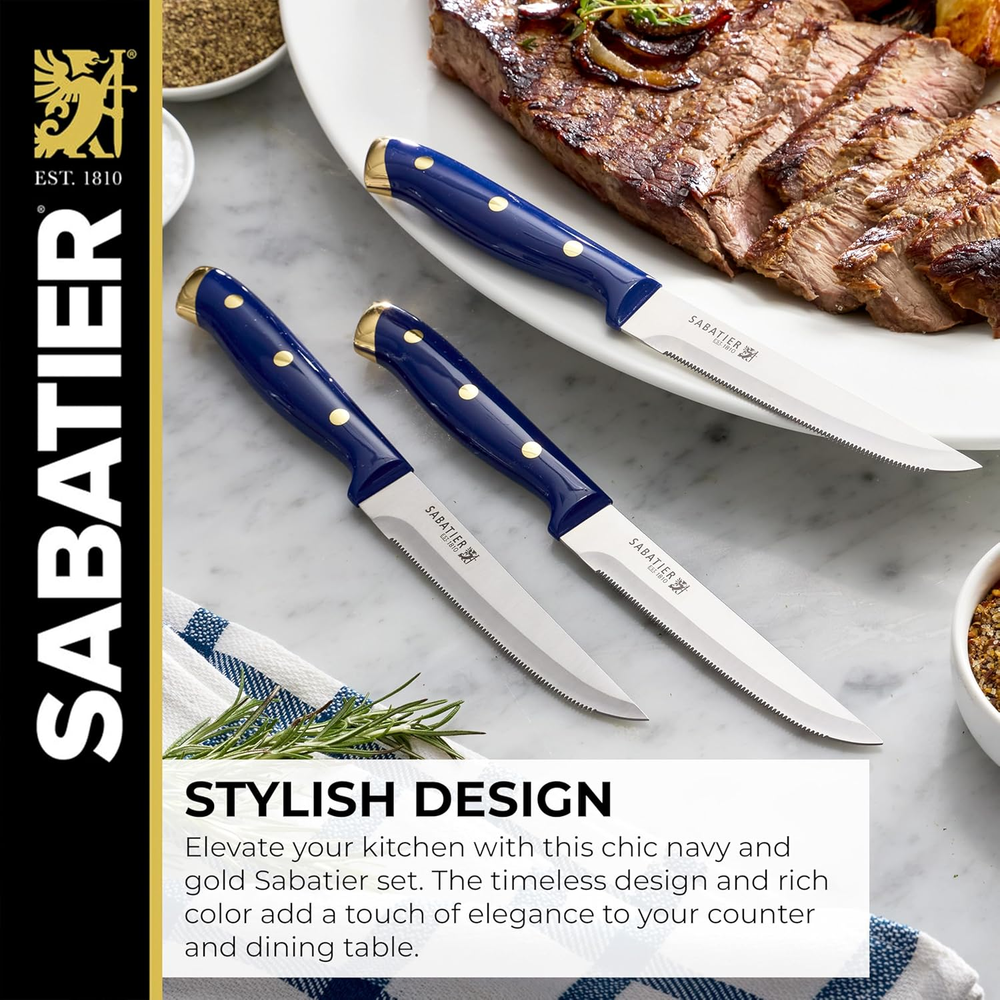 Store New Arrivals Add to Favorite View Feedback Contact 14-Piece Forged Triple Rivet Knife Set with Acacia Block, Navy with Gold, High-Carbon Stainless Steel Blades for Precision Cutting Description Item model number 5317039 Style Modern Color Navy/Gold Country of Origin China Item dimensions L x W x H 10.8 x 11.22 x 3.93 inches Is Dishwasher Safe No Item Weight 6.78 pounds Construction Type Forged Blade Material High Carbon Stainless Steel Product Dimensions 10.8 x 11.22 x 3.93 inches Included Components Knife Block Set COMPREHENSIVE COLLECTION: This set includes an chef knife, slicing knife, serrated utility knife, santoku knife, fine edge utility knife, paring knife, six steak knives, all purpose scissors, and an acacia wrapped block EXPERTLY FORGED BLADES: Precision forged from high carbon stainless steel, these knives deliver unmatched sharpness, durability, and performance for any task, from intricate prep work to hearty slicing ERGONOMIC TRIPLE RIVETED HANDLES: Designed for exceptional comfort and balance, the triple riveted handles provide optimal control and elevate your cooking experience with ease ELEVATED STYLE FOR YOUR KITCHEN: The navy handles with gold accents add a modern touch of luxury, while the acacia wood block brings timeless warmth and elegance to your countertop A PERFECT GIFT OR KITCHEN UPGRADE: Whether it’s for a wedding, housewarming, or your own culinary refresh, this set offers the perfect balance of style and practicality, making it an impressive gift or an elegant addition to your home The Sabatier 14 Piece Forged Triple Rivet Knife Set with Acacia Block brings a perfect balance of elegance and performance to your kitchen. Crafted from high carbon stainless steel, each blade is precision forged for exceptional sharpness and durability, ensuring outstanding results for every culinary task. The ergonomic triple riveted handles, designed for comfort and control, are beautifully finished in navy with gold accents, adding a sophisticated touch to your space. This comprehensive set includes an 8 in chef knife, 8 in slicing knife, 5.5 in serrated utility knife, 5 in santoku knife, 4.5 in fine edge utility knife, 3.5 in paring knife, six 4.5 in steak knives, all purpose scissors, and an acacia wrapped block that keeps your knives stylishly organized. ABOUT US We offer the best prices around on high quality products. Our E-store includes media such as books, movies, music and games while offering electronics, toys, sporting apparel, clothing, tools, general home, garden items and more. SHIPPING We are always working hard to ensure your package arrives as soon as possible. Please understand that some factors like weather, high postal traffic, and the performance of shipping companies are outside of our control. We offer free shipping to the lower 48 states and ship within 2 business days of payment, usually sooner. We do not accept P.O. Boxes. Please provide a physical address. For shipping outside of the continental USA, we only use eBay's Global Shipping Program.The item is shipped to KY and then sent to the rest of the world. International customers are responsible for all duties and taxes. Continue to check out in order to calculate costs for shipping the item to your country. Messages regarding eBay's Global Shipping Program MUST be directed at eBay EXCLUSIVELY. RETURNS We offer a 30-Day Return Policy on items which you are not completely satisfied with. You have the option for a full-refund or an exchange of the item. No returns are available on items shipped outside of the USA. PAYMENT We accept PayPal. CONTACT US This page content is yet to come Please ad us to your favorite seller and visit again later Thank You CUSTOMER SATISFACTION We try our very best to make sure every customer is completely satisfied. If there's a problem, message us! We're happy to help. WE ACCEPT Copyright © 2021 AutoDS. | All Rights Reserved