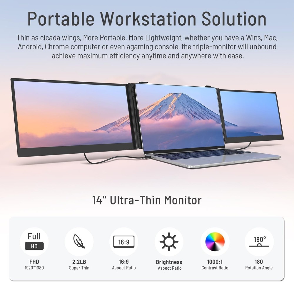 【Ultra-Slim 1080P FHD IPS Monitor】Macsecor 14'' triple laptop screen extender features 0.17-inch ultra slim FHD 1080P IPS dual displays, HDR mode brings realistic colors, each screen can independently adjust the brightness, contrast, color temperature and other parameters to ensure with home screen consistent color and image clarity maintained. Flexibly adjust the screen rotation Angle 180 degrees, adjust the best viewing Angle at any time,providing you with a personalized and immersive visual experience. 【Upgraded Aluminum Alloy Tri-Screen】This portable monitor for laptop with upgraded aerospace aluminum alloy materials (70% lighter) , unlike traditional plastic monitor extenders, it offers superior heat dissipation and a higher-quality texture. Macsecor tri-screen is designed to keep up with you: its ultra-lightweight body can be easily clamp onto the frame of laptops without causing any damage to your laptop's screen, while making your laptop more flexible. 【Wide Compatibility】Macsecor triple portable laptop monitor work for 13"-17.3" laptops, connect via full-featured USB-C and HDMI, making it compatible with a wide range of devices including laptops, desktops, tablets, and gaming consoles like PS5, PS4, Xbox, and Switch. (Included for M1-M4 Chip MacBooks). Only two cables are needed to turn your laptop screen into a triple screen anytime, anywhere—greatly helping maintain a clean and efficient workspace. (Note: If you are not sure whether your laptop is compatible, you can consult us first to check for you, and we will respond within 12 hours.) 【Customize Mode】The 14'' laptop multiple screens attachment supports you to open multiple windows at the same time, work, video conference, watch movies, or play games on different screens. With expansion, mirroring, and second-screen modes, it provides perfect multi-screen synchronization and multi-screen differential display for laptop users, allowing you to handle different tasks at the same time which increase your office efficiency by 300%, provide an amazing experience for professionals, Players, Stock traders, Programmers! 【Ultra Light Weight & Convenient】Our portable travel monitor designed specifically for on-the-go efficient professionals who pursue ultimate portability, the upgraded ultra-slim laptop monitor extender single screen features a only 0.17 inch ultra-slim profile(1.3lb), which is only half the thickness of the tri-screens on the market, this is a truly dual monitor that is as thin as a cicada's wing but has stronger performance. The thin and compact chassis makes multitasking from any-where a breeze- your ultimate mobile office companion!