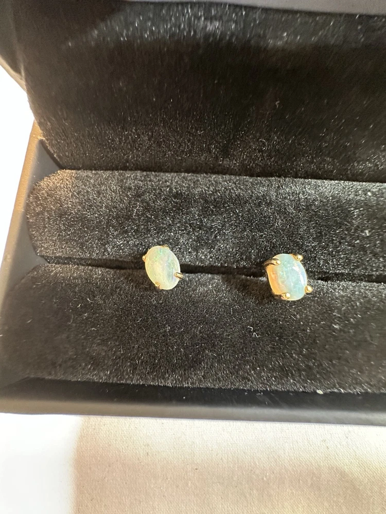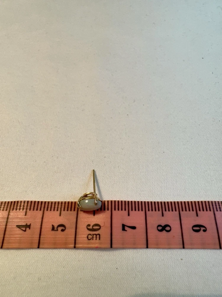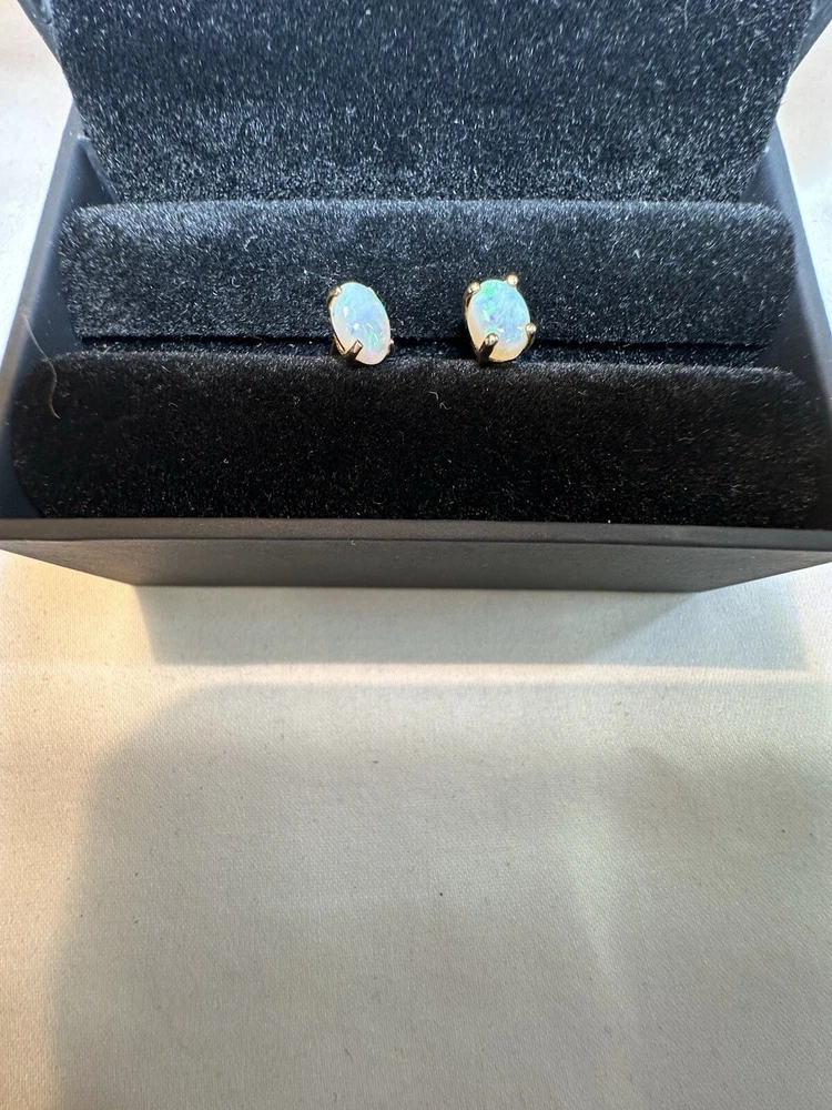 These small 14k yellow gold earrings feature a 5mm white opal. The earrings are designed as studs with a solitaire setting, and are nickel-free. They are ideal for various occasions such as engagement, anniversary, birthday, Christmas, Mother's Day, Valentine's Day. The gemstone clarity grade is eye clean, and the earrings have a total diameter of 7mm.
