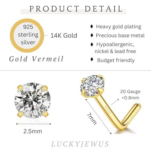 Return Policy Fast Delivery Trusted seller 14k Gold Plated Sterling Silver Small L Shaped Nose Rings Studs for Women Men 20g, 20 Gauge Nostril Nose Piercing Jewelry, Hypoallergenic Gold Nose Stud with Tiny CZ Diamond Product Description ✦ Stunning Shine: Upgrade your style with our elegant gold nose rings studs. Crafted with care, our 20g nose studs feature 2.5mm dazzling cubic zirconia cz diamond, set in sterling silver for a touch of luxury. ✦ Effortless Elegance: Make a statement with our variety of nose ring studs for women. From hypoallergenic options to unique designs, find your perfect piece of nose jewelry and express your individuality. ✦ Stylish Versatility: Discover the perfect nose piercing studs to match your mood. Our 14k gold nose studs collection include: Pink Crystal, Black CZ,Green Emerald, Blue Aquamarine, Purple Amethyst, Red Garnet, Blue Sapphire, cute corkscrew designs for all-day comfort. ✦ On-Trend Accessories: Elevate your nose ring game with our selection of l shaped nose rings for women. Please check our store for chic nose rings hoops, double hoop nose rings or stud nose rings, and experiment with different styles to stand out in any crowd. ✦ AMERICAN OWNED: Based in sunny California, proudly operated by a small business owner from the USA. Shipping Returns Payment Shipping Shipping is FREE to all addresses other than APO/PO boxes in the lower 48 states. All our stock ships from US-based warehouses. Shipped via USPS or UPS (depending on location and package weight) Unless stated otherwise, all orders will ship within 24-72 hours of your payment being processed. Check our feedback to see the great reviews of FAST shipping we offer. Returns Seller does not accept returns Payment We currently accept payment via eBay managed payments only. Once payment is cleared, we will dispatch your shipment within 1-3 business days. Please refer to the "Shipping" tab for more information regarding shipping speed to your destination.