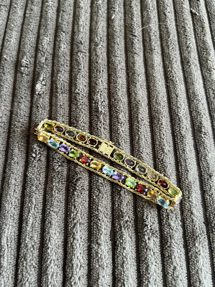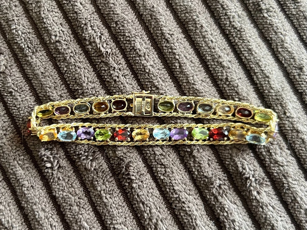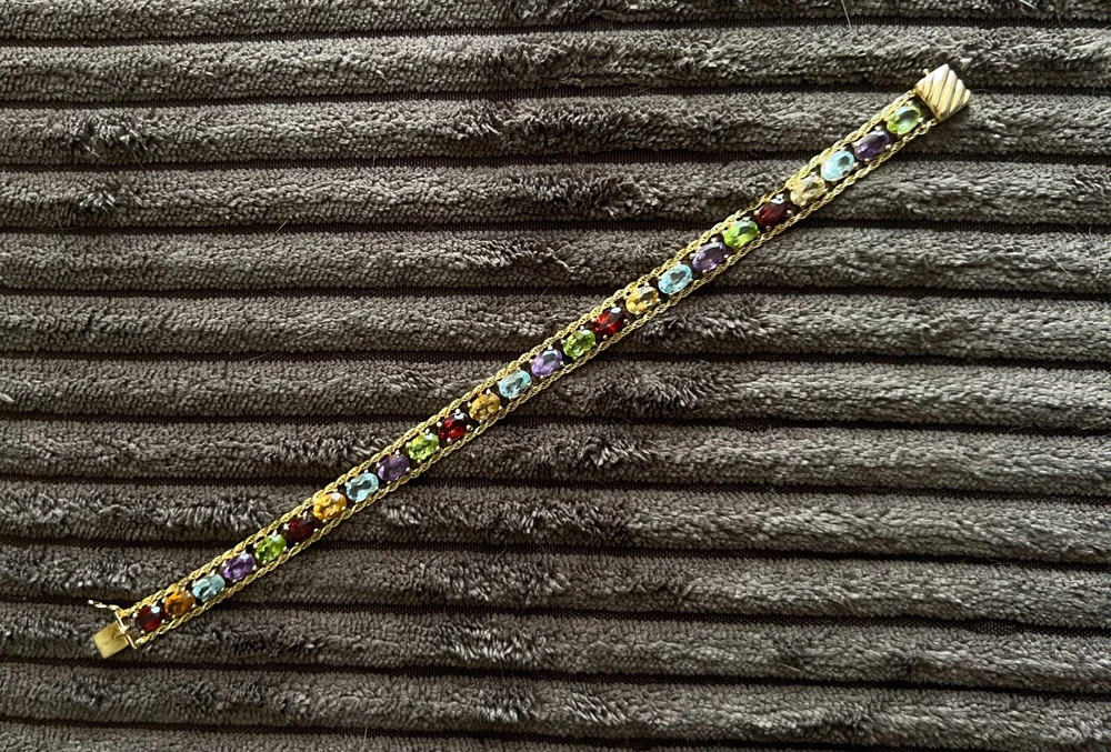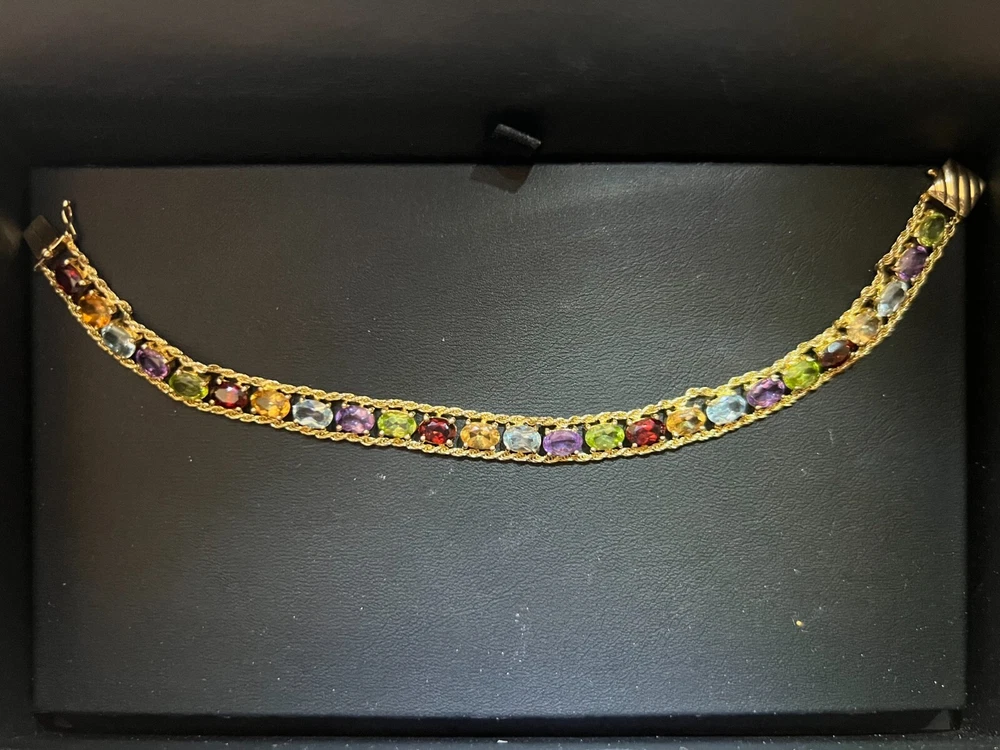 This 14k Gold Tennis Bracelet features a stunning array of gemstones including Amethyst, Garnet, Aquamarine, Citrine, and Peridot. The gemstones are in oval shapes and set in a prong style on a 7-inch yellow gold bracelet. The closure is a box clasp for secure wear. This multicolored gemstone bracelet exudes elegance and sophistication, making it a beautiful addition to any jewelry collection.