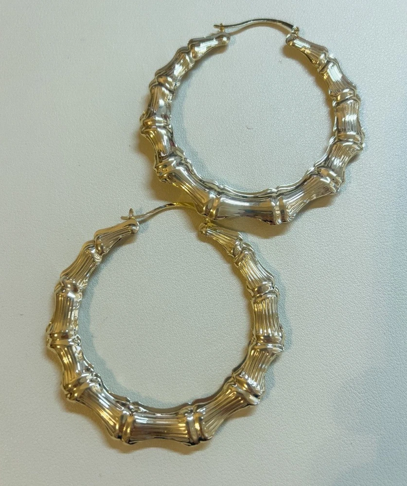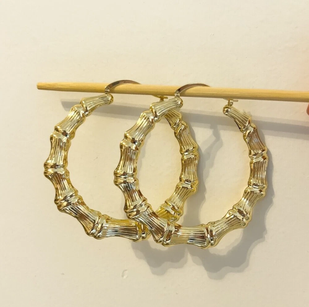 Elevate your style with these exquisite gold-filled bamboo hoop earrings. Inspired by the natural elegance of bamboo, these earrings feature a segmented design that adds a unique texture and dimension to any outfit. The reflective, shiny surface enhances their luxurious appearance, making them perfect for both everyday wear and special occasions. The medium-sized hoops are designed for comfort and durability, ensuring they stay in place all day with a secure clasp. Add a touch of sophistication and nature-inspired beauty to your jewelry collection with these stunning gold-filled bamboo hoop earrings. Features: Material: Gold-filled Design: Bamboo-like segmented texture Size: Medium Closure: Secure clasp Lightweight and comfortable Perfect for everyday wear or special occasions Dimensions: Diameter: Approximately 3.1 inches Width: Approximately 0.3 inches Why Choose Gold-Filled? Unlike gold-plated jewelry, gold-filled pieces are created with a thicker layer of gold, ensuring a longer-lasting finish that resists tarnish, flaking, and wear. With proper care, these earrings will maintain their beauty for years to come.