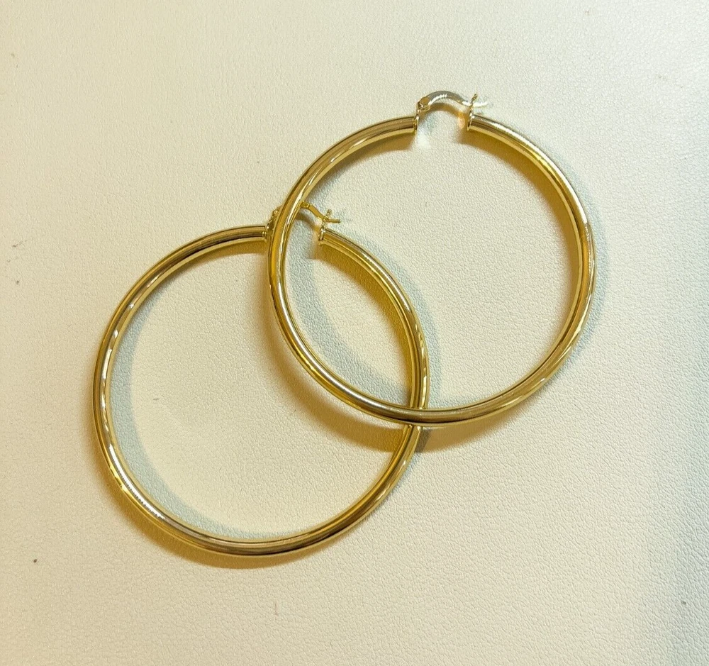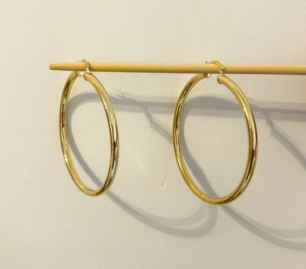 Add a touch of elegance to your look with these stunning gold-filled hoop earrings. Crafted with meticulous attention to detail, these earrings feature a smooth and shiny surface, making them a perfect accessory for any outfit. The large-sized hoops are ideal for both everyday wear and special occasions. The gold-filled material ensures durability and a long-lasting shine, giving you the luxurious look of gold without the hefty price tag. Lightweight and comfortable, they come with a secure clasp that keeps them in place all day. Elevate your jewelry collection with these exquisite gold-filled hoop earrings. Features: Material: Gold-filled Design: Smooth and shiny surface Size: Large Closure: Secure clasp Lightweight and comfortable Perfect for everyday wear or special occasions Dimensions: Diameter: Approximately 1.5 inches Width: Approximately 0.25 inches Why Choose Gold-Filled? Unlike gold-plated jewelry, gold-filled pieces are created with a thicker layer of gold, ensuring a longer-lasting finish that resists tarnish, flaking, and wear. With proper care, these earrings will maintain their beauty for years to come.