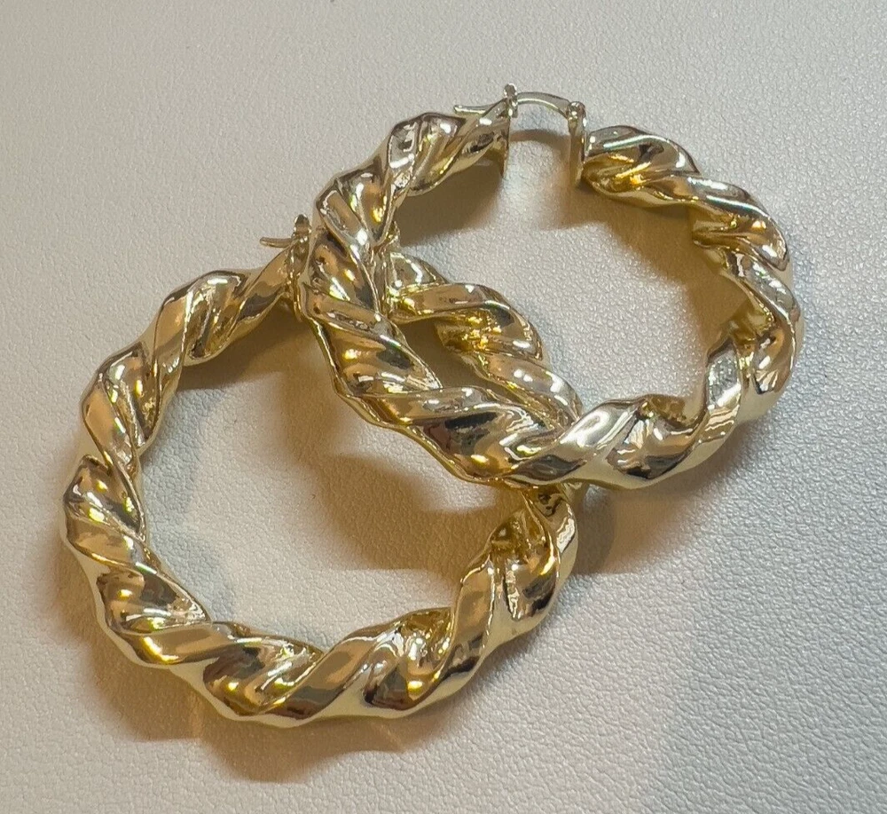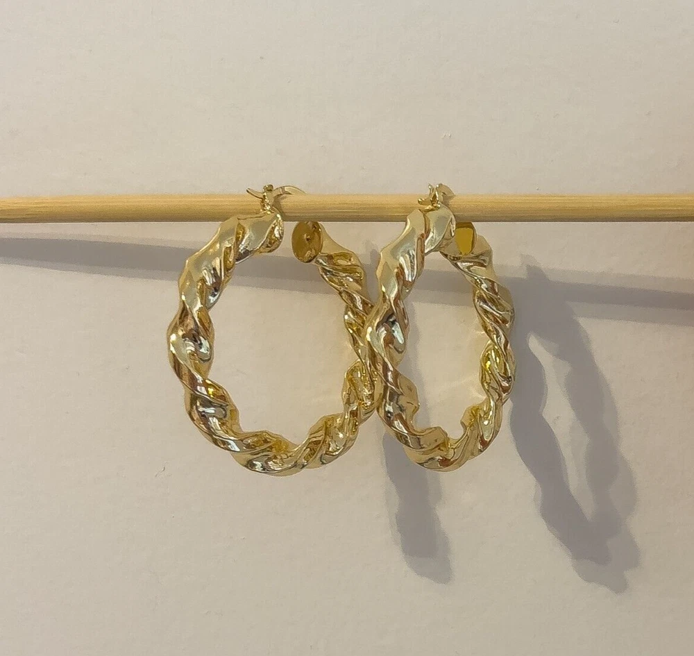 Elevate your style with these stunning gold-filled hoop earrings. Crafted with meticulous attention to detail, these earrings feature a unique twisted design that adds texture and dimension to any outfit. The hoops are medium-sized, making them perfect for both everyday wear and special occasions. The gold-filled material ensures durability and a long-lasting shine, giving you the luxurious look of gold without the hefty price tag. These earrings are lightweight and comfortable to wear, with a secure clasp that keeps them in place all day. Add a touch of elegance and sophistication to your jewelry collection with these exquisite gold-filled twisted hoop earrings. Features: Material: Gold-filled Design: Twisted texture Size: Medium Closure: Secure clasp Lightweight and comfortable Perfect for everyday wear or special occasions Dimensions: Diameter: Approximately 2 inches Width: Approximately 0.25 inches Why Choose Gold-Filled? Unlike gold-plated jewelry, gold-filled pieces are created with a thicker layer of gold, ensuring a longer-lasting finish that resists tarnish, flaking, and wear. With proper care, these earrings will maintain their beauty for years to come.