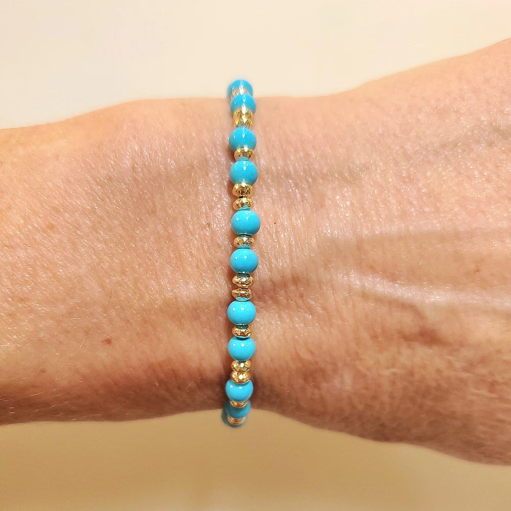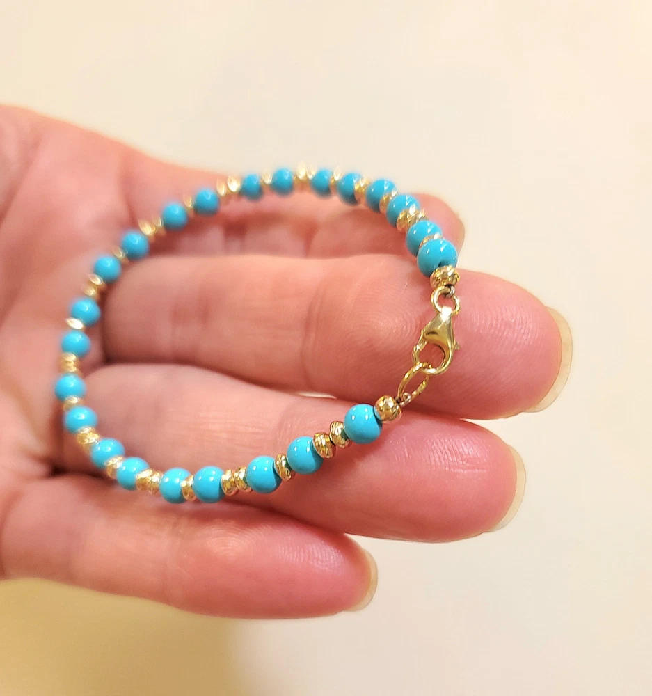 **GET LOWER PRICES ON OUR WEBSITE!! - BOCHELLIJEWELRY.COM - (not on here on our own website) ***THIS IS A HANDMADE ITEM AND IS STAMPED 14K ON THE CLASP*** THIS LISTING IS FOR ONE SOLID 14K GOLD and TURQUOISE BEAD BRACELET WITH LOBSTER CLASP Natural Sky Blue Sleeping Beauty 4mm Beads 14k Solid Yellow Gold 3mm Hammered Saucer Beads - Rose White Gold are NOT available. 14k Solid Yellow or Rose Gold 7mm Pear Shaped Lobster Clasp Flexible Non-Tarnish Steel Wire MEASURE YOUR WRIST!!! Before Ordering and ADD 1/2" (for 4-6mm beads only). DO NOT MEASURE ANOTHER BRACELET. OUR LENGTHS INCLUDE THE CLASP AND END PARTS. You can wrap a piece of string around then measure the string. * BUYER PAYS RETURN SHIPPING so please take a second to Measure and Determine The Length you need, so you can order the right length. Our Lengths Include the Clasp/End Parts. • IMPORTANT: Measuring a bracelet made of different size beads than you are ordering from us will cause errors. Measure around Your Wrist then add 1/4". • We Photograph Items on a Ruler Before Shipping. If you believe we sent the wrong size, send us a photo of it on your ruler before opening a return stating its the wrong size. Note: Objects in Close Up Photos can Seem Bigger than they are. Compare measurements in the listing to Your Own Ruler before purchasing. ** 3-12mm gold beads available. Hundreds of Styles! see our shop WHAT ITS STRUNG ON: IF IT SAYS CHAIN IN THE TITLE: then its strung on 14k Solid Gold Chain. IF IT DOES NOT: then it uses flexible steel beading wire, steel chain or clear stretchy elastic cord. Most bead jewelry sold online and in stores is strung on steel beading wire or stretch cord because solid gold flexible wire would break very easily and cost a lot more. Only bead sizes 3mm and larger can be strung on our 14k solid gold chain. The holes of most gemstone beads are too small for chain. The term Solid Gold is used to differentiate Our Real Gold items from the plated or gold-filled items Sold by Others. PRODUCTION TIME: OUR ITEMS ARE HANDMADE AFTER YOU ORDER THEM. They are Not ready to go items. We ship in 3 business days. A business day is Mon-Fri. The day you order Does Not count. If you order on Monday it will not be due to ship until Thursday, etc. Faster Shipping Speeds are available at checkout. We Do Not accept rush order requests. REFUNDS: ITEMS MUST BE RETURNED IN THE SAME NEW CONDITION THAT THEY WERE RECEIVED WITHIN 30 DAYS OF RECEIPT. ITEMS ARE SHIPPED IN A GIFT BOX INSIDE A PADDED ENVELOPE. RETURNS MUST BE PACKAGED THE SAME WAY to insure there is no damage to the items. Damaged Items are Not Returnable for Any Reason. INTERNATIONAL BUYERS: We ship Fedex for a flat fee of $35. FEDEX REQUIRES A PHONE NUMBER FOR ALL INTERNATIONAL PACKAGES. Please add it to your shipping address. Approximate delivery speed is 6-10 days (we cannot guarantee this but it has been typical in our experience).
