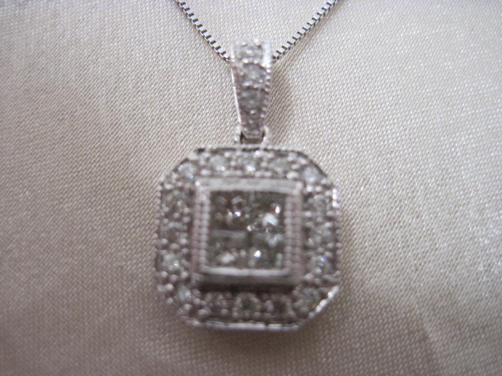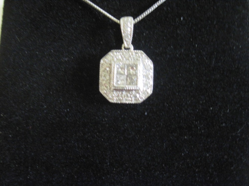This 14k white solid gold pendant showcases four striking princess cut diamonds featured in the center of the pendant framed in a halo style of pav-set diamonds, offering brilliant sparkle with every movement. Total weight is 3 grams for chain and pendant. Crafted with precision and care, its cluster design delivers a refined expression of modern style that complements both upscale and everyday looks. Whether worn as a daily signature or for special occasions, this pendant blends timeless craftsmanship with contemporary sophistication, making it a standout piece in any refined jewelry collection. This beautiful pendant comes with an 18" 14k white solid gold chain.