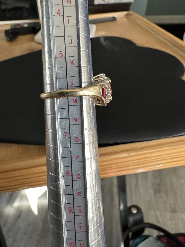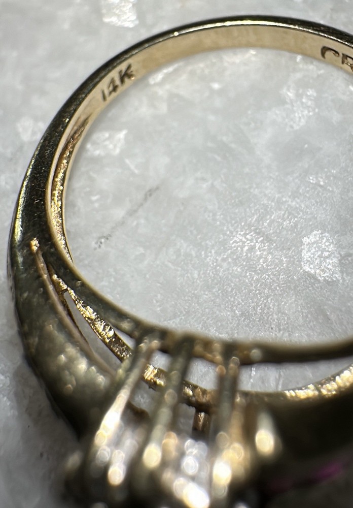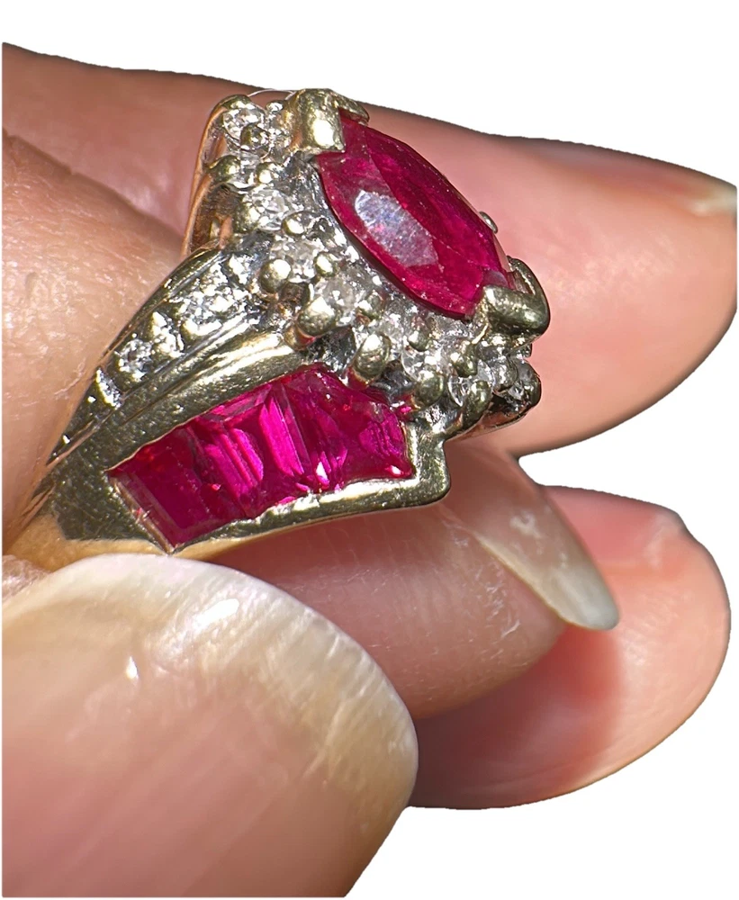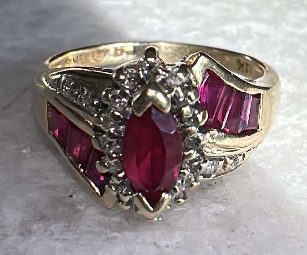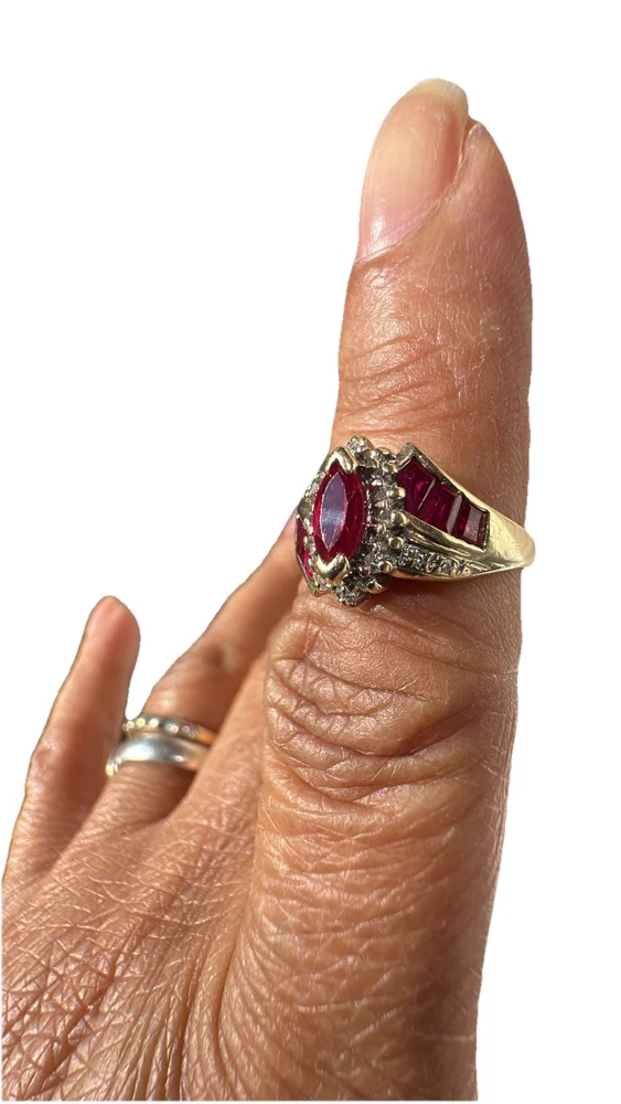 This 14k Yellow Gold 1 Carat Copyright Sign Lab Created Ruby Ring in Size 5 3/4 is a stunning piece of fine jewelry. The marquise-shaped ruby set in a prong setting adds a touch of elegance to any outfit. This handmade ring is perfect for occasions like anniversaries and birthdays, making it a thoughtful and meaningful gift. The bold red color of the ruby and the warmth of the yellow gold metal create a cocktail ring style that is both stylish and eye-catching.