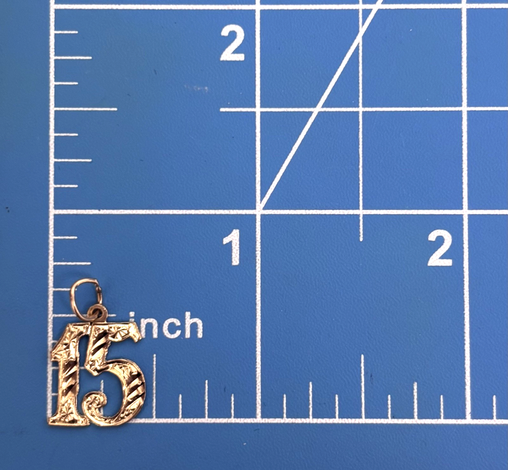 Celebrate a special milestone with this beautiful 14k yellow gold number 15 charm featuring diamond cut elements and small starburst details for extra sparkle. The design is outlined by a thin, slightly raised border that adds dimension and a clean finished look, and it is completed with a classic jump ring bail for easy wear on a chain or charm bracelet. This piece has been professionally tested and certified as 14k gold, and the back of the charm is marked "14K - DZ". Measurements Charm size (not including bail): apx. 0.6mm x 11.6mm x 14.6mm Inner bail diameter: apx. 4mm Total weight: apx. 0.64 grams Why Buyers Love This Style Perfect milestone charm for birthdays and anniversaries Diamond cut texture adds bright sparkle and shine Starburst detailing gives a fun vintage-inspired finish Easy to add to charm bracelets or wear as a pendant 14k yellow gold number 15 charm sweet fifteen pendant diamond cut charm birthday milestone charm anniversary charm gold number pendant collectible charm bracelet pendant estate fine jewelry gift Item #2029
