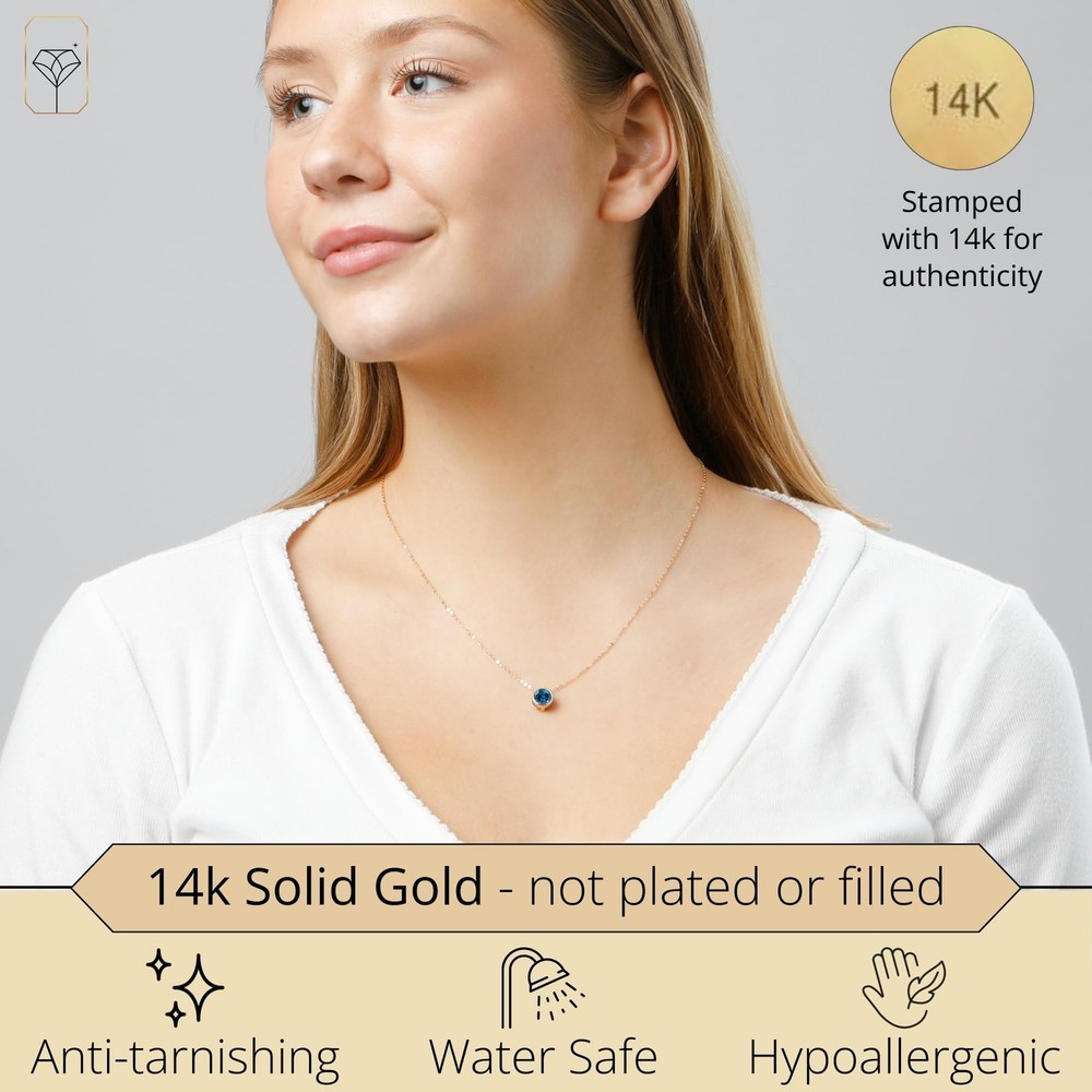 14k Gemstone Bezel Necklace Classic, timeless, and versatile gemstone necklace that you can wear casually, to work, to special occasions and everything in between. Choose from an array of gemstones offered in both 14k yellow or white gold, our gold necklace for women non tarnish make the perfect gift to a loved one (or yourself). Birthstone Jewelry, Uniquely Yours! Celebrate your loved ones with 14k gold necklace pendant, a personalized gift choice that not only dazzles with captivating colors but also carries a deeper sentimental meaning, making 14 kt gold necklace for women a cherished token of love and thoughtfulness for any special occasion. Each 14 karat gold necklace becomes a timeless keepsake, symbolizing the precious moments and memories, creating a truly unforgettable gift that will be treasured for a lifetime. Real 14k Gold - All parts of our blue topaz necklace are crafted in your choice of yellow gold and stamped with “14k”. 14k gold will not oxidize or discolor. Wear this December birthstone necklace every day, everywhere. A great addition to your collection birthstone necklace for women Topaz Gemstone Necklace - The gemstone of topaz necklace for women measures 7mm and surrounded by a halo bezel of solid 14k gold. Each gold birthstone necklace for women comes with a solid 14k cable chain measuring 18 inches. London blue topaz is the birthstone for December birthdays December Birthstone Jewelry - Classic, timeless, and versatile gold gemstone topaz pendant that can be worn casually, to work, to special occasions and everything in between. Make birthstone pendants your statement piece or complement them by stacking with other december birthstone jewelry Complimentary Gift Box - This gold blue pendant necklace comes in a lovely box ready to gift along with jewelry polishing cloth, velvet storage pouch, foam inserts, & a lifetime warranty card. Our blue stone necklace is a great present for a mother, wife, or girlfriend Peace of Mind - Our commitment to providing you with the finest non tarnish topaz birthstone necklace experience extends beyond your purchase. As a US-based and family-owned business, we back all of december birthstone necklace for women with a Lifetime Warranty