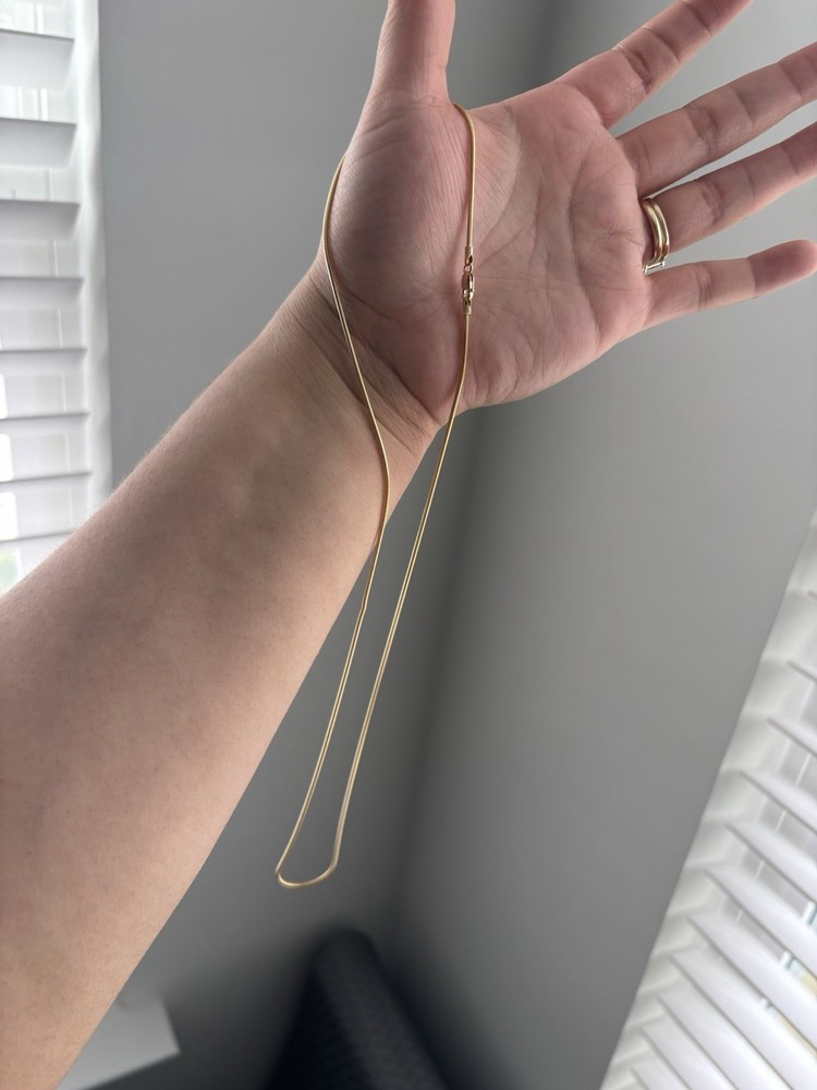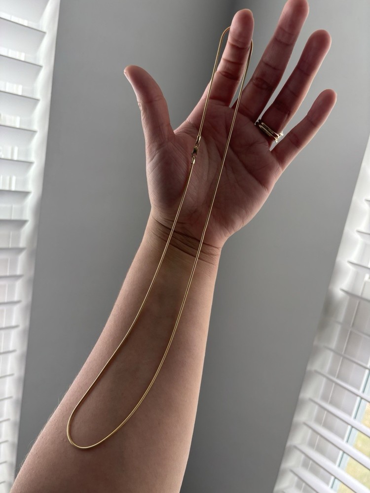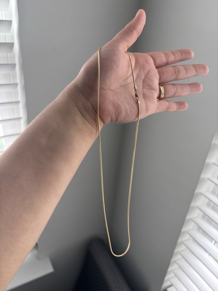 14k yellow gold snake chain. 1.5mm thickness, 10 grams, 24inches long. No flaws or kinks.
