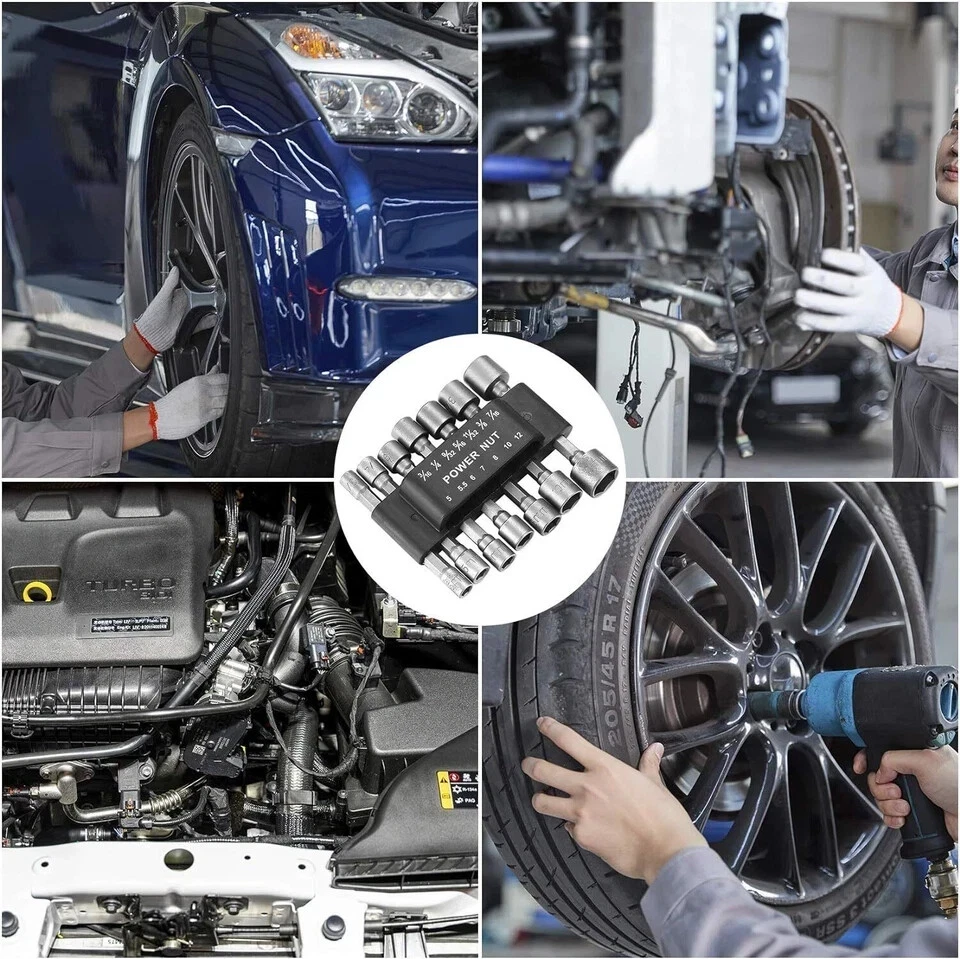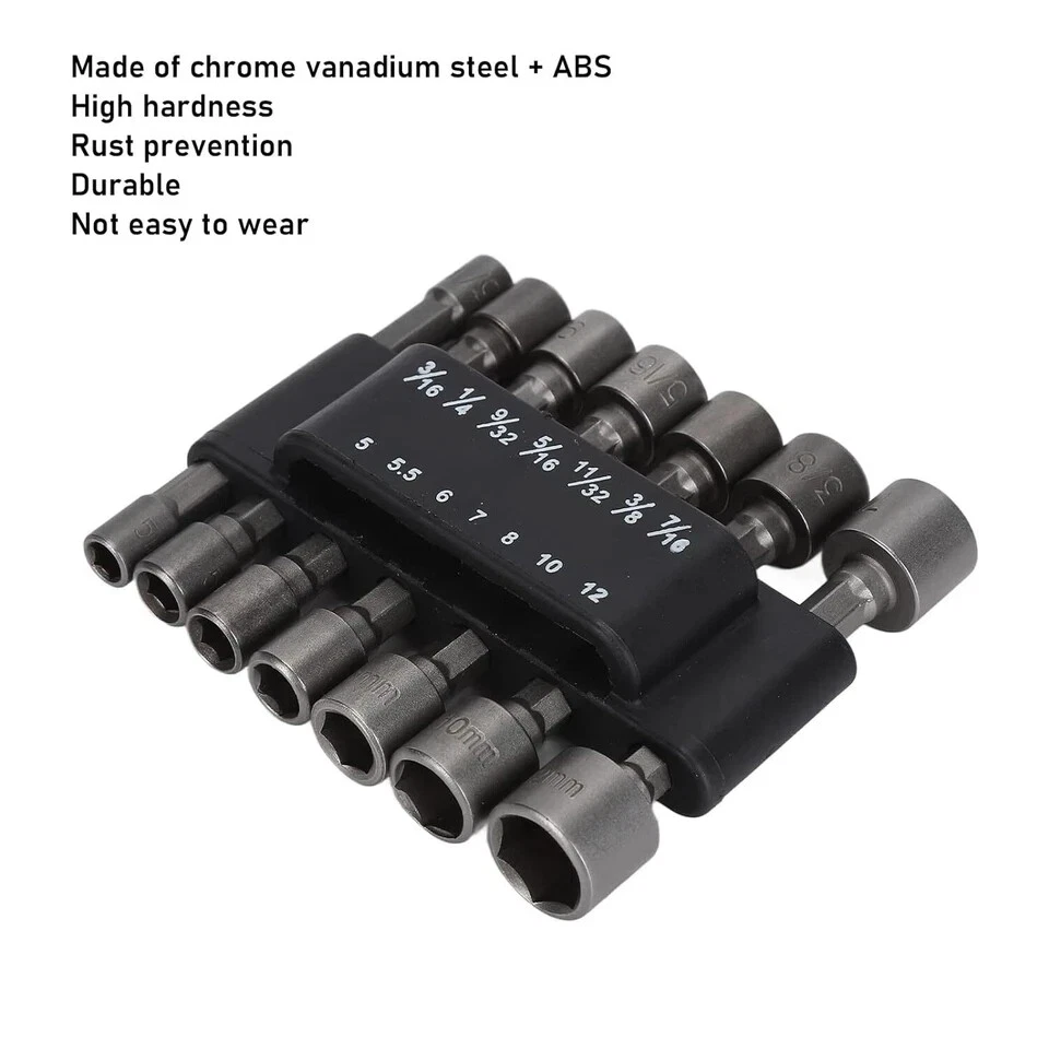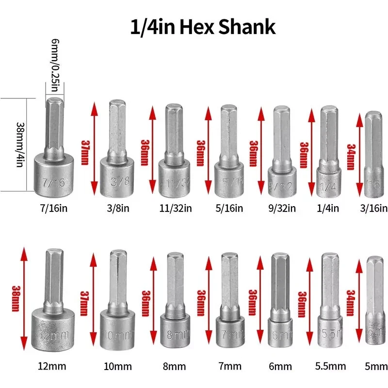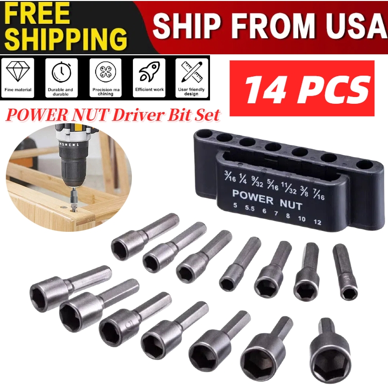 14 pc Power Nut Driver 1/4" Shank Quick Change Bit Set Includes both SAE (Inches) and Metric (MM) Bits (7 of each) Product Features: Universal 1/4 inch hex shanks fit quick-change chucks, mounted in a black clip, easy to use and storage. Streamlined anti-skid handle, comfortable grip, compact, easy to carry. Fits various shaped nuts, screws, hooks, lag screws, and bolt heads. Suitable for household DIY, woodworking, auto parts, professional machine repairing etc. Can be disassembled. All solid stainless steel column, the cylinder is made of high hardness chrome vanadium steel, high strength, durable. This set of screwdriver bits shank tools fits most powered corded or cordless drills to drive hex head screws. Can be used directly in the drill or with optional magnetic 1/4" quick change adapters. Product description: Material: Chrome Vanadium Steel ( CR-V) Shank Type: Hex Shank 7Pcs SAE Sizes : 3/16", 1/4", 9/32", 5/16", 11/32", 3/8", 7/16" 7Pcs Metric Sizes : 5 , 5.5 , 6 , 7 , 8 , 10 ,12/ mm Quantity: 14pcs/set Color: As the Picture Shown Weight: 224g Package Includes: 1 x 14 Pcs Nut Driver Set Socket Adapters