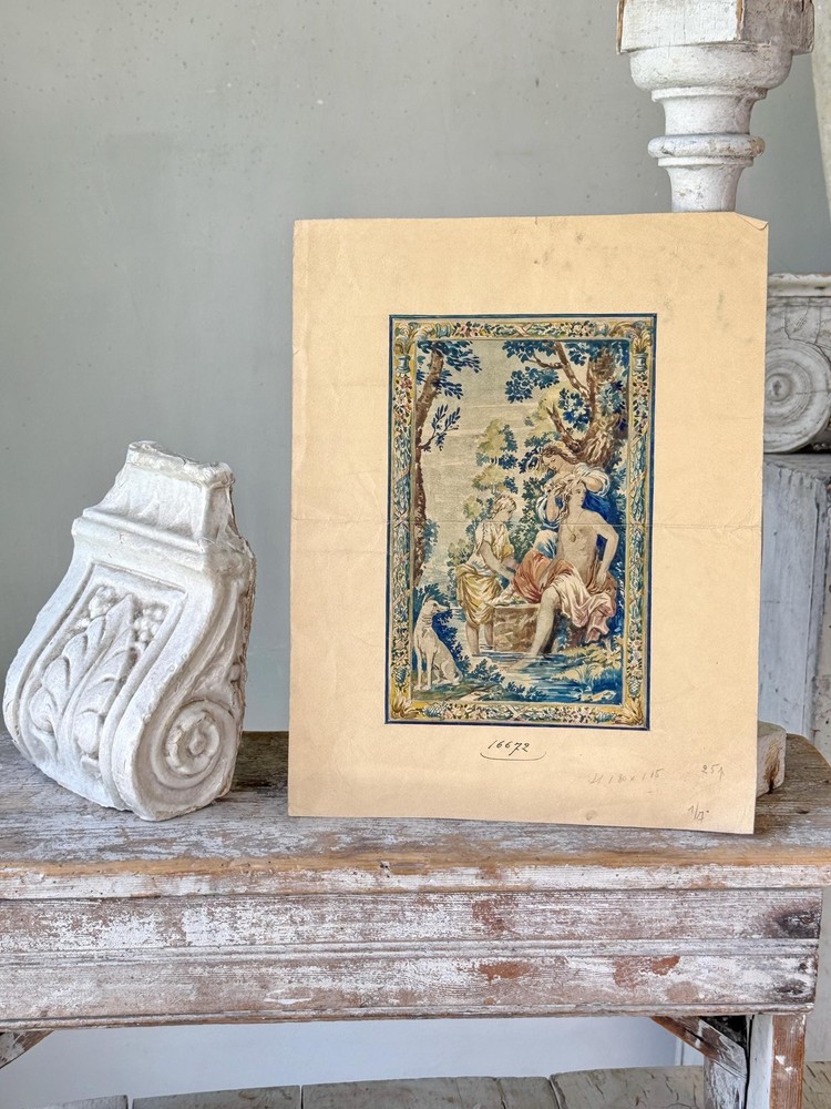 Welcome to The Textile Trunk ~ Thank you for over 25 wonderful years of helping bring these beautiful antique textiles and decorative items to life again! This piece is part of a rare collection of original French gouaches and textile design drawings I was so fortunate to acquire in France. Many of them are stylistically attributable to the Aubusson tradition, one is attributed to Aubusson though the group as a whole reflects a broad scope of European design influences. Some have stamps or markings, and others (like this one) speak for themselves with the delicacy of their brushwork and the pastoral beauty they capture. Some names and marks—including Italian design house Pietro Lauro, and others with White, Allom & Co., London, a well-known firm of decorators and historic interior designers. The presence of different stamps and numbering systems, as well as archival notations, suggests that these designs were originally produced by multiple ateliers, and later gathered into a single collection, likely during the early to mid-20th century when these historic works were preserved and reused for design reference and reproduction. I purchased from a dealer who had purchased from another dealer that had purchased them at auction. You will see on some a white contemporary sticker, most likely from the auction catalogue! To see all of the others in this collection, just search my store for the word drawing and they will appear! ~ ITEM SPECIFICS: Date: c.1790–1820 Origin: France Medium: Gouache on paper Style: Aubusson tapestry design Dimensions: approx. 14 x 12 inches Subject: Three bathing women in a forested setting, with a loyal white dog and an ornate floral border Condition: Some creasing, especially through the center, and light signs of age This extraordinary antique French gouache drawing likely served as a working design for a woven Aubusson tapestry. It captures a serene scene of three women at a woodland water source, one seated with drapery loosely covering her body, another tending to her hair, and a third filling a jug. A white dog watches calmly nearby, and the whole composition is enclosed by an ornate floral and latticework border. The artistry is superb, with saturated hues of coral, blue, and gold that have mellowed beautifully over time. Gouache and ink drawings like this were essential studio tools for tapestry designers and weavers in France, especially during the golden age of Aubusson production. Their artistic quality and technical clarity served as vital visual guides in translating vision to loom. These one-of-a-kind works often disappeared over time, lost in the archives of dissolved firms or simply discarded. Their rediscovery today offers a rare and beautiful link to the artistry behind French textile history. The craftsmanship and artistic designs are not just decorative but also reflect a rich textile heritage of France and Europe. Inventory: G33