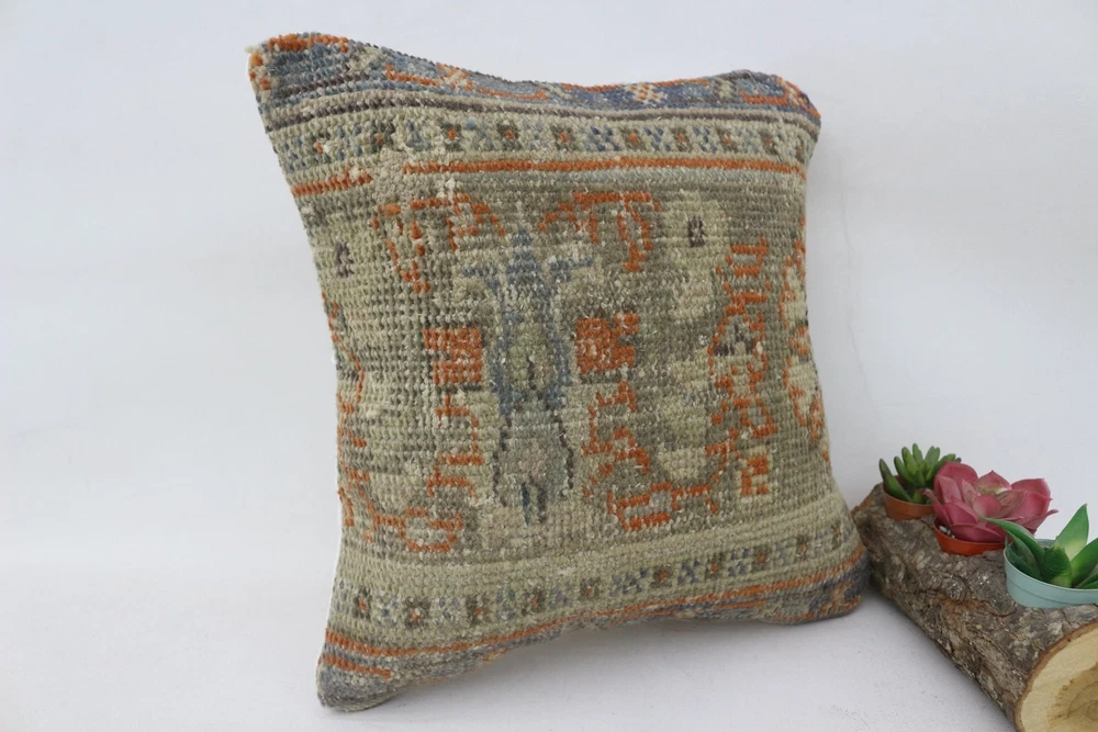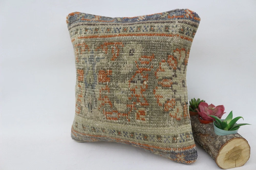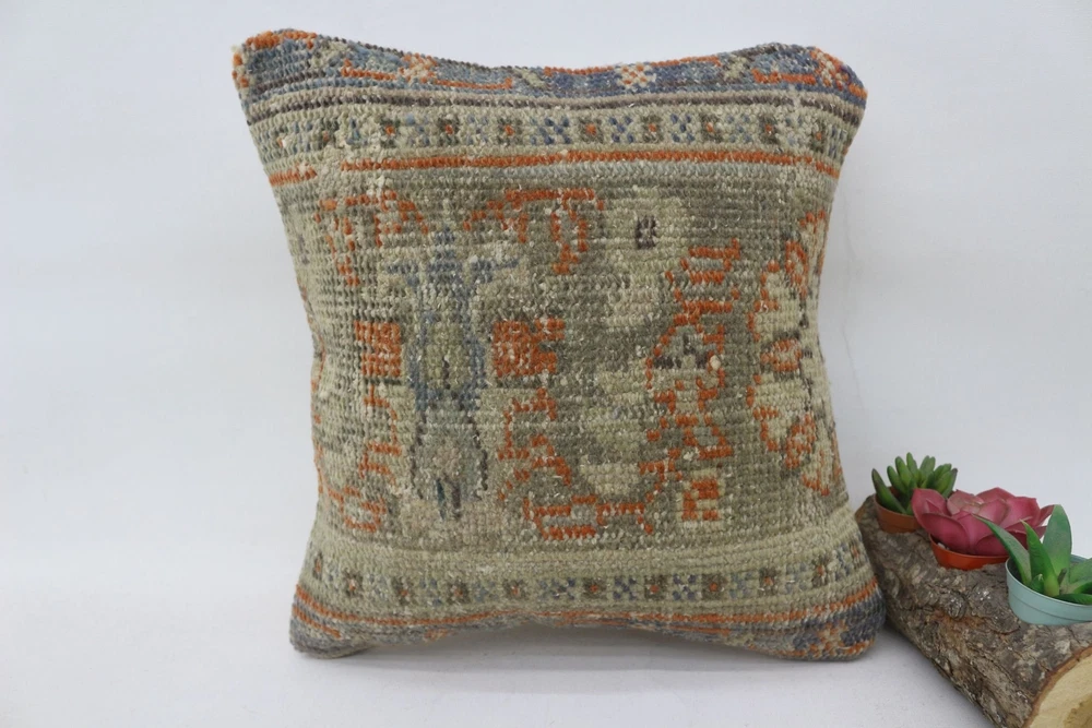 Kilim Pillow Details: All of my beautiful pillow covers or cushion cases are designed and made by me. I am making my throw pillow covers from handmade vintage rugs, Turkish rugs. Therefore, each of my vintage kilim pillowcase is one of kind. These cushions covers are piece of an art. The size of this pillow is 14 x 14 inches or 35 x 35 cm. The front side of this decorative pillow cover, cushion cover is wool on wool vintage kilim rug. The backside of this throw is high quality cotton fabric with a high quality zipper. This listing has 2 option for this handmade pillow. You can choose with insert or without insert. The listing photos is with insert in the pillowcase which is just for demonstration purpose. All of my vintage Turkish rugs have been professionally washed before I cut them as pillow case or cushion case so these kilim covers are 100 posent clean and ready to use. Due to the age and handmade nature of these vintage rugs, there might be imperfections and flaws that are not considered defects. This is a piece of a handmade vintage rug with minor signs of wear consistent with age and use that give it an antique look. You can see the condition of the rug pillow clearly in the detailed photos. I am going to ship your order of decorative pillow as soon as possible. I usually ship in the next day with DHL Express or FedEx which will deliver the kilim pillow, cushion cover just in 3-5 business days. It is my responsible until you receive pillow cover or pillow cover with insert at your door. If the pillow cover or insert get lost or damage during the shipping, I will ship the new kilim pillow cover or pillow insert for free as soon as possible. I take photos of my throw pillows indoor with professional camera which shows the real colors. The photos of these Turkish pillow covers are not altered. Keep in mind the colors of the rug vary slightly in different lights. Please contact to me for additional photos. I take the photos of my vintage rugs outside with daylight to show you the real and natural colors. My photos are not altered. Keep in mind the colors of the rug vary slightly in different lights. Please contact to me for additional photos. SATISFACTION GUARANTEED for your order in my shop. Your SATISFACTION is the most important to me. Please write me if you have any question or if you don't like anything from my pillow covers, cushion covers. If any reason, you are not happy from your Turkish pillow cover, I accept return without any hassle. Please read my shop policies for details. This cushion case or pillow cover can be used as decorative throw pillow, gift pillow, Christmas pillow case, bedding pillow, lumbar pillow, sofa pillow, bohemian pillow, boho pillow. You can find in any kind of Turkish kilim pillow cover in different design such as striped pillow, embroidered pillow, and geometric pillow.