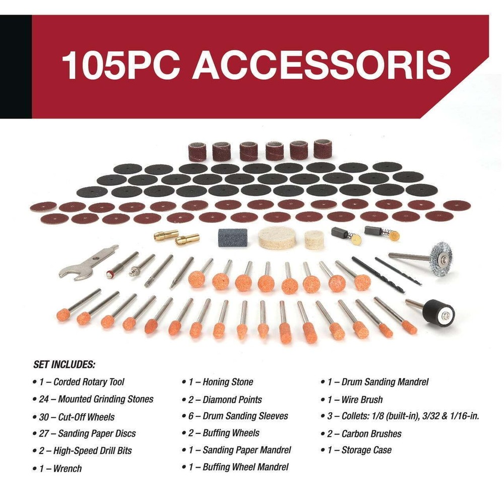 You may also like Cordless Mini Rotary Tool 117 Accessories Variable Speed Adjustable LED Light US 46.15 USD 48.58 USD Free shipping 5% off Power Rotary Tool Mini Saw Attachment Quick Connect Accurate Cuts Easy Install 37.99 USD 39.99 USD Free shipping 5% off Efficiently tackle a wide range of jobs with the 1.5 AMP Corded Rotary Tool, 120 V, Variable Speed with 105 Rotary Accessories & Storage Case. This all-encompassing kit includes a corded rotary tool with one-hundred-and-five accessories such as grinding stones with shank, cut-off wheels, sanding paper discs, high-speed drill bits, wrench, whetstone, diamond points, sanding bands and felt wheels. With all these pieces you can complete precision cutting, grinding, polishing, sharpening and drilling. It also comes with sanding paper mandrel, felt wheel mandrel, sanding drum, wire brush, copper collets, and carbon brushes all in the convenient carry storage case! The high-speed rotary tool emits an impressive speed of 8,000-35,000 RPM with three collet sizes for easy changing and a 6-ft cord for sufficient reach. 1.5 AMP Corded Rotary Tool, Variable Speed with 105 Rotary Accessories & Storage Case Accessories include twenty-four grinding stones with shank, thirty cut off wheels, twenty-seven sanding paper discs and two high speed drill bits. Provides one wrench, one whetstone, two diamond points, six sanding bands, two felt wheels, one sanding paper mandrel, one felt wheel mandrel and one sanding drum. Offers one wire brush, three copper collets for easy changing, two carbon brushes and a convenient carrying storage case that doesn’t take up much storage space. 6 foot cord for great reach Great for any job including repairs, crafts or DIY home improvement projects Includes 106 pieces with a high performance rotary tool up to 8,000 – 35,000 RPM speed with 105 accessories Multi-use kit for precision cutting, grinding, polishing, sharpening and drilling tasks 120 V You may also like Large Plastic Storage Bin Stackable Nesting Garage Organizer Durable Handles New 17.39 USD 18.31 USD Free shipping 5% off Silent Analog Alarm Clock Battery Operated Night Light Simple Small Decor New 19.0 USD 20.0 USD Free shipping 5% off New Festive Holiday Print Stackable Design Plastic Storage Tote Bin W/ Lid 25.77 USD 27.13 USD Free shipping 5% off Gel Memory Foam Pillow Dual Firmness Neck Pain Relief Travel Bag Eye Mask New 35.32 USD 37.18 USD Free shipping 5% off Battery Operated Digital Alarm Clock W/ Night Light & Temperature Display New 21.93 USD 23.08 USD Free shipping 5% off Storage Ottoman Stool Footrest Upholstered Sherpa Fabric Dark Walnut Finish New 98.79 USD 103.99 USD Free shipping 5% off Full-Length Rectangular Gold Mirror Wall Door Mountable Hanging Mirror Decor New 12.24 USD 12.88 USD Free shipping 5% off Complete Nutrition Dry Dog Food Chicken Rice Flavor Adult All Breeds 46lb Kibble 29.27 USD 30.81 USD Free shipping 5% off Theater Style Popcorn Popper Machine Nonstick Kettle Movie Nights Parties New 106.0 USD 111.58 USD Free shipping 5% off Double Door Space Saver Cabinet Over Toilet Adjustable Shelves Louvered Doors US 82.52 USD 86.86 USD Free shipping 5% off Washable Gel Memory Foam Mattress Pad Queen Cooling Hypoallergenic Pillow Top US 65.17 USD 68.6 USD Free shipping 5% off Adjustable Seat Kids Ride-on Scooter Steel Frame Easy Glide Wheels Ages 1-3 New 53.33 USD 56.14 USD Free shipping 5% off