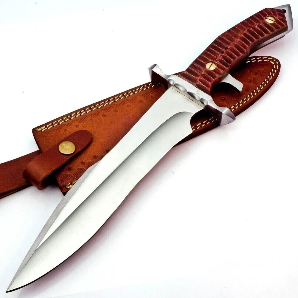 15 Full Tang Custom Handmade D2 Steel Hunting Bowie Knife Survival Knife I have added several pictures to show you the beauty of this knife with excellent craftsmanship the quality of the knife and handle sells itself, I hope pictures do the justice and sure you will love to have this knife . Important Information Our knives are handmade you will receive the same knife as shown in the photos a slight difference can be there in color and patterns because these are handmade items, and we use natural material. Product Details Total length = 15" inch Blade length = 9.5" inch Handle length = 5.5" inch Handle Material: Red Micarta Blade Material: = D2 steel Sharpness = It has razor sharp cutting edge Package includes = 1 knife + 1 with free leather sheath You must have knives for each task: Use knives sturdy & sharp knives for hiking, Hunting, outdoor adventures, tactics outdoor survival, daily home use bush craft knife, skinning cutting & much more. It has a perfect hand grip sharp and sharp cutting edge so you can use it nicely everywhere also beautiful shape which makes astonishing discovery knives more attractive. Tips to care knife. 1: Clean your knife with Petrol or Ethanol after use. 2: Apply oil after cleaning knife. 3: Never store knife in sheath for a long time. Precautions This tool is very sharp please use and keep it carefully. It may harm you. Age restrictions we don't sell knives to anyone who is under the age 18. when you buy knife, you confirm that your age is qualifies for this purchase and this is a legal purchase. Shipping * Once your payment is received item will be shipped within 4-5 business days unless weekend or holidays. * For international shipping we use DHL, which is very fast, traceable and need your signature on delivery. * The product you will receive within 7-8 business days after shipped the item. * Before bidding or buying items please make sure that the state, local federal laws of your area allow the item to reach you. * Before you buy any item you must know whether you will pay import duties or not if after buying an item you need to give them import duties then we will not be responsible for it. * If your purchase is held custom authorities in your country or state, we will not be responsible for that, and no refund will be given. * We will not be responsible for any loss because of wrong or deliverable shipping address. Return and refund policy! If you are not happy with our items, we offer you peace of mind guarantee if you return the product within 30 working days, we will refund your money back immediately on receiving the knife back in original condition deliberate tampering with the product or misuse will not be qualify for the refund. Contact us! We can be contacted any time through eBay message and please leave feedback as soon as you the receive your order, if you have any questions, comments suggestions or product requests, we will respond to you within 24 hours and do our best help you out, we encourage our customers to contact us with any questions or concerns, we'd like to be sure you are completely satisfied with your purchase, customer satisfaction is our main goal.