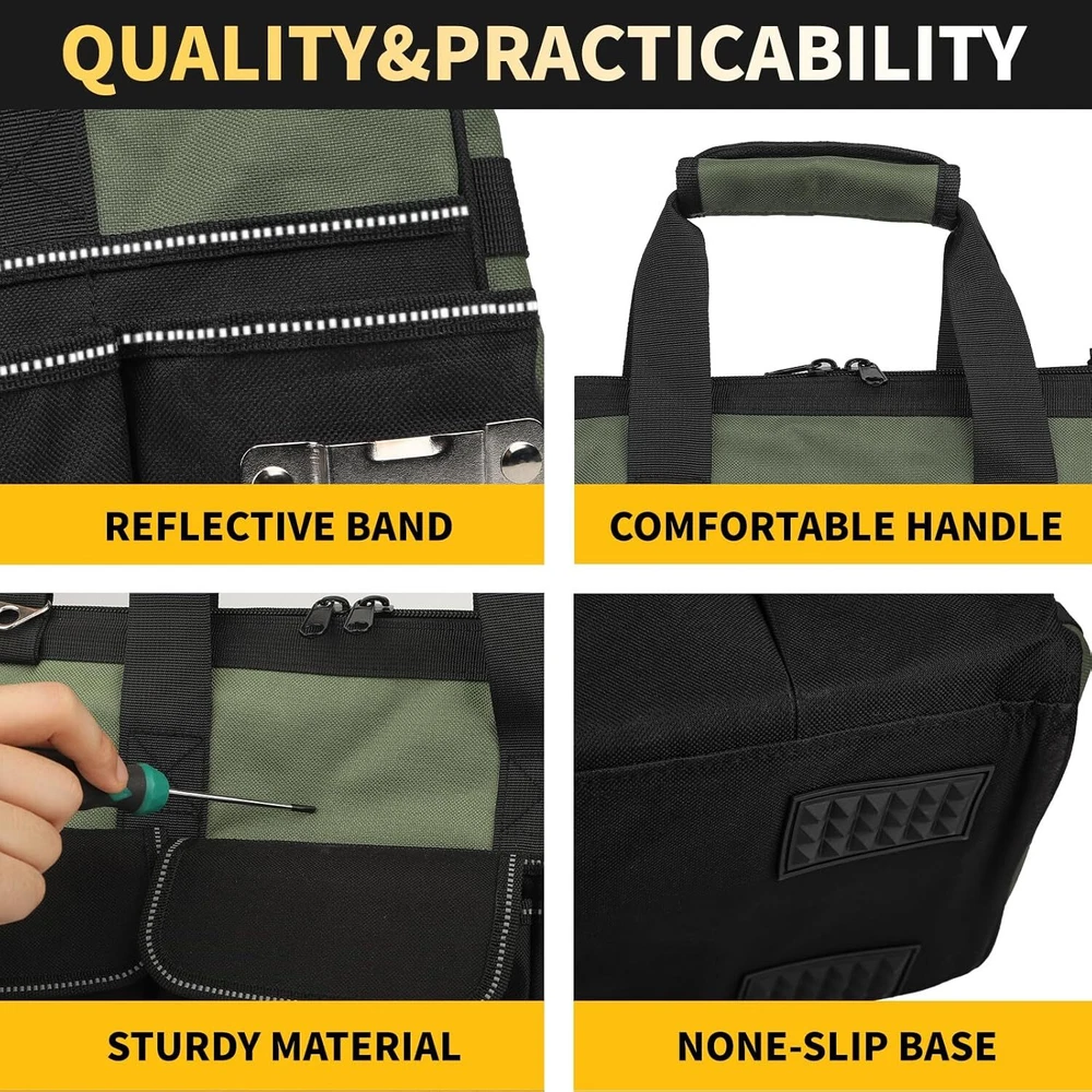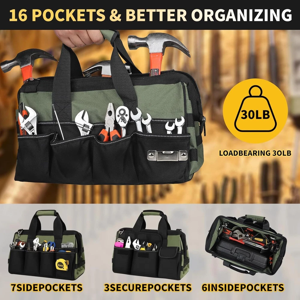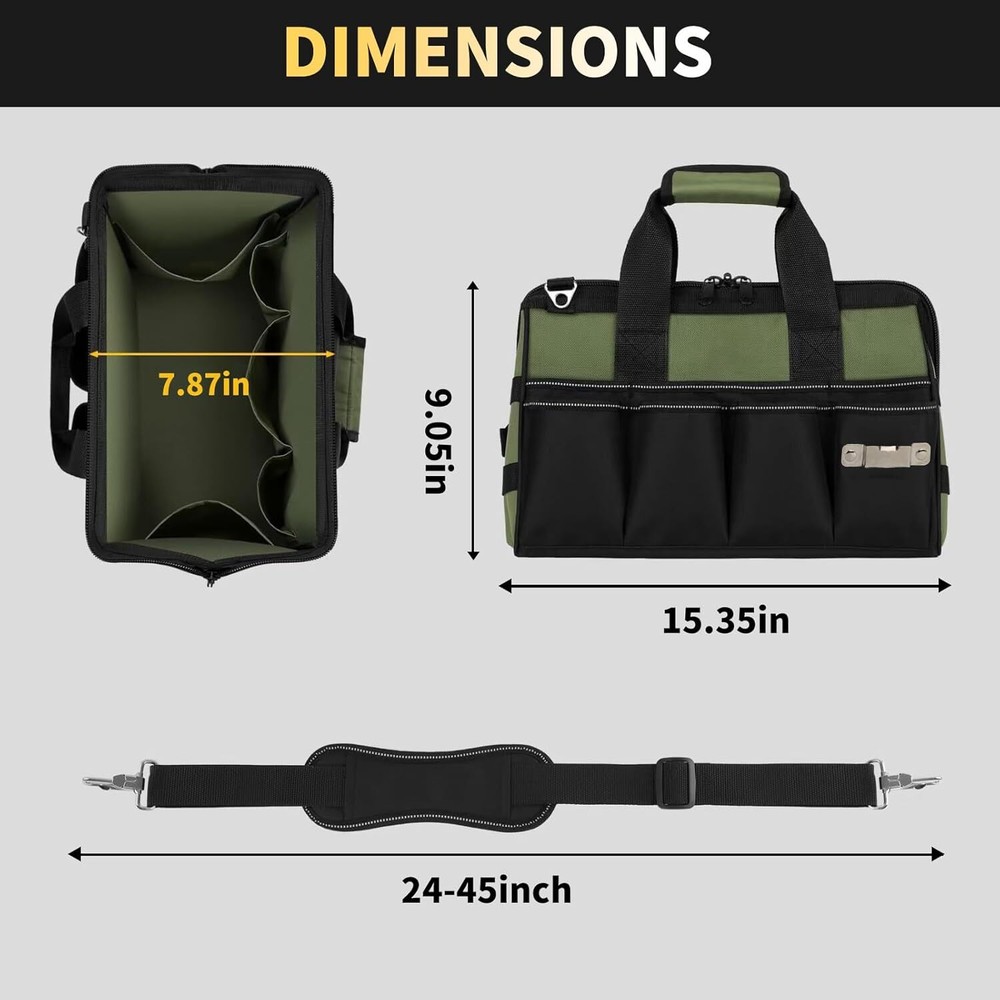 15" Heavy Duty Wide Mouth Tool Tote Bag with 25 Pockets and Soft Interior