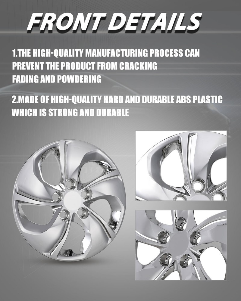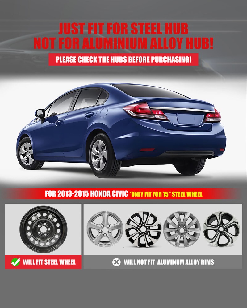 Store Categories Other Car Refrigerator Front Bumper Rear Bumper Fender Flares Inner Fenders Side Steps Running Board A-Pillar Light Mount Brackets Headlights Taillights Fog Lights LED Headlights LED Taillights LED Fog Lights Jeep Chevrolet Ford Toyota Dodge GMC Wheel Covers Features ✴ PERFECT FIT: This wheel hub cap is specifically designed to perfectly fit for 15-inch wheels, ensuring a seamless match and enhanced aesthetics. It complements the overall design of the vehicle, elevating its visual appeal. ✴ HIGH-QUALITY MATERIAL: Constructed from high-quality materials, this wheel hub cap guarantees durability and longevity. It withstands various road conditions and environmental factors encountered during daily driving, maintaining its pristine condition. ✴ EASY INSTALLATION: Installing this wheel hub cap is a breeze and requires no specialized tools or modifications. It comes with a user-friendly system, allowing for a hassle-free installation process by following the provided instructions. ✴ PROTECTIVE FUNCTION: Besides its aesthetic appeal, this wheel hub cap serves as a protective barrier for the wheels. It prevents scratches and potential damage caused by stones, debris, or other objects, safeguarding the wheel's surface. ✴ AFTER-SALES SERVICE: If There Is a Loss of Product Parts, or Any Parts of The Problem, We Can Provide After-Sales Service, Please Contact Us on The Order Page. Wheel Covers Specification ✴ Type: Hub caps ✴ Number in Pack: 4 ✴ Color: Chrome ✴ Material: ABS+PC ✴ Compatible Wheel Diameter: 15 in ✴ Finish: Glossy ✴ Installation Type: Bolt On ✴ Model: For 2013-2015 Honda Civic/For 2006-2011 Honda Civic Wheel Covers Package ✴ 1 Set of 4 Hub caps and 4 retention rings <img src="https://ti2.auctiva.com/web/aswCredit.gif" border="0"><br><a href="https://pages.ebay.com/seller-center/listing/listing-advanced-sellers/third-party-listing-tools.html#auctiva" target="_blank"><img src="https://ti2.auctiva.com/images/sc1line1.gif" border="0"></a> Payment Delivery details Terms of sales About us Contact us Payment We accept PayPal, credit card , Apple Pay & Google Pay etc. Delivery details All items will be shipped within 1-3 business days after payment received, we will try our best to ship out as soon as we can, hope for your understanding. Please double confirm your address and contact information, which will help the delivery faster and more accurately. Note :buyers who purchase international products need to pay import tariffs!!! Terms of sales Professional installation is highly recommended. Any problem of the item please feel free to contact us first , please D o Not leave negative feedback before that, or simply return it within 60 Days in original condition. We will resolve it for you ASAP. About us Any questions please do not hesitate to contact us directly by eBay message . We will reply you within 24 hours asap, thanks for your understanding. Contact us Should you have any problem or require any further information please feel free to contact us . If you are satisfied with our product and service, please kindly leave us a positive feedback. Popular Categories On May 29, 2025 at 02:11:44 PDT, seller added the following information: