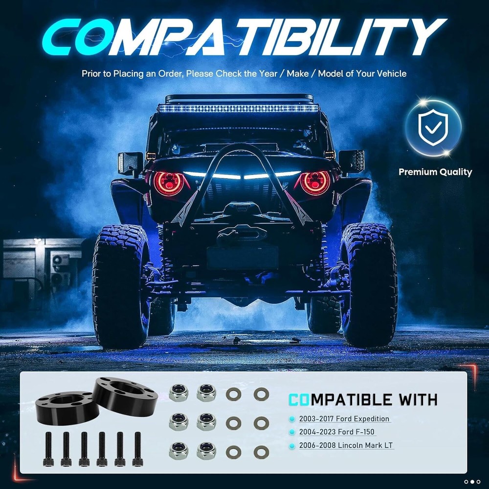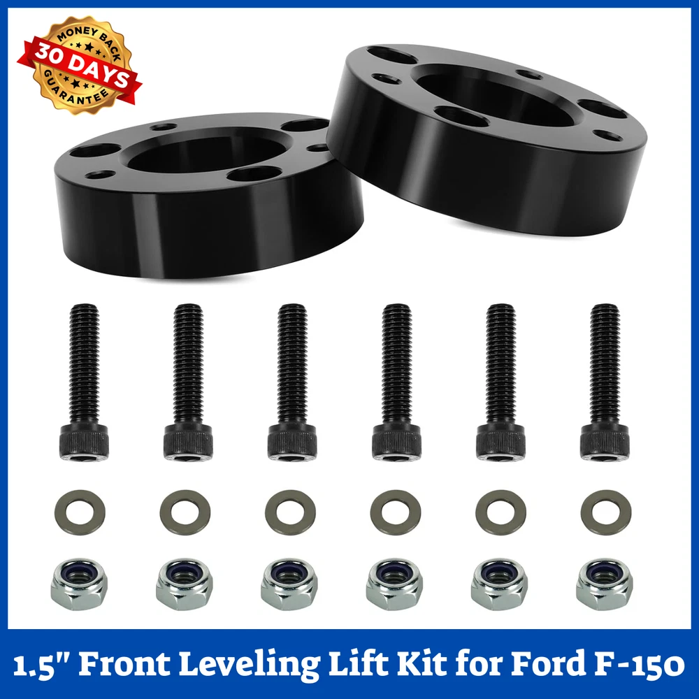 1.5" Front Leveling Lift Kit Compatible with 2003-2017 Ford Expedition, 2004-2023 F150, Raised by 1.5 Inch Front Suspension Strut Spacers for 2006-2008 Lincoln Mark LT, Set of 2 We offer 1-5 Days Free shipping & 30-Days Free returns Vehicle Compatibility: Compatible with 2003-2017 Ford Expedition; 2004-2023 Ford F-150; 2006-2008 Lincoln Mark LT. Lift 1.5 Inch: Please note that the Front Leveling Lift Kit's thickness is less than 1.5 inch because of suspension geometry. The ratio between lift height and kit thickness is not 1:1, but it will lift the truck to a true height of 1.5 inch. An alignment is always recommended after installing. Various Benefits: The Leveling Lift Kit will give a noticeably aggressive look to your vehicle, increases additional fender clearance and provides more tires alternative, allowing larger tires and wheels. Premium Material: ILONPA's Suspension Leveling Kit is forged from 6061-T6 aluminum alloy, CNC automatic processing, surface anodic oxidation and heat treatment, which not only ensures high precision and stability, but also enhances the hardness and corrosion resistance of the material. Easy Installation: No cutting or drilling needed, and you could complete installation with 1-2 hours. Note that you have to make sure to get an alignment when you are done. We offer 1-5 Days Free shipping & 30-Days Free returns