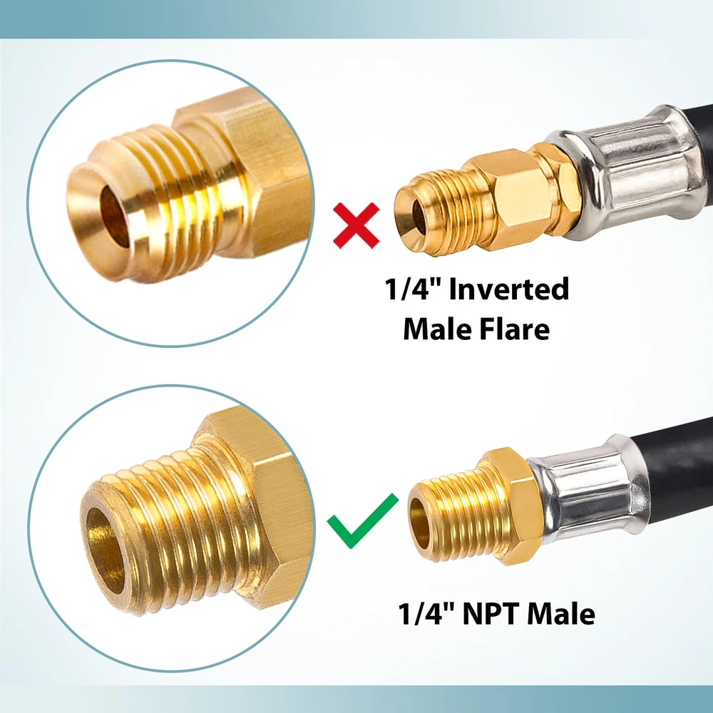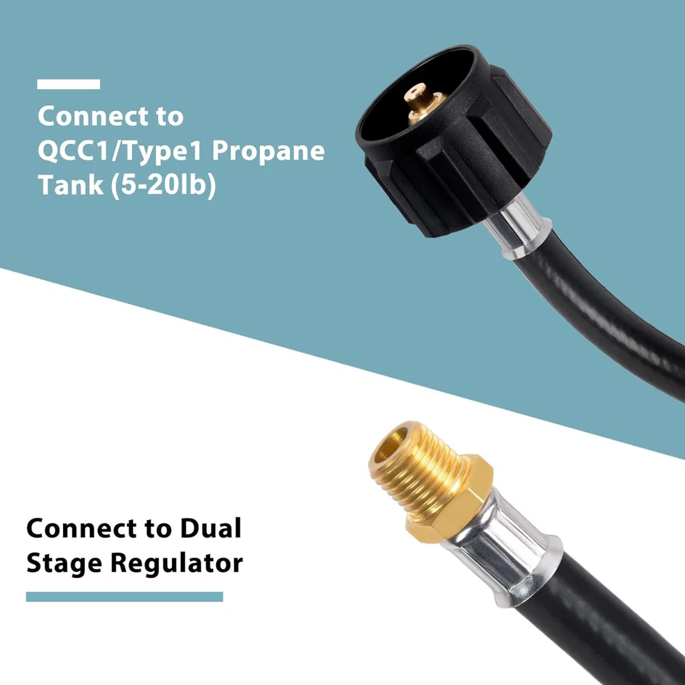 Standard Connector: QCC-1 x 1/4" male NPT (NOT 1/4" inverted flare) Application: Connect your camper's 1/4" NPT inlet regulator to a 20 lb-40 lb LP propane tank High-quality Build: Made of premium rubber with high flexibility that can be easily bent and are less likely to break Easy to Install: Propane pigtail hose can be quickly and easily connected to propane tanks and RV's -stage regulators without tools Safe to Use: Solid brass with well-machined thread ensures your safe and leak-free operation. Suitable for BBQ, RV, and camping needs or having an outdoor cookout