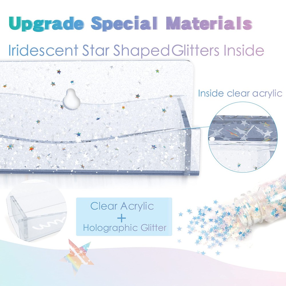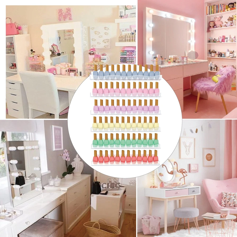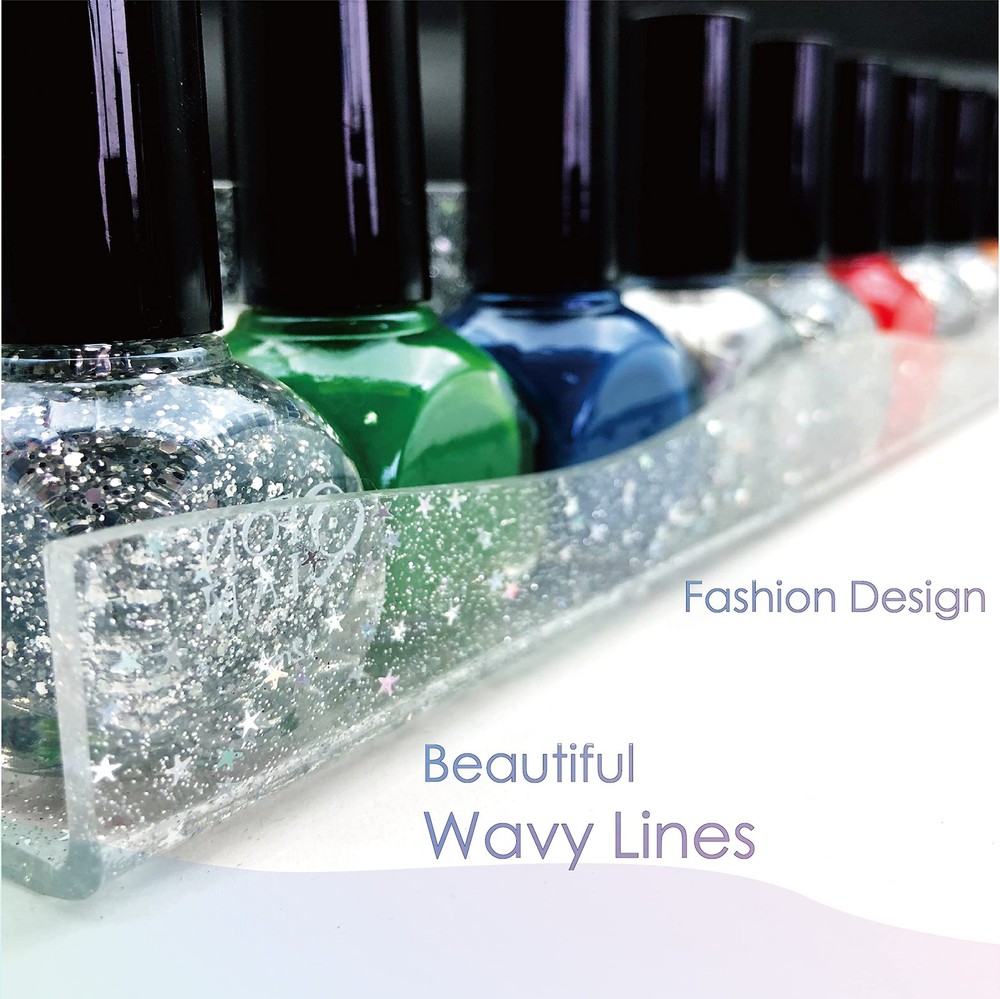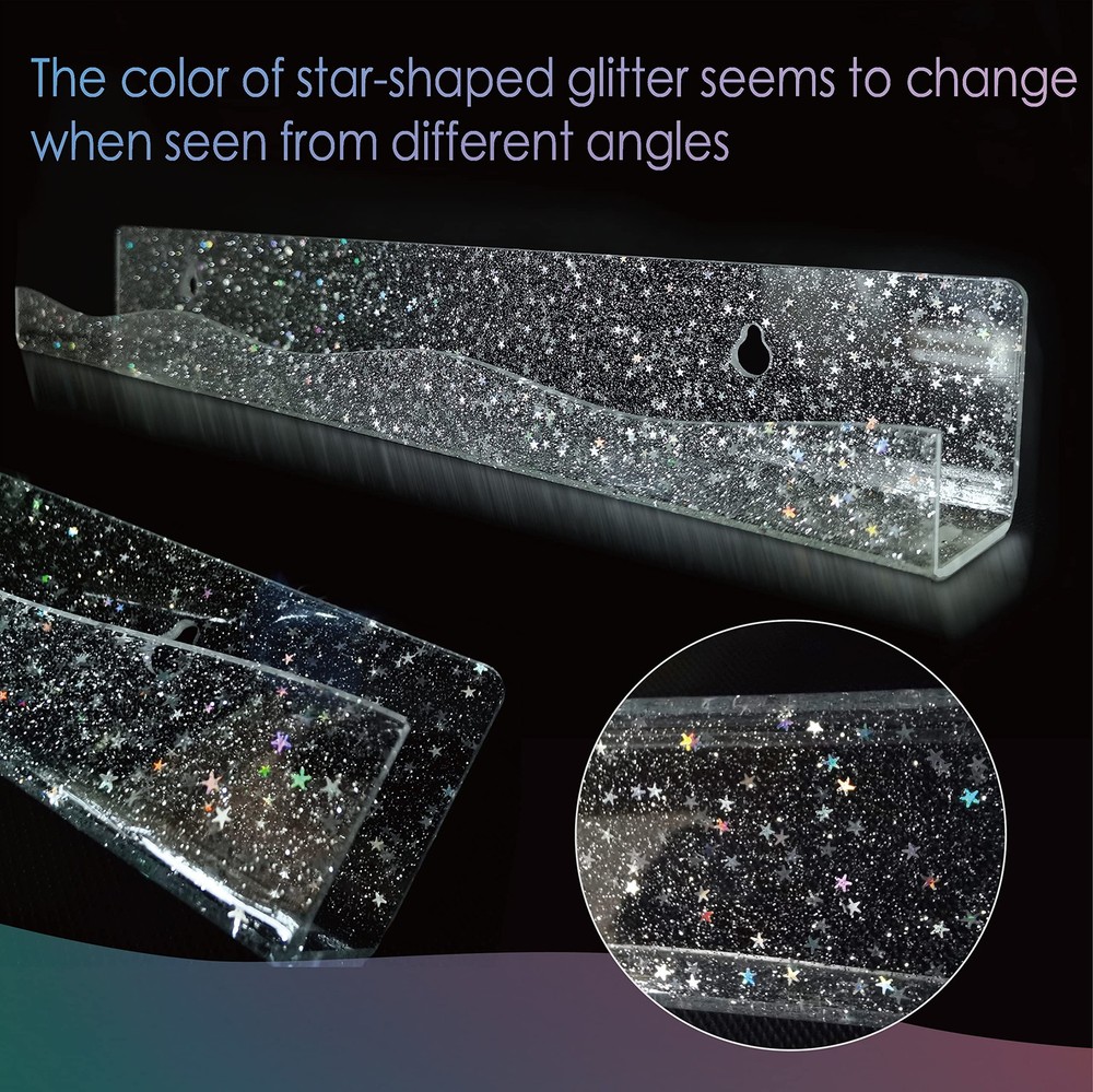 Never compromise with anything less than perfection when it comes to organize nail polish. 100% Brand New and High-Quality Product FOCUS on QUALITY and never make abates, just rebates. Made of premium acrylic, with perfect sizes and improved styling, our wall rack becomes your best helper in the Manicure when dressing up. The gorgeous color is different from every angle,adding richness and vibrancy of color in your room. Material: Clear acrylic with iridescent Star Shaped Glitters inside Item Dimensions: 15 x 2x 1.8 inches Packing : 6 pack Why to Choose Our wall rack Upgraded Fashion Material Upgraded Design Never Fall Off Easy Access Great Gift Clear acrylic nail polish rack with iridescent star-shaped glitters inside is a special process, the color of star-shaped glitter seems to change when seen from different angles,great supplies for nail techs Upgraded Design-Iridescent star shaped glitters clear acrylic rack with beautiful wavy lines,holds all kind of brand Name Bottle nail polish,make it easy to see the nail polish color you are looking for,and doesn't take up much dresser space,keeping your room neat and tidy. Nail polish organizer wall mounted has removable stoppers on both ends to keep your oil bottles standing safely on the shelf and not slipping off,Suitable for most nail polishes. Easy Access-Each 15'' nail polish rack is separated and can be mounted individually.The hanging mounting-hole for easy installation and removal. Great Gift-The modern wall-mounted organizer can solve the problem of misplacing the nail polish for girls. It is an ideal gift for girls, wives and mothers, It is also a perfect display in the bedrooms, bathrooms, salons, retailers and offices.