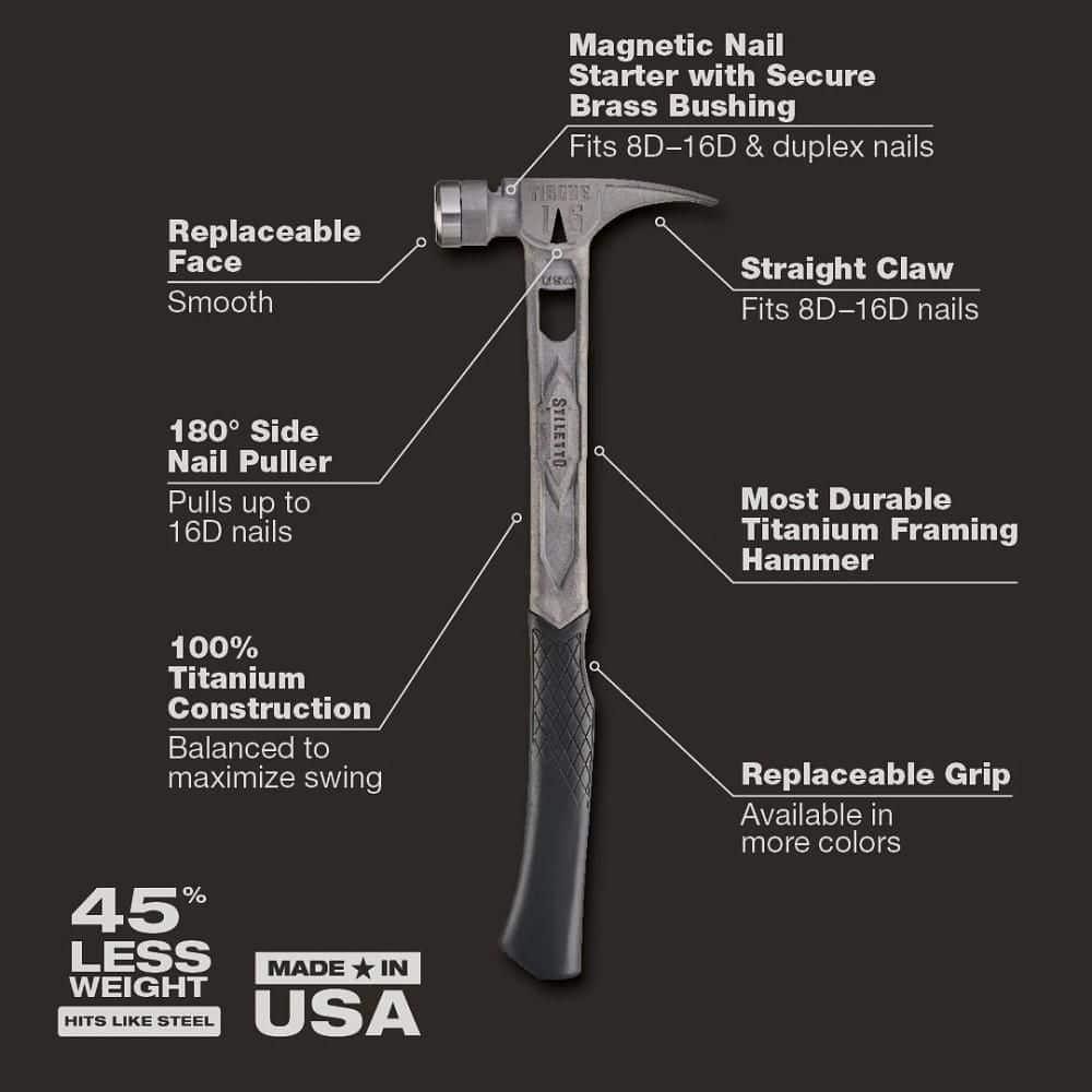 15 Oz. TiBone Smooth Face With Curved Handle Store New Arrivals Add to Saved Sellers View Feedback Contact 15 Oz. TiBone Smooth Face With Curved Handle This 14oz titanium hammer is 45% less weight and hits like steel Most powerful and most durable titanium framing hammer Replaceable steel face and multiple grip colors The STILETTO 15oz TIBONE Hammer with Smooth Steel Face and Curved Handle is Stiletto Tool's most powerful and most durable hammer. This All-Titanium hammer is 45% less weight and hits like steel. The durable TIBONE design is best for framing and pulling nails. The 180° side nail puller and Magnetic Nail Starter fit up to 16D or Duplex Nails. The TIBONE Titanium Framing Hammer features a replaceable steel face and multiple grip colors, extending the life of the hammer and providing a personal touch. Claw Type: Straight Color Family: Black Face Type: Smooth Features: Comfort Grip Hammer Type: Straight Claw Hand Tool Type: Hammer Handle Material: Comfort Grip Head Material: Titanium Head Replaceable Head: No Returnable: 90-Day Tools Product Type: Hand Tool Manufacturer Warranty: 1 Year Limited Assembled Depth (in.): 6.17 in Assembled Height (in.): 17.34 in Assembled Width (in.): 1.43 in Handle Length (in.): 18 in Weight of Head (oz.): 15 ABOUT US Customer service is our top priority! Please be sure to read the description thoroughly to make sure that this is the item you want before making a purchasing decision. If you have any questions about this item, please contact us via eBay messages before placing your order. We make every effort possible to accurately describe and depict the items. Please be aware that slight variations in color may be due to differences in lighting and computer monitor resolutions. All items are in stock at the time of listing; however, in the unlikely and unforeseen event that we are unable to fulfill your order through any of our networked warehouses, we will notify you as quickly as possible and offer you a 100% refund on your purchase. Thank you for shopping with us. We appreciate your business! SHIPPING We provide fast, free shipping. Most items are shipped within 3-5 business days of receiving cleared payment. We ship to the lower 48 contiguous United States only. We do not ship to P.O. Boxes or APOs. For select items, we ship internationally through eBays Global Shipping Program. We do ship most of our smaller items internationally using eBays Global Shipping Program. If ordering electrical items outside of the U.S., please note that they will come equipped with a standard U.S. voltage plugs. You will need a suitable adapter to use the item in your country. Certain restrictions apply. Standard or Economy Shipping is ALWAYS FREE! You will be notified via eBay messages as soon as your items ship. Special Notice for Freight Items: If an item ships via Freight (Truck) Delivery, a valid phone number will be required so that we can contact you to schedule delivery. The item may be delivered with curbside delivery. An adult signature will be required. Please be sure to have available help on hand to assist you with moving the item to the desired location in or outside of your home. Freight items must be inspected upon delivery. In the unlikely event that damage is observed, you MUST refuse delivery and note the damage on the shipping receipt and send it back via the Freight carrier. Returns will not be accepted on Freight items after they have been delivered, inspected, and the driver has left the premises. RETURNS When returning an item, it must be in all of the original packaging and include all of the original accessories or items that came with it. The item and package should be in original and perfect condition. You will be required to cover shipping on the return of non-defective items. All returns MUST be done within 30 days of date of purchase. Please note that we cannot give refunds or replacements after the 30 day limit has expired. When sending in a return, please note that it can take up to 7 business days for the return to be processed. We do our best to process as quickly as possible. We are extremely fair, and in the rare event of something out of the ordinary happening with our products or shipping, we will gladly work with you to find a fair resolution. PAYMENT We accept all of the standard payment options offered at eBay checkout. To provide a safe experience, eBay only allow payment methods that offer strong protection for buyers and sellers. Your order will be processed pending receipt of cleared payment. Sales tax may be charged depending on your location. DISCLAIMER We are sorry, but we do not honor product exchange requests. If you need to exchange an item received, you will need to go through the normal returns process identified in our returns section and then order the correct item, if it is still available. Orders are processed immediately and dispatched to fulfillment as soon as they are received. For this reason, we are typically unable to honor cancellation requests. If you need to cancel the transaction, please contact us as soon as possible and we will attempt to cancel the order. If the order has gone too far through the fulfillment process, we will be unable to cancel. In that event, you would need to wait until you receive the item and go through the normal returns process as mentioned in the returns section of our policies. Please note that electronic items are only rated for use inside the United States. If you order an electronic item for use outside the USA, that is at your own risk. If the product gets damaged or does not work, you will be liable and we will not accept a return of the item CUSTOMER SATISFACTION We try our very best to make sure every customer is completely satisfied. If there's a problem, message us! We're happy to help. © sa_713689. | All Rights Reserved