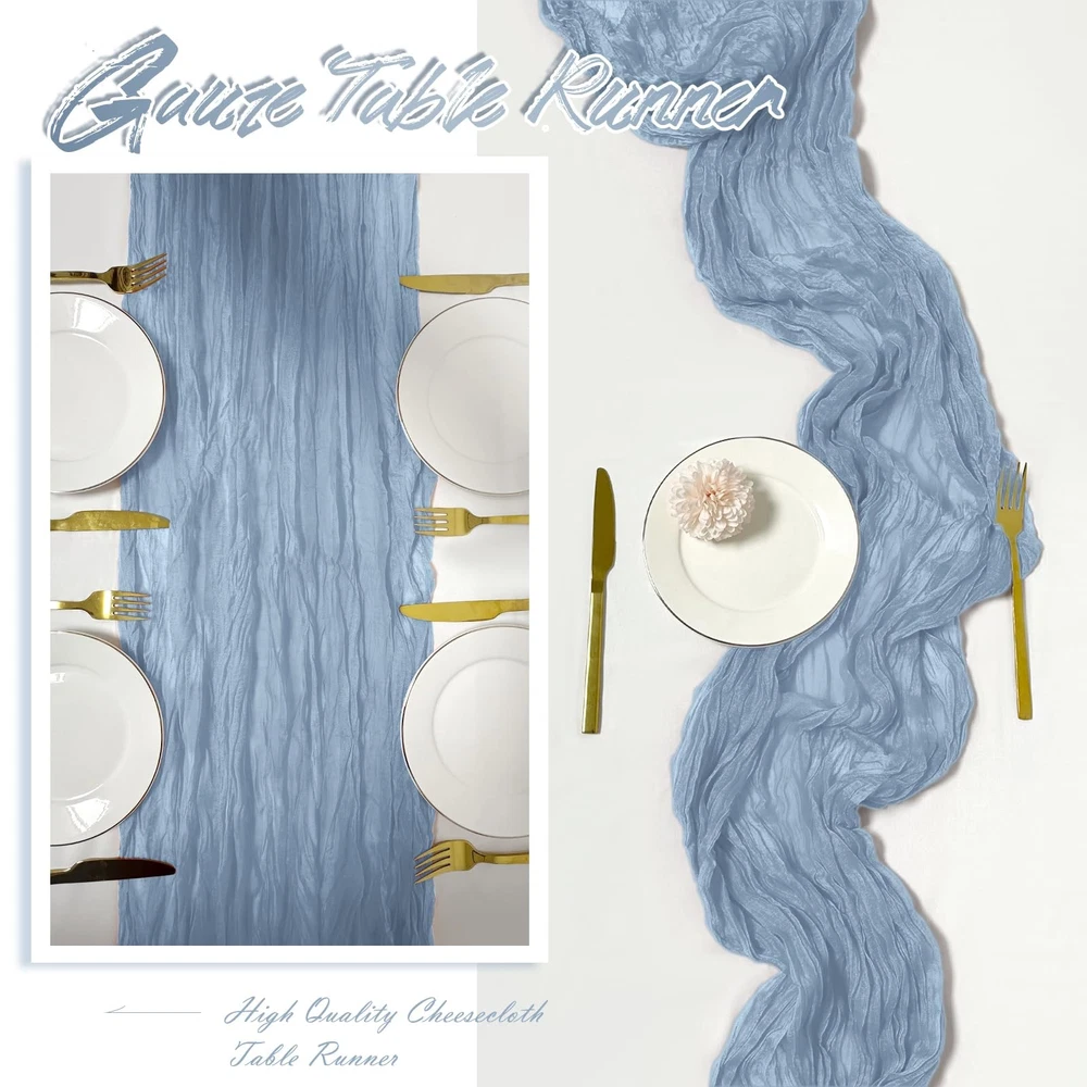 Dusty Blue Cheesecloth Table Runners Product Information Package includes: 15 packs cheesecloth table runners Color: Dusty Blue Material: High Quality Polyester Fiber Boho Rustic table runner dimensions: 17 inches*108 inches Cheese Cloth Table Runner Features: 1. Our Boho Gauze Cheese Cloth Table Runner is made of 100% high-quality gauze. The gauze table runner has beautiful pleats, exquisite craftsmanship, neat lines, and beautiful appearance. 2.Our cheesecloth table runner is very elegant. Even if placed randomly on the table, it will bring a lazy decorative aesthetic, saving you energy and patience. adding a romantic atmosphere to your wedding or special event, elegant and dreamy. 3.If it is dirty after use, you can hand wash it with a mild detergent in cold water. Please use a laundry bag if machine washing, lay flat or hang to dry. Widely Use: perfect for weddings, parties, baby showers, woodland baby showers, hunting baby showers, arch curtains, Easter, Christmas, birthdays or any other event you want to celebrate, adding a romantic touch and creating a warm party atmosphere. Tips: 1. Don’t bleach and twist it, and please don’t dry it in direct sunshine, or it maybe will fade. 2. There may be slight errors in size due to manual measurement. 3. Our table runners are all taken in kind, and the pictures have been color corrected and adjusted. However, please allow slight color differences due to different screens and light. Everything is subject to the actual product. Please forgive me. Excellent service: We always put customers' needs first and provide customers with high-quality products and good services. If you have any questions, please feel free to contact us and we will provide you with answers 24 hours a day. Whether it is consultation before purchasing,or any dissatisfaction caused by any reason after receiving the product, we will definitely solve it for you until you are satisfied. Package Included: You will get 15 pack of dusty blue cheesecloth table runners, enough to meet your daily use and replacement needs. The size of each cheese cloth table runner is about 17 x 108 inches, it's long enough to fit different size tables and chairs. A variety of colors for you to choose from, perfect for weddings and parties, adding a romantic atmosphere to your occasion Premium Material: Our cheese cloth table runners are made from premium gauze table runner and crinkle gauze fabric. The dusty blue table runner with beautiful wrinkles, soft to the touch, reusable, washable and fade-resistant. This boho gauze table runner is translucent and drapes naturally, perfectly and elegantly placed on a table or hung from the floor Perfect Looking: This rectangular natural pleated table runner has a rustic elegant look and is lightweight and easy to store. Cheesecloth table runner are an easy way to add texture to your table decor. These cheesecloth table runners pair well with flowers or a variety of plants to add a touch of romance and elegance to your event Widely Use: These romantic table runners have a rustic yet elegant look that is suitable for most occasions. It's a great choice for your home decoration and perfect for weddings, parties, arches, tables, birthday backdrops, Christmas, baby showers, etc. Add a romantic touch to your event and create a warm party atmosphere Notes: The vintage wedding table runners are recommended for machine washable in a laundry bag or hand wash in cold water. Do not bleach or soak for too long, which is better for maintaining the long-term use of these cheesecloth table runner. Due to manual measurement, please allow slight deviation in product size