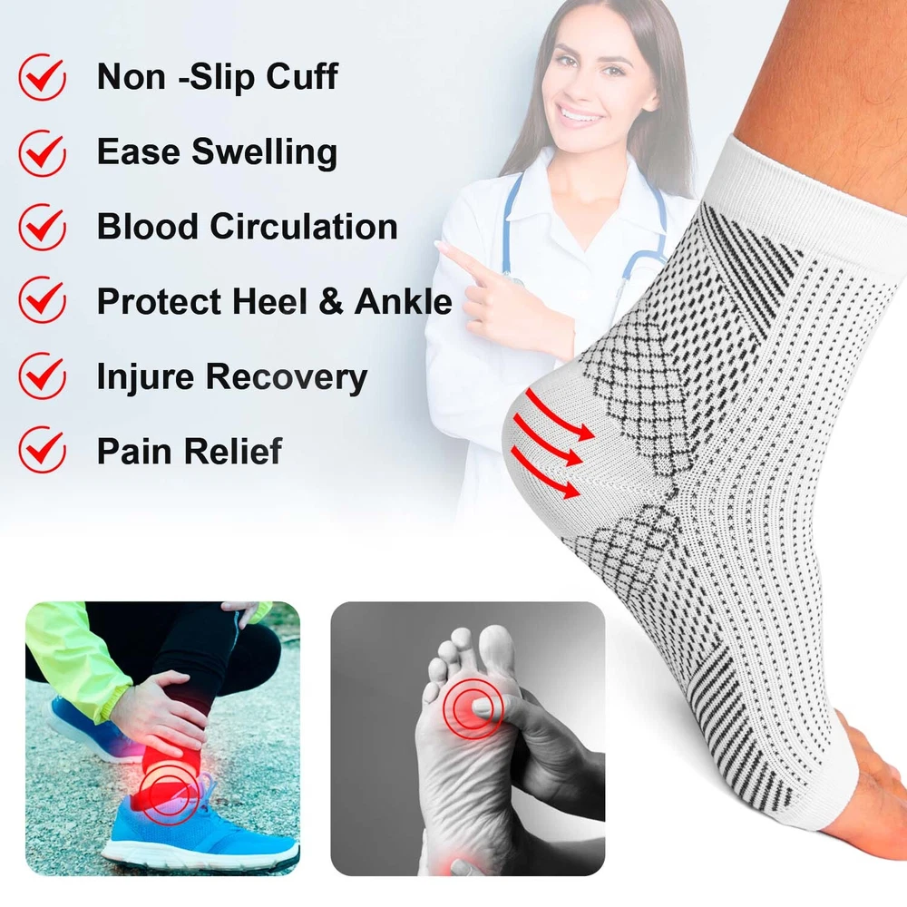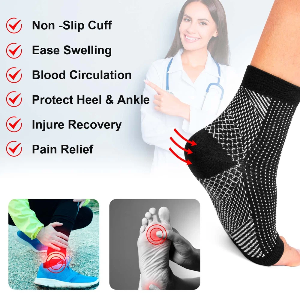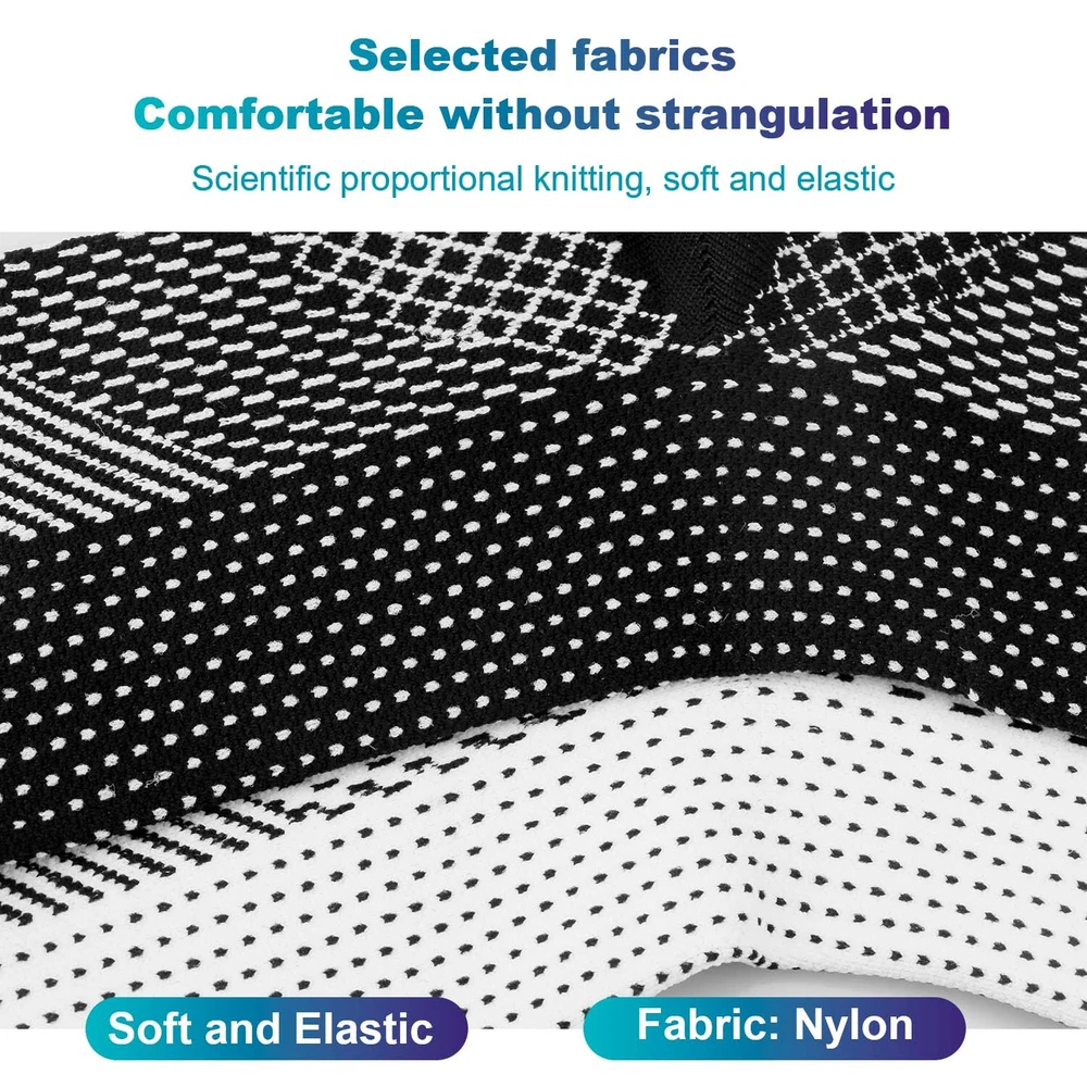 Features 【Foot Pain Relief】 The elastic core of our plantar fasciitis socks applies pressure gradient pressure to the foot muscles,that to promote blood circulation,and helps to relieve flat foot pain,plantar fasciitis pain. 【Heel Arch Support & Ankle Brace】 Unique arch elevation design and thick heel ankle design provide targeted compression, and arch ankle support, stabilize your plantar fascia ligament; encryption texture precision weaving process, increase elasticity and endurance to your feet.The compression arch support sleeves have accelerates blood return under balanced pressure, reduces lactic acid accumulation, prevents muscle sprains, and relieves foot muscle fatigue. 【Lightweight and Comfortable】 Our plantar fasciitis foot socks are made of 80% nylon and 20% spandex,which can be extended to more than 55% of the original size and they are breathable and moisture wicking to provide you with the best comfort and support fit. Allows you to wear comfortably all day that alleviating your foot pain by flat feet,fasciitis,heel arch ankle. 【Suitable for All Kinds Of Sports】 Our structural characteristics of the compression foot sleeves for men and women are elastic beam, not too tight, that these compression socks for foot pain can be applied to various sports, such as: running, hiking, camping, tennis, basketball , volleyball, cycling, fitness, health massage,etc. 【 Progressive Pressurization】 compression cuffs with a compression range of 20-30 mmHg, available for your arch, heel and ankle support.Medical grade and target compression levels of these compression sleeves for foot are the ideal solution for maintaining feet pain relief and optimal performance. Specification: 1. Color: Black/White 2. Material: Nylon + Spandex 3. Suitable for men/women 4. Size: S/M/L/XL Package Includes: 1 /3/5 pair x Socks