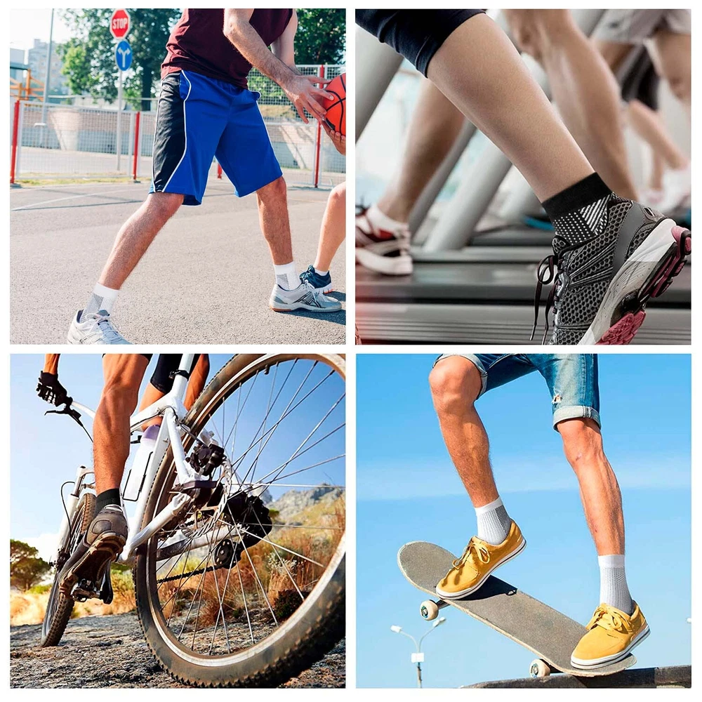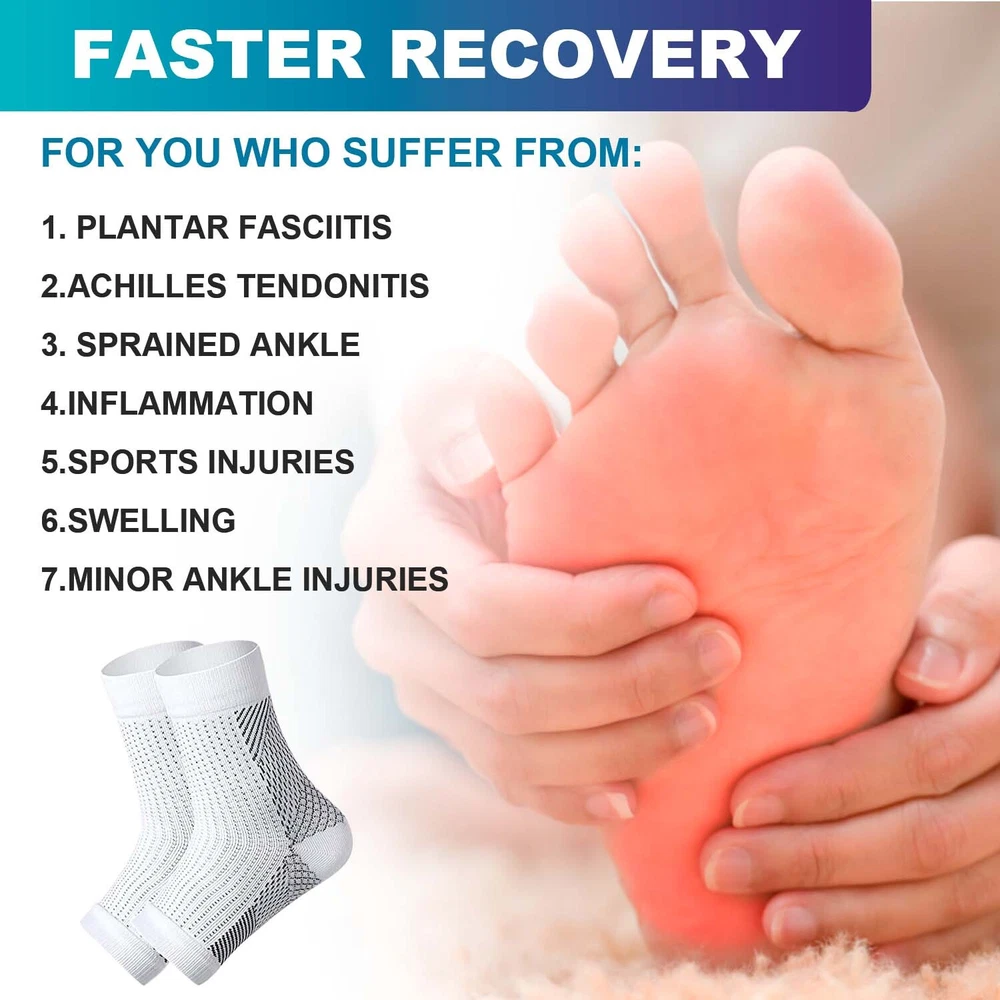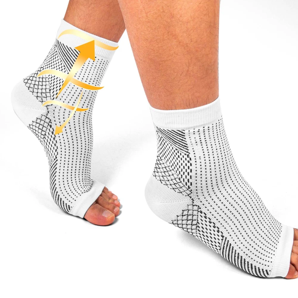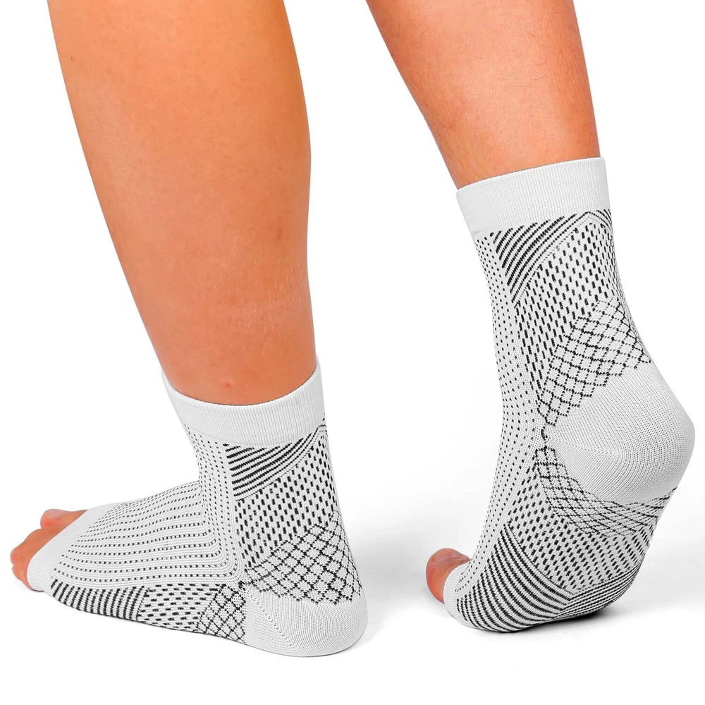 Features 【Foot Pain Relief】 The elastic core of our plantar fasciitis socks applies pressure gradient pressure to the foot muscles,that to promote blood circulation,and helps to relieve flat foot pain,plantar fasciitis pain. 【Heel Arch Support & Ankle Brace】 Unique arch elevation design and thick heel ankle design provide targeted compression, and arch ankle support, stabilize your plantar fascia ligament; encryption texture precision weaving process, increase elasticity and endurance to your feet.The compression arch support sleeves have accelerates blood return under balanced pressure, reduces lactic acid accumulation, prevents muscle sprains, and relieves foot muscle fatigue. 【Lightweight and Comfortable】 Our plantar fasciitis foot socks are made of 80% nylon and 20% spandex,which can be extended to more than 55% of the original size and they are breathable and moisture wicking to provide you with the best comfort and support fit. Allows you to wear comfortably all day that alleviating your foot pain by flat feet,fasciitis,heel arch ankle. 【Suitable for All Kinds Of Sports】 Our structural characteristics of the compression foot sleeves for men and women are elastic beam, not too tight, that these compression socks for foot pain can be applied to various sports, such as: running, hiking, camping, tennis, basketball , volleyball, cycling, fitness, health massage,etc. 【 Progressive Pressurization】 compression cuffs with a compression range of 20-30 mmHg, available for your arch, heel and ankle support.Medical grade and target compression levels of these compression sleeves for foot are the ideal solution for maintaining feet pain relief and optimal performance. Specification: 1. Color: Black/White 2. Material: Nylon + Spandex 3. Suitable for men/women 4. Size: S/M/L/XL Package Includes: 1 /3/5 pair x Socks