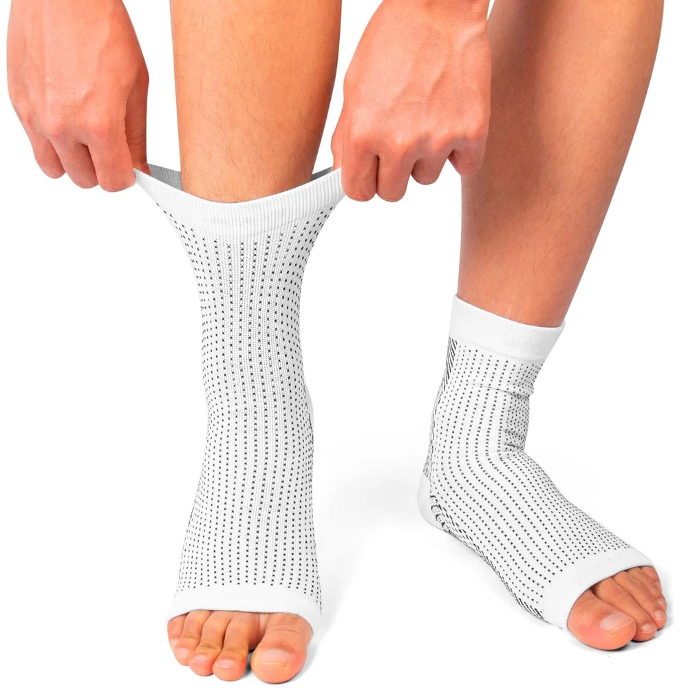 Body Area: Ankle, foot Brand: Donwell Color: Black/White Country of Origin: China Size: S/M/L/XL Features: Adjustable, Ankle Support, Reducing swelling, Improving circulation, Reducing pain from plantar fasciitis MPN: Does Not Apply Material: Nylon, Polyester Department: Adult, Men, Teens, Unisex, Women, Youth Model: Compression Sleeve Theme: Vintage Type: Compression Sleeve Labels & Certifications: Protect from Excessive Moisture, Store Dry Main Purpose: Arch Support, Arthritis, Bursitis, Compression, Immobilization, Plantar Fasciitis, Stabilization