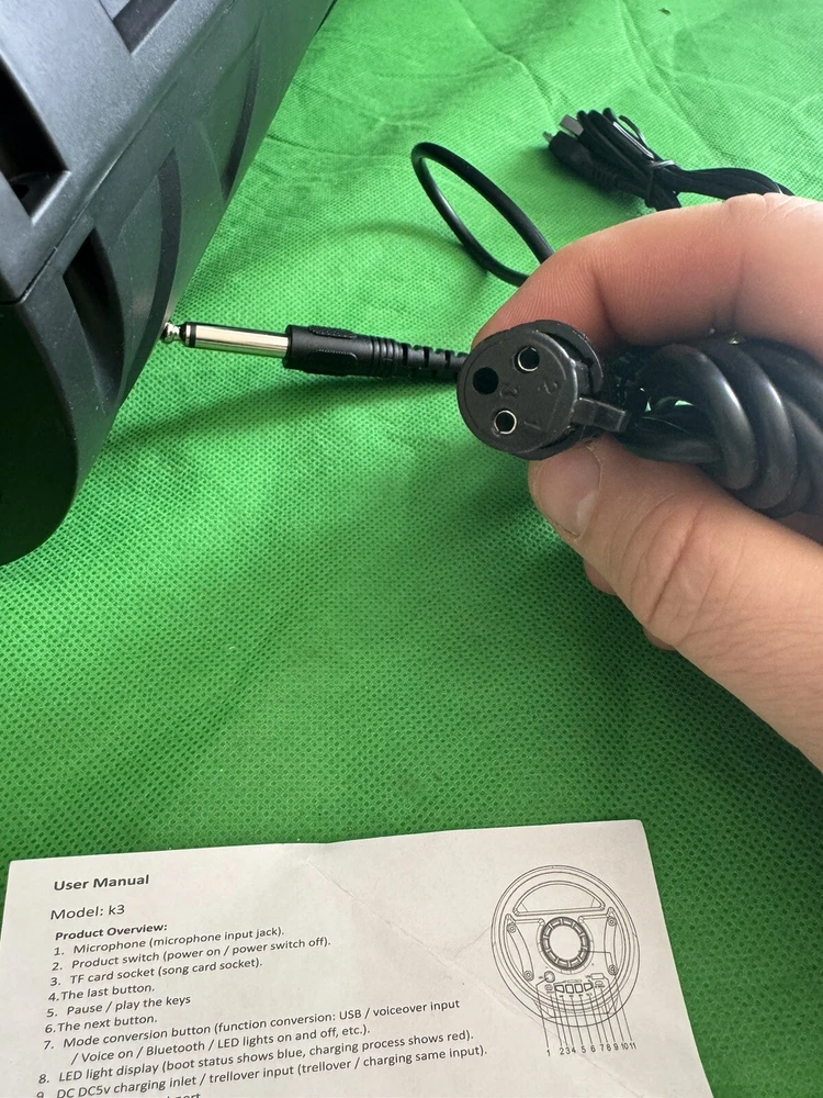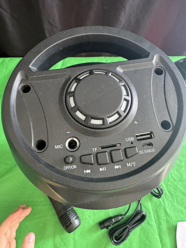 Portable Bluetooth Speaker with Microphone - 15” Height (New, Open Box) • Condition: Brand new, only opened to verify contents and take pictures. • Features: • Bluetooth connectivity for wireless audio streaming. • Multiple input options: USB, TF card, AUX, and FM radio. • Dual speakers with colorful LED lights. • Built-in rechargeable battery for portability. • Includes wired microphone for karaoke or announcements. • Compact and lightweight design with a convenient carry handle. • Specifications: • Model: K3 • Height: 15 inches • Connectivity: Bluetooth (10m range), USB, TF card, AUX, FM radio. • Accessories: Wired microphone, charging cable. This speaker is perfect for parties, outdoor events, or home use. Ready to use straight out of the box! Feel free to message me for more details or offers!