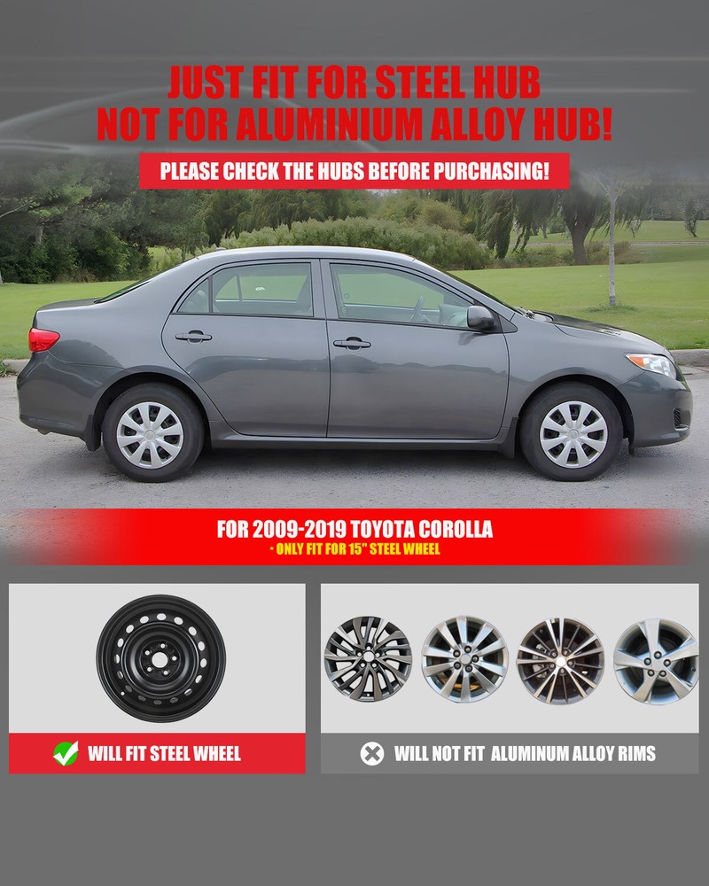 Store Categories Other Car Refrigerator Front Bumper Rear Bumper Fender Flares Inner Fenders Side Steps Running Board A-Pillar Light Mount Brackets Headlights Taillights Fog Lights LED Headlights LED Taillights LED Fog Lights Jeep Chevrolet Ford Toyota Dodge GMC Wheel Covers Features ✴ PERFECT FIT: This wheel hub cap is specifically designed to perfectly fit for 15-inch wheels, ensuring a seamless match and enhanced aesthetics. It complements the overall design of the vehicle, elevating its visual appeal. ✴ HIGH-QUALITY MATERIAL: Constructed from high-quality materials, this wheel hub cap guarantees durability and longevity. It withstands various road conditions and environmental factors encountered during daily driving, maintaining its pristine condition. ✴ EASY INSTALLATION: Installing this wheel hub cap is a breeze and requires no specialized tools or modifications. It comes with a user-friendly system, allowing for a hassle-free installation process by following the provided instructions. ✴ PROTECTIVE FUNCTION: Besides its aesthetic appeal, this wheel hub cap serves as a protective barrier for the wheels. It prevents scratches and potential damage caused by stones, debris, or other objects, safeguarding the wheel's surface. ✴ AFTER-SALES SERVICE: If There Is a Loss of Product Parts, or Any Parts of The Problem, We Can Provide After-Sales Service, Please Contact Us on The Order Page. Wheel Covers Specification ✴ Type: Hub caps ✴ Number in Pack: 4 ✴ Color: Chrome ✴ Material: ABS ✴ Compatible Wheel Diameter: 15 in ✴ Finish: Glossy ✴ Installation Type: Snap On ✴ Model: For 2009-2019 Toyota Corolla Wheel Covers Package ✴ 1 Set of 4 Hub caps and 4 retention rings Payment Delivery details Terms of sales About us Contact us Payment We accept PayPal, credit card , Apple Pay & Google Pay etc. Delivery details All items will be shipped within 1-3 business days after payment received, we will try our best to ship out as soon as we can, hope for your understanding. Please double confirm your address and contact information, which will help the delivery faster and more accurately. Note :buyers who purchase international products need to pay import tariffs!!! Terms of sales Professional installation is highly recommended. Any problem of the item please feel free to contact us first , please D o Not leave negative feedback before that, or simply return it within 60 Days in original condition. We will resolve it for you ASAP. About us Any questions please do not hesitate to contact us directly by eBay message . We will reply you within 24 hours asap, thanks for your understanding. Contact us Should you have any problem or require any further information please feel free to contact us . If you are satisfied with our product and service, please kindly leave us a positive feedback. Popular Categories On Apr 2, 2025 at 08:59:12 PDT, seller added the following information: