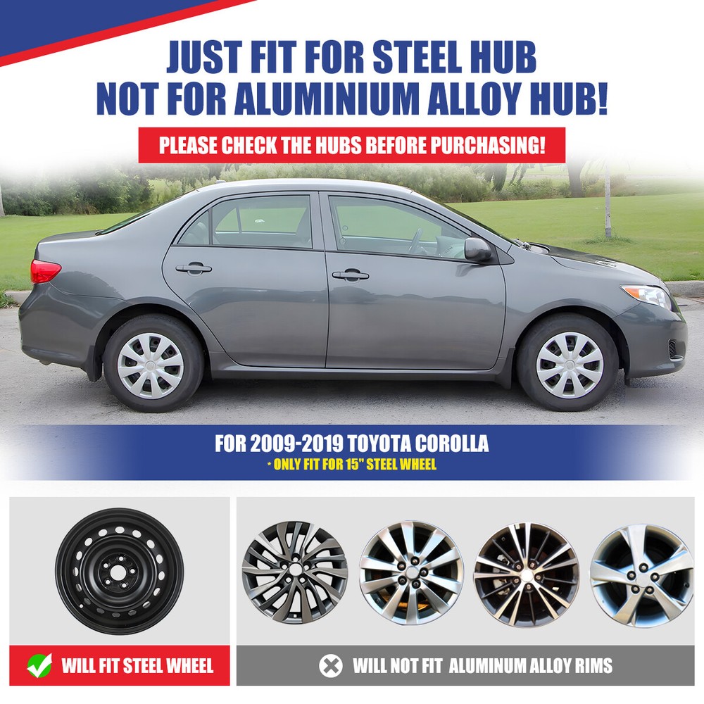 15" Set of 4 Wheel Covers Full Rim Snap On Hubcaps For 2009-2019 Toyota Corolla Feature: ✔️Please Ensure to Check your Tire/Wheel Size Before Purchase! ✔️Designed for (P15) 15” Wheels and will not fit over aluminum alloy wheels. ✔️ Easy to Install - Mount our car hub caps onto your wheels in just 10 minutes! ✔️ Customize Your Ride - No need for a total overhaul to enhance your car's look! Conveniently replace run-down, aging or rusty car hubcaps with a stunning rim cover. ✔️Designed from OEM Replica Style Wheels– For Replacement with Fast & Easy Snap-on Installation - Made from Premium ABS Material – Lab & Road Tested for Performance and Ultimate Durability. ✔️Adjustable Retention Rings assures Firm Grip Gives Support to the Hubcaps Making Sure They Stay in Place. Locate the Curve on the Retention Ring and Match to the Tire Air Valve to Install. Specification: Fits either LH (Driver Side) or RH (Passenger Side) Rear and Front Type: Wheel Hub Caps Compatible Wheel Diameter: 15 inches Features:Car Wash Safe, Easy to Install, No Tools Required Material: ABS Number in Pack: 4 Wheel Type: Steel Placement on Vehicle: Front, Left, Rear, Right Installation Type: Snap-On Fitment: For 2009-2019 Toyota Corolla Package Includes: 4* Wheel Cover Hubcaps Payment Delivery details Terms of sales About us Contact us Payment 👉 We accept PayPal (Recommended), credit card, VISA, Google Pay & Discover etc. 👉 Please submit your payment within 7 days after your purchase. 👉 If not, eBay will automatically open an Unpaid Item Dispute on our behalf if the item(s) are not paid within 7 days. Delivery details 👉 Please double check your delivery address and contact information. 👉 All items will be shipped within 1 business days after payment received. 👉 Tracking numbers will be easily accessible ASAP they are created and processed. Terms of sales 👉 Free 30 days Return, we will cover the return post fee. 👉 If a defective product was received, please do not hesitate to message us via eBay message. 👉 We will response in 24 hours in business to resolve the problem 👉 We stand behind our products. Items can be returned for exchange or full refund within 30 days from the date you receive. About us 👉 Wolfstorm has a huge warehouse and office located in the United States. 👉 All US domestic 48 states customers are able to benefit from the FREE SHIPPING services. 👉 Our experienced, professional customer service representatives offers prompt and courteous service. 👉 Best quality products, outstanding services and professional experience keep our customers. Contact us 👉 Please feel free to contact us if you have any problems. 👉 Emails will be replied within 24 hours in working days. 👉 After hours emails will be replied on the next business day. On Feb 14, 2025 at 03:06:06 PST, seller added the following information: