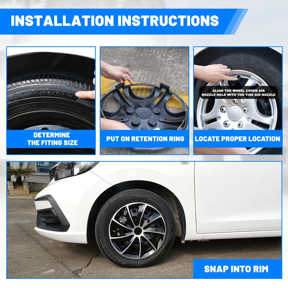 15" Set of 4 Wheel Covers Snap On Full Hub Caps fit R15 Tire & Steel Rim Feature: π Please Ensure to Check your Tire/Wheel Size Before Purchase! Designed for (P15) 15" Stock Steel Wheels and will not fit over alloy wheels π For Replacement with Fast & Easy Snap-on Installation - Made from Premium ABS Material β Lab & Road Tested for Performance and Ultimate Durability π Adjustable Retention Rings assures Firm Grip Gives Support to the Hubcaps Making Sure They Stay in Place. Locate the Curve on the Retention Ring and Match to the Tire Air Valve to Install π Installation Instructions & Video Available - Please refer to the Video and images available as well as detailed instructions below for assistance π Wolfx Wheel covers fit most models of vehicle brands including Acura, Chevrolet, Dodge, Ford, Honda, Hyundai, Kia, Mazda, Mitsubishi, Nissan, Subaru, Toyota, Volkswagen and more Specification: Quantity: 4 PCS Material: ABS Color: Matte & Black Lacquer Wheel Size: 15 inch Finish: Glossy Placement on Vehicle: Front/Left/Rear/Right Package Includes: 4* Wheel Cover Hubcaps Payment Delivery details Terms of sales About us Contact us Payment π We accept PayPal (Recommended), credit card, VISA, Google Pay & Discover etc. π Please submit your payment within 7 days after your purchase. π If not, eBay will automatically open an Unpaid Item Dispute on our behalf if the item(s) are not paid within 7 days. Delivery details π Please double check your delivery address and contact information. π All items will be shipped within 1 business days after payment received. π Tracking numbers will be easily accessible ASAP they are created and processed. Terms of sales π Free 30 days Return, we will cover the return post fee. π If a defective product was received, please do not hesitate to message us via eBay message. π We will response in 24 hours in business to resolve the problem π We stand behind our products. Items can be returned for exchange or full refund within 30 days from the date you receive. About us π Wolfstorm has a huge warehouse and office located in the United States. π All US domestic 48 states customers are able to benefit from the FREE SHIPPING services. π Our experienced, professional customer service representatives offers prompt and courteous service. π Best quality products, outstanding services and professional experience keep our customers. Contact us π Please feel free to contact us if you have any problems. π Emails will be replied within 24 hours in working days. π After hours emails will be replied on the next business day. On Dec 29, 2024 at 19:54:13 PST, seller added the following information: