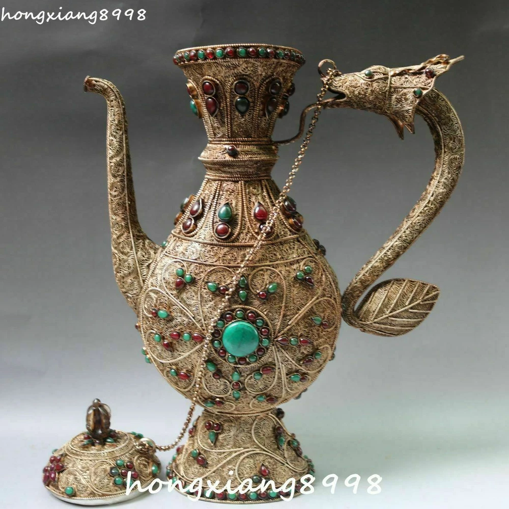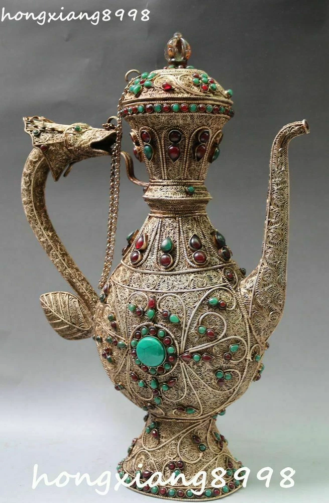 Welcome to my Ebay store: Hongxiang8998. I believe my shop can bring you enough shock and surprise. Chinese antique culture enjoy worldwide reputation because of its unique. We have always been cooperated with Chinese Museum and many of our antiques are exhibited in Chinese Museum and I have been always making efforts to find antiques for Chinese Museum. My grandfather who enjoys a good reputation in Tibet was a chief Lama in a Tibetan Buddhist Temple. We mainly sell China collections and Tibetan Buddhist products. We recommend the combine shipping ,If you won more items once that we will give you a 5 -25% discount off the shipping cost also price discount , Here the discount standard as follow : Buy 2-3 items once we can offer you the 15% discount on shipping, Buy 4-6 items once we can offer you the 20% discount on shipping, Buy 7-10 items able to get 25% discount on shipping and 5% discount on price. Over 10 items please feel free to email us request for especially price ! Here is an 15"Tibet Buddhist Silver Filigree Inlay Turquoise Gem Dragon Wine Tea Pot Flagon , As you can see the image, It is in good condition, and was created by skilled craftsmen in traditional style with fine handcrafts . This is a great piece of valuable collection, a valuable personal alter or a very good present. the handwork is very fine with incredible detailing. Don't miss out this chance to get it .Wish you good luck! Materia l: Silver Filigree Inlay Turquoise Gem Size: Height 14.9 inch .Long 10.2 inch . breadth 4.7 inch Weight: 5.2 KG----included the weight of packing materials Condition: Good condition Origin: China hipping cost by EMS / UPS / TNT / Fedex / (7-13 days):Free Paypal and bank transfer ( highly recommended ) We can accept the payment through PayPal or other way. But if you have problem on this method please contact me and If you are the final winner of this item, please pay within 7 days. However, if you are still bidding on our other items and want to combine shipping, just let us know, we will send a combined invoice to you We provide two options for shipping : DHL & EMS ( Express Mail Service) Since we get the agreement with the both shipping company. they are all fast and safe worldwide ways that easy to tracking online any time also arrive home directly. Mostly items will be using by EMS that only Very Larger items we will using by DHL. When you purchase is completed, we will immediately the customs inspection, this may take a few days time, because it is antique products, customs need to strict inspection, when we send, will immediately tell you tracking number. All the item will be packed by specialty with strong packing for shipping and High quality items for arrive to let you 100% happy. if for whatever reason you are not completely satisfied, simply cancel within 30 days of application for a full refund. the item must be in it's original condition. CONDITION OF RETURNED ITEMS: As received. ORIGINAL ARE RETURNS ALLOWED: Only if different from description or larger broken. TIMING OF RETURNS :Items can be returned within 30 days. NOTICE SELLER BEFORE RETURNING : We will trying to make your 100% Happy. RETURNED FEES: 10% 0ffered by Us. My Profile Check out my other listings View More... About Us: We guarantee 100% satisfaction on all of our auction Items. Our ultimate goal is providing 100% satisfaction to every customers, customers' repeated business and good positive feedbacks. If you do experience any problem with your items purchased from us , Kindly inform us in order to provide us a chance to resolve the unsatisfaction. So if you are not satisfied with the item you've purchased, you can contact me within 2 weeks or 10 business days after the end of auction and we will give you a full refund upon the receipt of the item. (S&H fees are not refundable). Please do not leave a negative feedback before connect me. We will strive to fulfill bidders' satisfaction. We encourage you to contact us in all cases, we always try to help our clients and ensure that you are happy with the transaction.