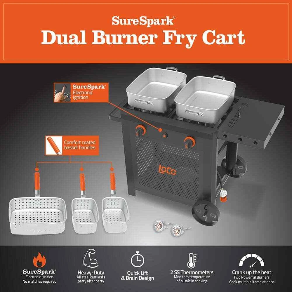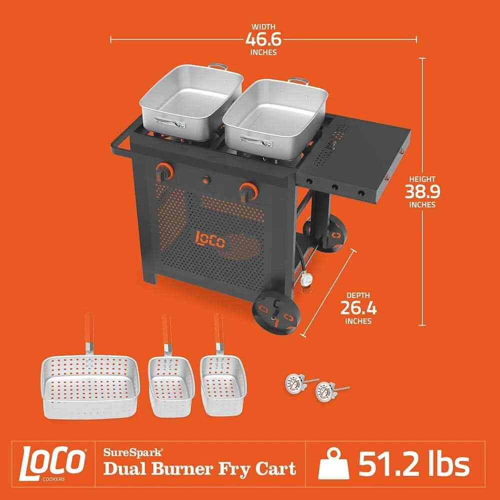 Where else can you fry a complete meal at once, Fry fish, hush puppies and French fries all at the same time in 3 separate baskets. The 2 burners can be adjusted to separate temperatures or use only 1 burner for smaller meals. Handy side shelf can be used for extra prep space or just to hold your cooking utensils. The LOCO dual burner fry cart has 3 baskets so you can cook different items at the same time using different temps. The LOCO dual burner fryer cart uses propane for fuel. Move the dual burner fry cart easily with the heavy-duty wheels. 2 adjustable high-pressure burners Folding side shelf for extra prep space Electronic ignition - no lighters or matches necessary Includes 2 fry pots, 3 fry baskets and 2 digital oil thermometers 100,000 BTUs Wash ... Home Sweet Home 15 qt. Dual Burner Fry Cart Where else can you fry a complete meal at once, Fry fish, hush puppies and French fries all at the same time in 3 separate baskets. The 2 burners can be adjusted to separate temperatures or use only 1 burner for smaller meals. Handy side shelf can be used for extra prep space or just to hold your cooking utensils. The LOCO dual burner fry cart has 3 baskets so you can cook different items at the same time using different temps. The LOCO dual burner fryer cart uses propane for fuel. Move the dual burner fry cart easily with the heavy-duty wheels. 2 adjustable high-pressure burners Folding side shelf for extra prep space Electronic ignition - no lighters or matches necessary Includes 2 fry pots, 3 fry baskets and 2 digital oil thermometers 100,000 BTUs Wash pots and baskets with warm soapy water before use Heavy-duty wheels for easy moving Propane regulator hookup Item is a fryer cart with two 15 qt. pots Color Family:Black|Color Family:Black|Grate Material:Steel|Grate Material:Steel|Grill/Smoker Fuel Type:Propane|Grill/Smoker Fuel Type:Propane|Ignition Type:Continuous Spark|Ignition Type:Continuous Spark|Includes:Heat Thermometer,Stand,Strainer Basket|Includes:Heat Thermometer,Stand,Strainer Basket|Product Weight (lb.):53.131 lb|Product Weight (lb.):53.131 lb|Returnable:90-Day|Returnable:90-Day|Total BTU (Btu):100000 Btu|Total BTU (Btu):100000 Btu|Certifications and Listings:CSA Certified|Certifications and Listings:CSA Certified|Manufacturer Warranty:1 year|Manufacturer Warranty:1 year|Fryer Size (qt.):15 qt|Fryer Size (qt.):15 qt|Product Depth (in.):26.457 in|Product Depth (in.):26.457 in|Product Height (in.):29.921 in|Product Height (in.):29.921 in|Product Width (in.):45.748 in|Product Width (in.):45.748 in Push button electronic ignition ensures easy operation Offers a heat output of 100,000 BTUs for powerful performance Features a folding side shelf to offer additional space Item Specifics Brand LOCO Type Fryer Accessories UPC 850308008457 Model LCFC2 Payment If you do not have a PayPal account, to get started and buy your first item with us is very easy. Simply click on the 'Buy It Now' button and follow the eBay checkout steps. Select PayPal as the payment method you then will be given the chance to enter your card details in to PayPal's secure checkout in order to pay for your order. Shipping 1. Normally all of parcels would be shipped within 3days(From Monday to Saturday). 2. We provide three kinds of shipping for choice. Shipping way depend on delivery address. Returns If an unit is received defective, of course we take it back or replace it. If the unit is received as expected, we must charge for our expenses if you want to send it back. We have to charge for the work of handling, retesting and restocking. Contact Us Dear buyer, Thank you for visiting my store! Our warehouses are located in many regions around the United States. According to the customer's delivery address. Use USPS/UPS/DHL logistics transportation service. Prioritize the best quality logistics solutions to transport packages. Ensure package delivery time, At the same time. Have any after-sales problems, Feel free to contact us. At your service Home Sweet Home DESCRIPTION PAYMENT SHIPPING RETURN POLICY CONTACT US Shop Category Store Home Other Hot Item REI Co-op Trailmade 2 Tent with Footprint USD 160.84 Mountain Hardwear Mineral King 3 Tent with Footprint USD 258.91 NEMO Hornet OSMO Ultralight 2P Tent USD 464.35 Marmot Superalloy 2-Person Tent USD 323.71 Co-op Cycles DRT 1.1 Mountain Bike USD 419.29 Delivery New List Item woom OFF 5 Kids' Mountain Bike USD 899.00 Co-op Cycles DRT 1.1 Mountain Bike USD 419.29 woom OFF 6 Kids' Mountain Bike USD 949.00 Holiday 65-Piece Silver 18/10-Stainless Steel Flatware Set (Service for 12) USD 157.15 CRAFTSMAN Versatrack Garage Storage System Storage Rail with 20 Piece Set Mount USD 102.58 Help & Info Payment Policy Shipping Policy Return Policy FAQ About Us 15 qt. Dual Burner Fry Cart Where else can you fry a complete meal at once, Fry fish, hush puppies and French fries all at the same time in 3 separate baskets. The 2 burners can be adjusted to separate temperatures or use only 1 burner for smaller meals. Handy side shelf can be used for extra prep space or just to hold your cooking utensils. The LOCO dual burner fry cart has 3 baskets so you can cook different items at the same time using different temps. The LOCO dual burner fryer cart uses propane for fuel. Move the dual burner fry cart easily with the heavy-duty wheels. 2 adjustable high-pressure burners Folding side shelf for extra prep space Electronic ignition - no lighters or matches necessary Includes 2 fry pots, 3 fry baskets and 2 digital oil thermometers 100,000 BTUs Wash pots and baskets with warm soapy water before use Heavy-duty wheels for easy moving Propane regulator hookup Item is a fryer cart with two 15 qt. pots Color Family:Black|Color Family:Black|Grate Material:Steel|Grate Material:Steel|Grill/Smoker Fuel Type:Propane|Grill/Smoker Fuel Type:Propane|Ignition Type:Continuous Spark|Ignition Type:Continuous Spark|Includes:Heat Thermometer,Stand,Strainer Basket|Includes:Heat Thermometer,Stand,Strainer Baske