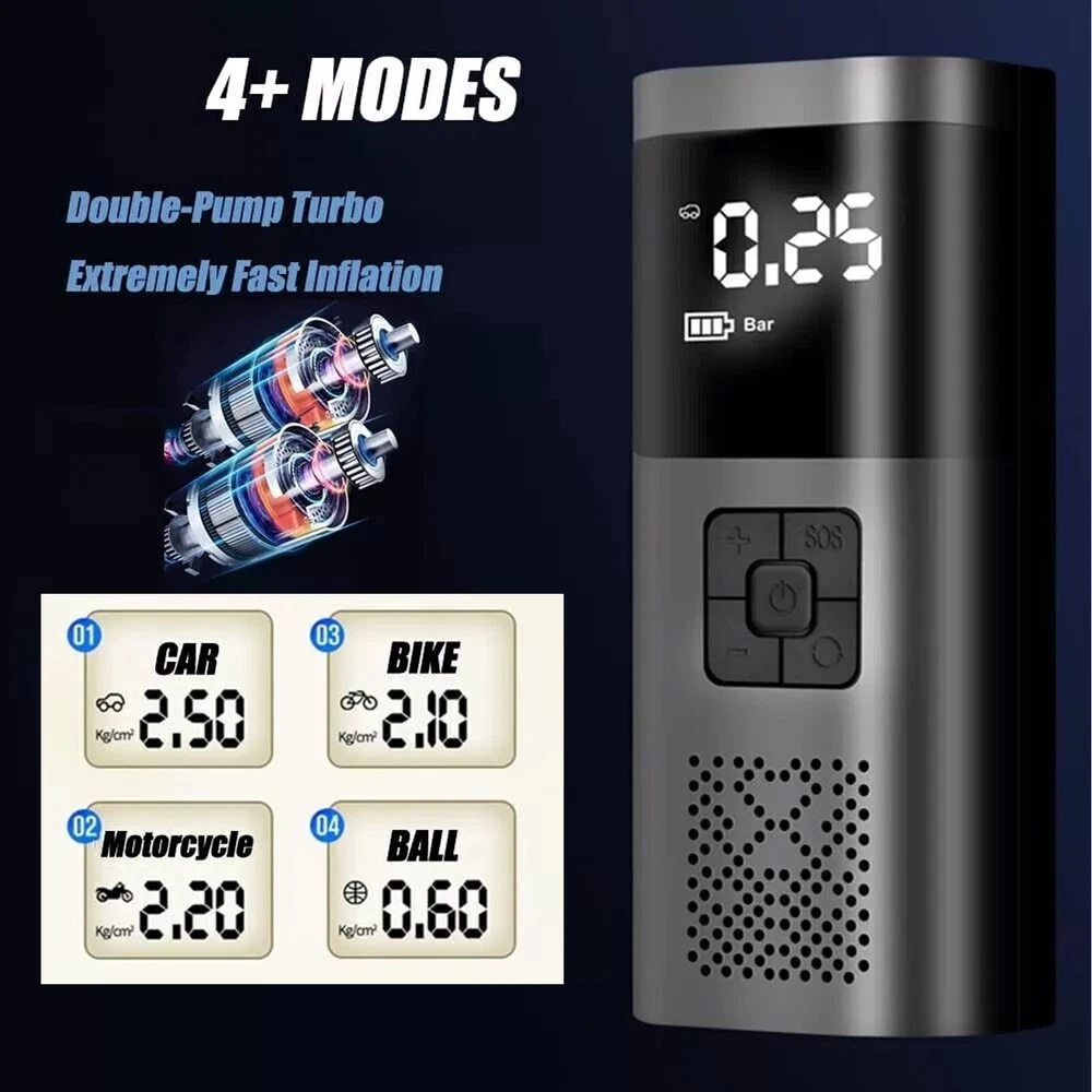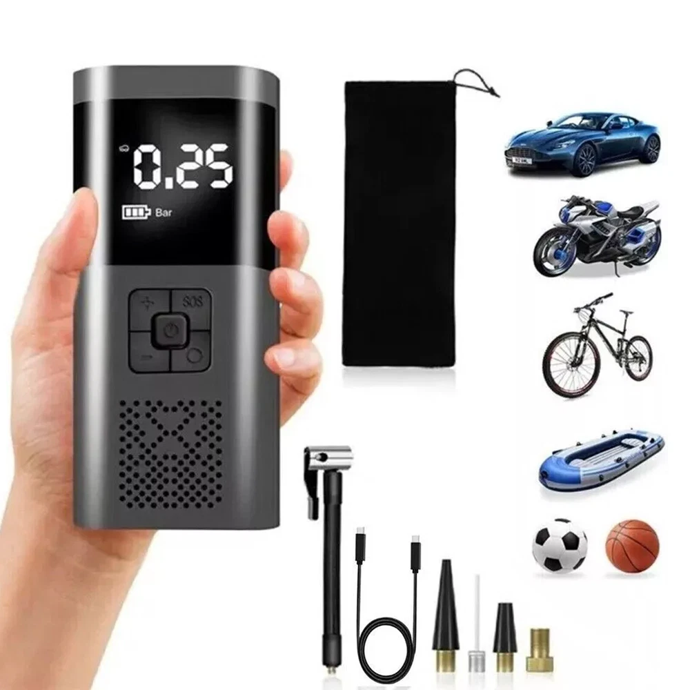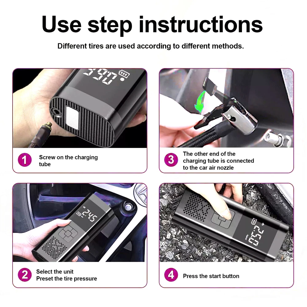 Description Features. 150PSI Smart Air Pump: This practical electric air pump mini inflator has a 150PSI maximum inflation pressure. Plug it into the 12V power outlet in your car and attach the stem to the tire valve. One simple press on the car air compressor and it will do all the work for you. 4 Inflation Modes & Power Prompt: The LCD digital display panel will display 4 kinds of air pressure units "PSI", "BAR", "KPA", "Kg/m²". The digital display panel will have icons such as motorcycles, cars, and balls for selection. The corresponding safety air pressure has been set by default for the type of product. Multipurpose Nozzles: Comes with four different aeration nozzles that can be replaced to charge bicycles, motorcycles, automobiles, air cushions, basketballs, and other products, simple and very convenient. The wired air pump is connected to the power supply through the attached car power cord. LED Lighting For Night Time: Power tire compressor has 3 LED lighting modes (Ordinary White light & Slow frequency warning light& Hazard warning light) for you to use as an outdoor lighting source. It is a helpful companion for emergency or daily use. Easy to operate: After connecting the tire valve, the current tire pressure is displayed, and the tire pressure can be monitored at any time. When the inflation reaches the preset value, the air pump will automatically stop inflation to avoid over-inflation. Portable & Easy To Carry: Portable tire pump comes with a carrying bag and a well-made mini electric tire inflator is designed to be easily stored in your car. Multipurpose Nozzles: Comes with four different aeration nozzles that can be replaced to charge bicycles, motorcycles, automobiles, air cushions, basketballs, and other products, simple and very convenient. The wired air pump is connected to the power supply through the attached car power cord. Specifications. ▪️ Name: Electric handheld inflatable pump ▪️ Material: poly carbon (pc) ▪️ Color: black ▪️ Display: LCD display ▪️ Maximum working pressure 150 PSI ▪️ Product Size: 175*75*55mm ▪️ Cylinder: 19 single cylinder ▪️ Power: 120W ▪️ Rated voltage: 12V ▪️ Function: Inflatable pump, lighting, warning light, mobile power ▪️ Application: cars, bicycles, electric cars, motorcycles, balls, etc. Package includes. ▪️ 1 x Inflator ▪️ 1 x USB Cable ▪️ 1 x Inflator Tube ▪️ 4 x Inflator Adapter ▪️ 1 x Storage Bag Friendly Tips: 1.Due to the light and screen difference, the item's color maybe slightly different from the pictures. Please understand. 2.Please allow 1-2cm differences because of the manual measurement. Payment 1. We only accept payment through Payoneer. 2. Please make sure you have a valid account prior bidding. 3. Please pay for your item within 7 days after you order. Shipping 1. Buyer take responsibility in import / tax cost (not included in item price) 2. Pls contact with us to confirm extra cost if you need to upgrade the shipping option 3. If there's any concern about shipping, pls contact with us for further confirmation Return Policy 1. Refund or Replacement request is available within 30 days after parcel received and returning the item as the same condition as received. Please contact us to request a return authorization. Your name, auction number, and reason for return should be included in the message. 2. All items returned must contain all original packaging materials. Please repack the item carefully. Items returned will be tested and a new replacement will be shipping to buyer punctually. 3. In the event that a suitable replacement is not available then a refund will be issued. Shipping, handling and insurance fees are non-refundable. 4.If the item was found non-defective, the item will be sent back to buyer at buyer's expense. Items returned without authorization will be refused and returned to sender/buyer. 5. Buyer pay the shipping cost if the item damaged artificially, or buyer say "not like it", "size/color was different per they imaginary", etc. Contact us Please contact us via ebay message any time, all questions will be replied within 12 working hours. Customer Support Online : 9:00am - 22:00pm (GMT +8) Everyday