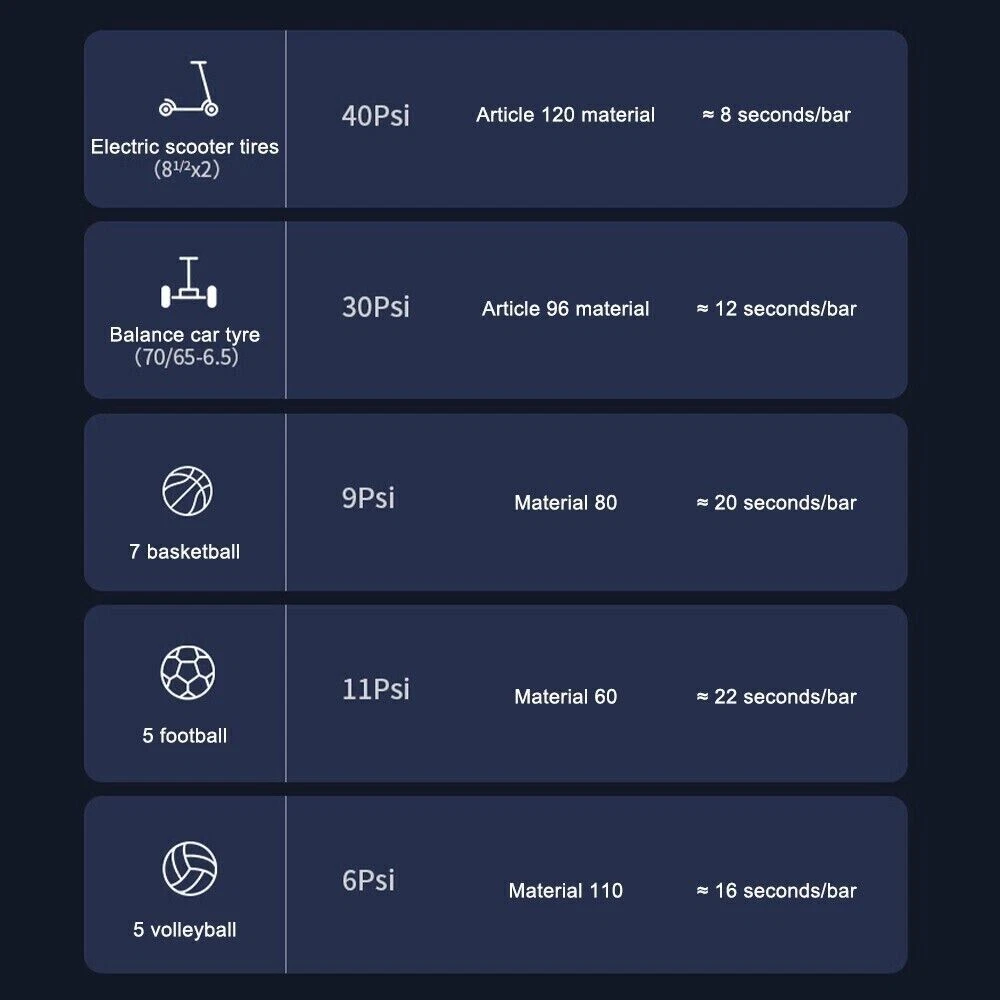 Descriptions: 【FAST INFLATING SPEED and EASY TO USE】 【Built-in LED light 】 【4 Extra Nozzles】 【Compact Size Tire Inflator】 Specification: Product material: ABS Overall Dimension: 80*52*158mm Rated input: 5V1A Piston Diameter: 19mm Rated power: 60W Pressure range: Pressure: 3-150PSI Accuracy: ±1.5psi Air volume: 16L / min Continuous working time: 8-10min Length of on-board charging cable: 3M Operating temperature: -20℃~60℃ Package List: 1 * Main unit 1 *Inflatable hose 4 * Inflatable nozzle. 1 * Type-C cable 1 * 3M American 12V cable 1 * Instruction manual 1 * Color box Note: .Never allow children to use it. .Operation generate heat. While it is working for over 10min, please stop it for a few minutes to cool it down. 150 PSI Air Compressor Tire Inflator Fits Car Moto Bike Tires Air Pump Portable D escriptions: 【 FAST INFLATING SPEED and EASY TO USE】 Simply plug this auto tire air compressor into the 12V power outlet and attach the hose to the tire you wish to inflate. You can just flip the switch, then shut it off once the tire pressure hits your desired number. 【3M-LONG RANGE】 Besides, the 3M power cable is long enough to reach all the tires easily. A long cable eliminates needs to unplug it each time. 【 Built-in LED light 】 The built-in LED light makes this mobile inflator ideal for use at any time of day or night, and it even features a SOS signal function for added safety on the road. 【 4 Extra Nozzles】 Our tire pump has 4 extra nozzles which allow to inflate all types of tire, such as car, motor, ATV, or midsize SUV, sports equipment and inflatables adaptors included. Perfect for your inflatable boats, balls and other inflatables. 【 Compact Size Tire Inflator】 Keeps pumps handy to fix a flat or inflate air mattresses when you travel away from home. Specification : Product material: ABS Overall Dimension: 80*52*158mm Rated input: 5V1A Piston Diameter: 19mm Rated power: 60W Pressure range: Pressure: 3-150PSI Accuracy: ±1.5psi Air volume: 16L / min Continuous working time: 8-10min Length of on-board charging cable: 3M Operating temperature: -20℃~60℃ Package List: 1 * Main unit*1, 1 *Inflatable hose 4 * Inflatable nozzle. 1 * 3M American 12V cable 1 * Type-C cable. 1 * Instruction manual 1 * Color box Note: Never allow children to use it. Operation generate heat. While it is working for over 10min, please stop it for a few minutes to cool it down. Do not use it close to flammable and combustible object such as gas station. Do not work with high pressure or large volume applications like pools, Inflatable canoe, tire width >245 MM such as truck, vans and off-road vehicles. Payment Shipping Return Contact us About us Payment 1.Paypal, Credit Card, G Pay etc, many payment way is accepted. 2.Please be sure your shipping address is correct before make a payment. Shipping 1.We will ship out the item within 1-3 business days after comfirming the payment, appreciate your patience. 2.If the items are broken on the way( we will check the orders clearly before we sent them ),please contact us in 3 days you received it. We will send you a new one or refund your payment. Return 1.We stand behind every buyer.Items can be returned for exchange or refund within 30 days. 2.Please contact us when you have any confusion of our item, we will solve the trouble for you as soon as possible. Contact us 1.This is professional Seller.We will reply your message within 24 hours. 2.Please contact us whenever you have any question about the item. We will deal with it as soon as possible. 3. If you are unhappy with the item or our service,please Contact Us before leave feedback,just give me a chance,thank you! About us 1. Unless specified otherwise, all our products are IN STOCK and are shipped from Local warehouse - Not Overseas! 2. We provide a 30 day Satisfaction Guarantee or your money back (provided items are in the same new and resaleable condition.) 3. We have a PayPal Verified Business Account, please buy with Confidence! 4. Every item will be tesrted before send.We know our products well and if we don't have the answers we will do our best to find them for you! 5. Our friendly team look forward to serving you! Your satisfaction is our No.1 Priority We will do our best to satisfacy you.