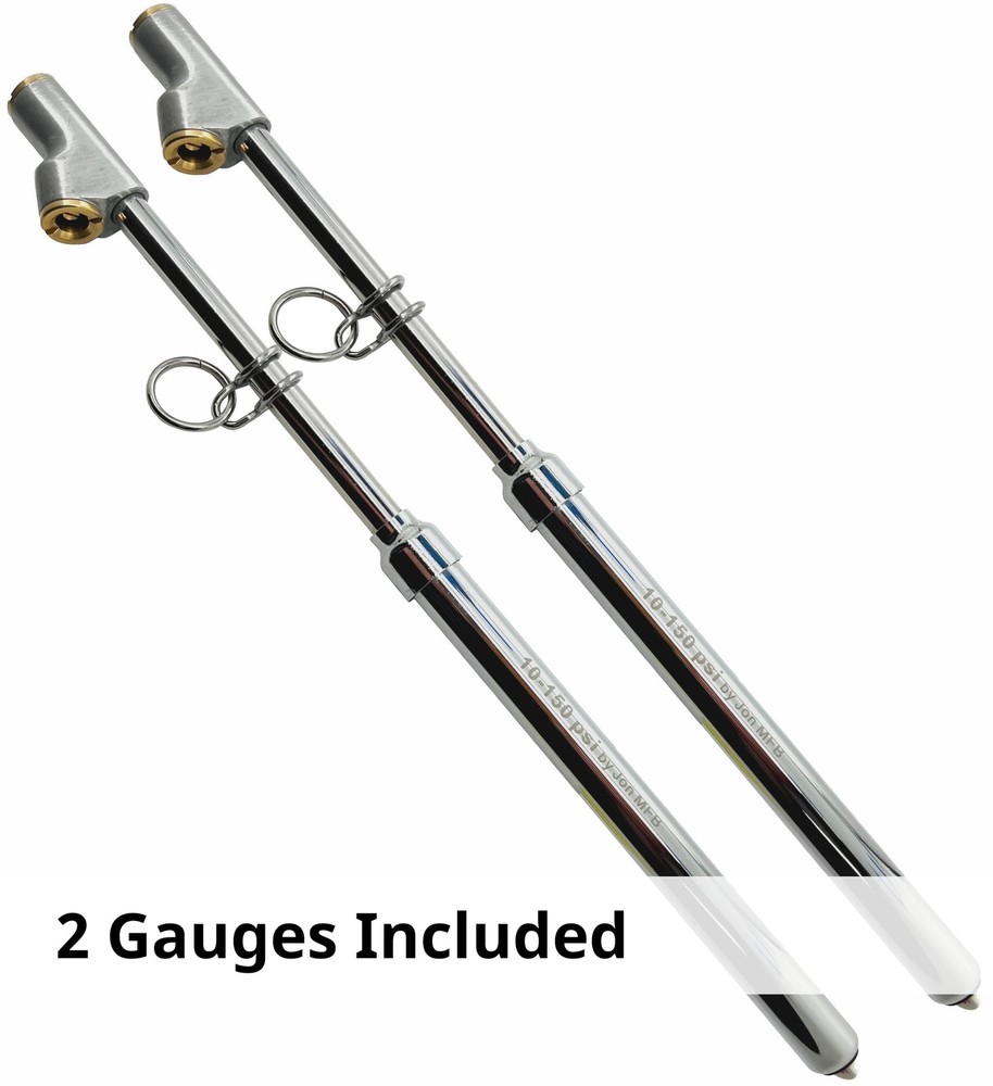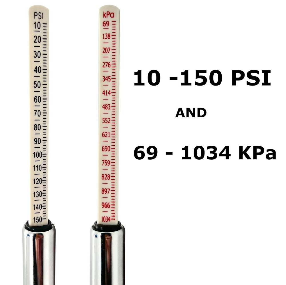 Semi Truck Tire Pressure Gauge. 10 - 150 Psi. Heavy Duty Commercial Air Pressure Gauge for Professional Tractor Trailer Drivers. Perfect for an RV Tire Pressure Gauge,.. Duallies and Cars. Air pressure Gauge for tires and great accessory for wheel & tire air compressors & inflators. 2 Gauges. HIGH QUALITY : Industrial Zinc Alloy head, Brass Ends, Thick Seals, and a Solid Brass Core. DUAL PRESSURE GAUGE : Measurements for 10 - 150 psi and 69 - 1034 Kpa with an easy to read scale. DUAL HEAD CHUCK: Extended straight gauge for hard to reach valve stems on trucks, Duallies, Tires MULTI USE : This is a professional tire gauge . Great for RV, Van, SUV, Dually and Motorcycle. Quality Tire Gauges For Tire Pressure and an Important part of any Tire Repair Kit. GUARANTEED : If you have a problem us and we work to resolve any issue. ALTA CALIDAD: cabeza de aleación de zinc industrial, extremos de latón, sellos gruesos y núcleo de latón macizo. MANDRIL DE AIRE DE DOBLE CABEZAL: Calibre recto extendido para vástagos de válvula profundos o difíciles de alcanzar en camiones y neumáticos. USO MÚLTIPLE: este es un medidor de neumáticos profesional, pero funciona muy bien para RV, Van, SUV y motocicletas. SERVICIO AL CLIENTE GARANTIZADO: Si tiene un problema contáctenos y trabajaremos para resolver cualquier problema.