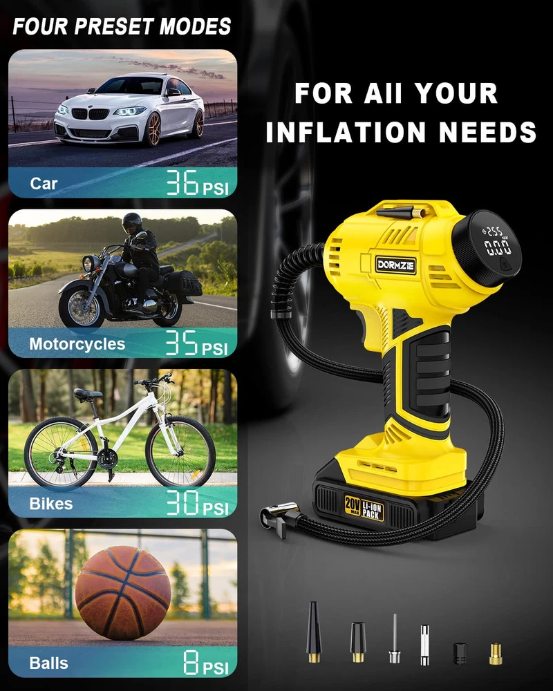This portable tire inflator is a game-changer! The cordless design and powerful 20V battery make inflating tires quick and effortless. The metal construction ensures durability, and the auto shut-off feature takes the guesswork out of hitting the right pressure. It’s fast, reliable, and perfect for emergencies or regular use—no more struggling with manual pumps or hunting for gas stations. Highly recommend for any car owner!