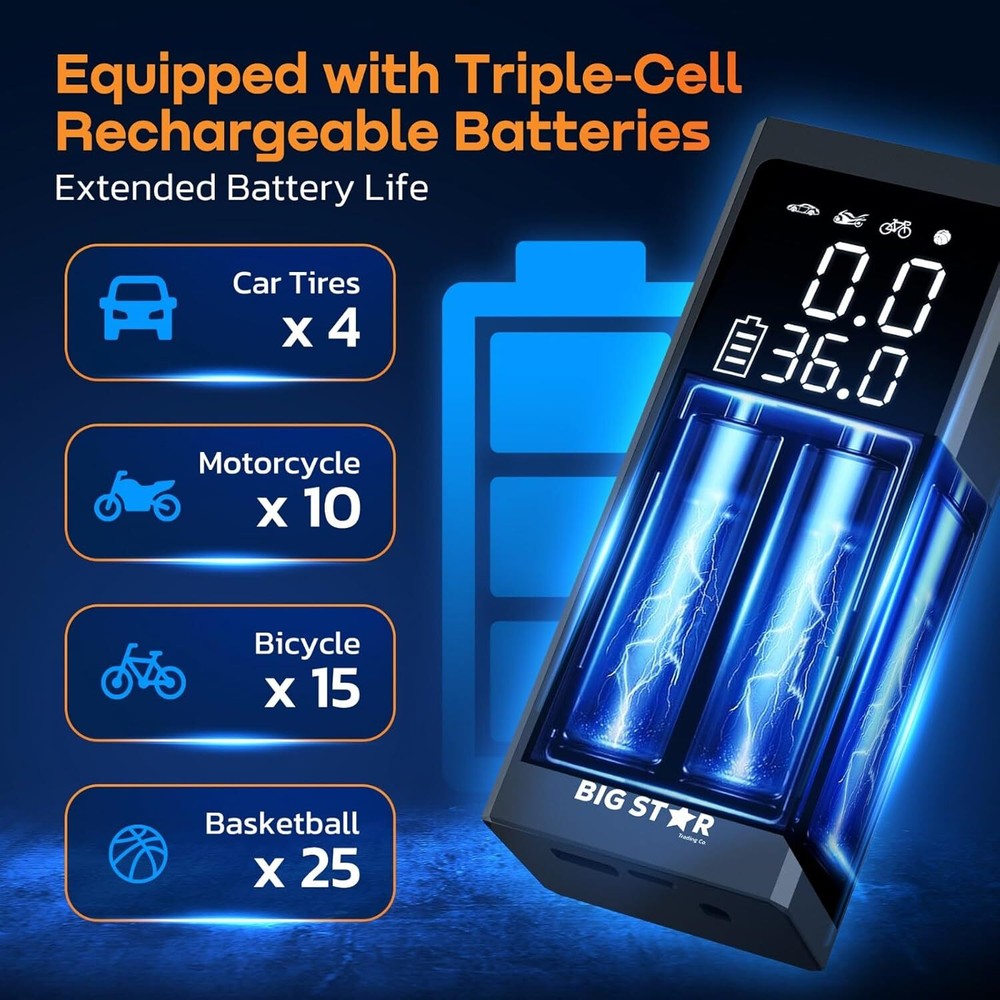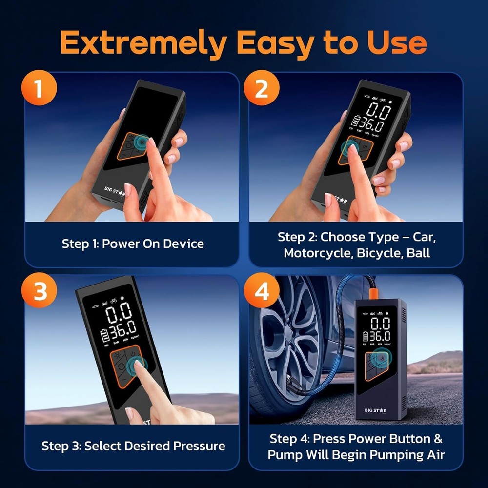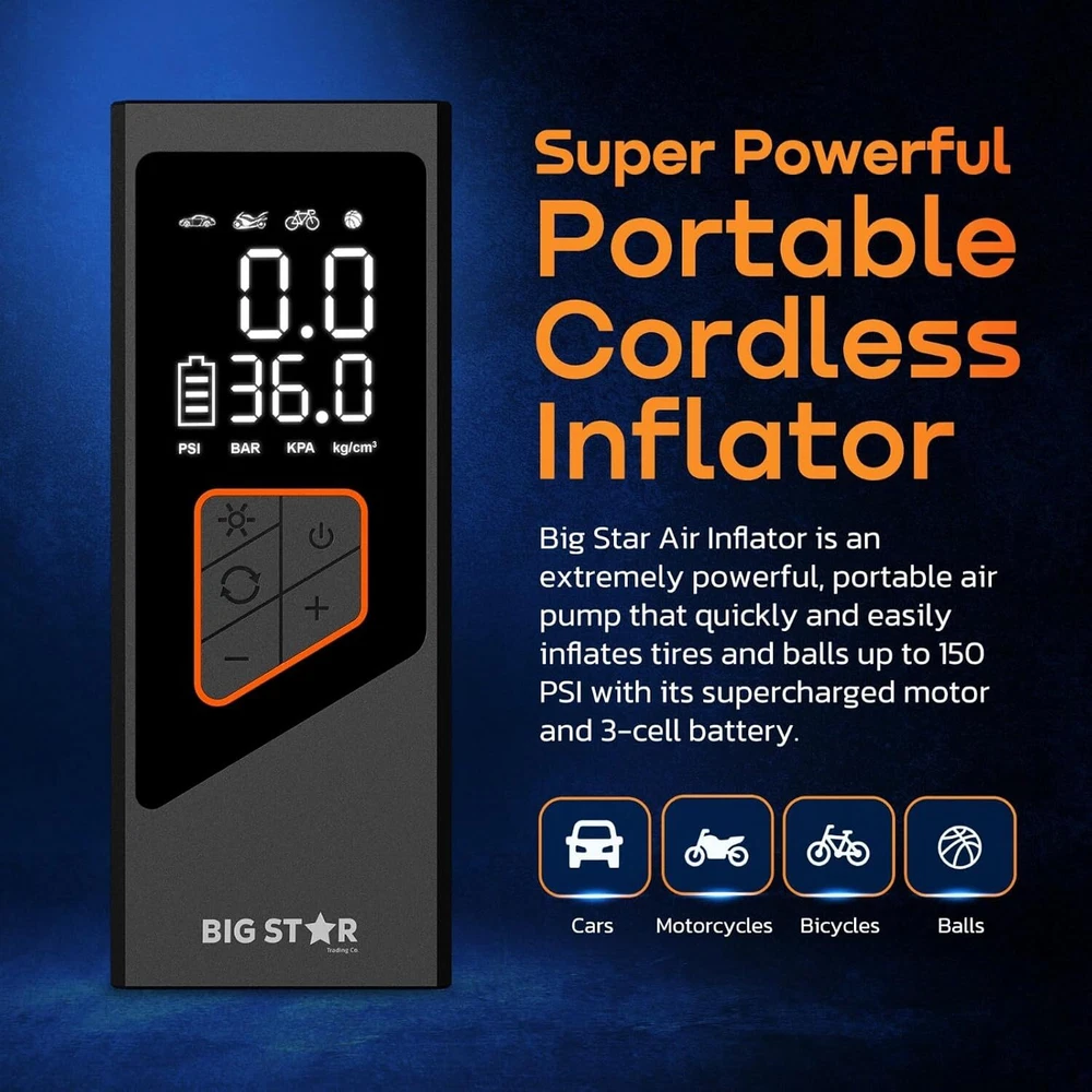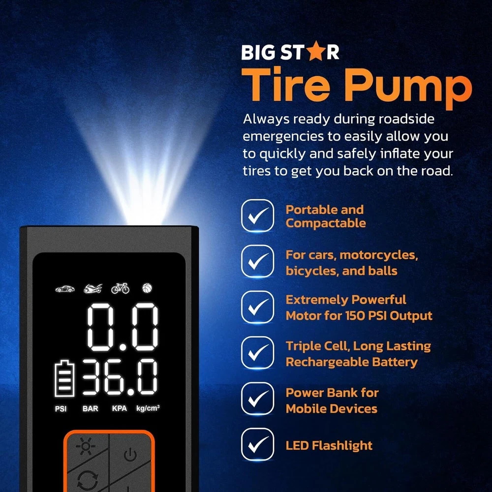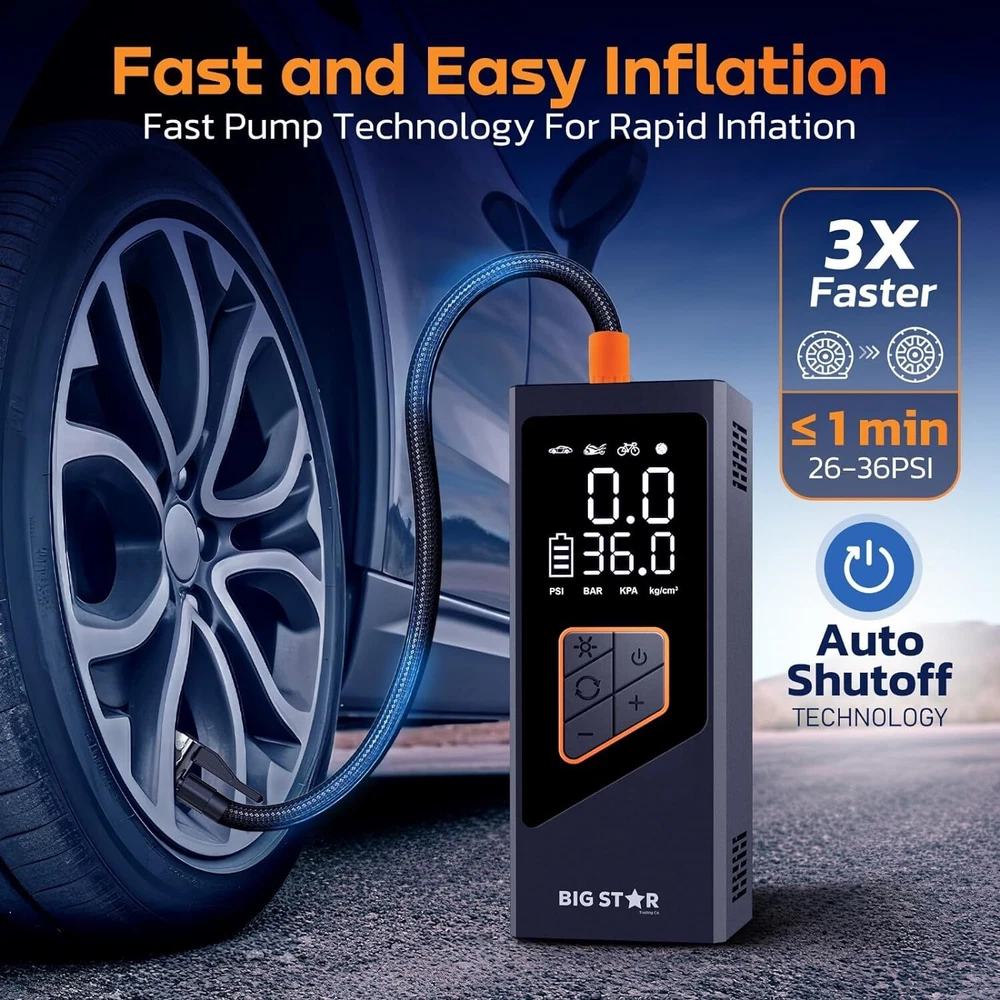 Product Description Big Star Premium Portable Tire Inflator | 3X Faster Inflation up to 150 PSI | Cordless Electric Pump w/Pressure Gauge for Cars, Motorcycles, Bikes, Balls, Inflatables | Power Bank | Emergency Light ๐๐ข๐ซ ๐๐จ๐ฆ๐ฉ๐ซ๐๐ฌ๐ฌ๐จ๐ซ: Equipped with a triple-cell, extended-life rechargeable high-capacity battery. This portable air compressor does not require an external power supply while working but comes with a cigarette lighter. 3x faster inflation speed, 3.9x more power than other ordinary electric air pumps. ๐๐จ๐ซ๐ญ๐๐๐ฅ๐ ๐๐ข๐ซ ๐๐ฎ๐ฆ๐ฉ: The powerful tire inflator has a built-in high-performance chip that can quickly inflate tires. It provides a maximum pressure of 150 PSI and an airflow of 36 L/Min. Fill a small car tire up (25-36PSI) in 1 minute in everyday situations or fully inflate car tires (0-36PSI) in just 5 minutes. ๐+๐ ๐๐ฆ๐๐ซ๐ญ ๐๐จ๐๐๐ฌ: 4 preset inflation modes (bike, motorcycle, car, and ball) are convenient for beginners to choose from. The manual mode can also set the pressure value (3-150psi) according to the inflation object to meet various requirements. It is an ideal choice for inflating cars, motorcycles, and bicycle tires. ๐๐๐๐ฎ๐ซ๐๐ญ๐ ๐๐๐ ๐๐ฎ๐๐ฅ ๐๐๐ซ๐๐๐ง: Air pump for car tires is equipped with dual digital LCD screens, the upper and lower screens display real-time tire pressure and preset tire pressure data. The tire pump can preset and monitor the tire pressure, and automatically shut off when the set pressure is reachedโno need to worry about over-inflating your tires. ๐๐ฎ๐ฅ๐ญ๐ข๐ฉ๐ฅ๐ ๐๐ซ๐๐๐ญ๐ข๐๐๐ฅ ๐ ๐ฎ๐ง๐๐ญ๐ข๐จ๐ง๐ฌ: More than just a tire pump. There is also a USB-C input port/a USB-A output port, making it an emergency power source for mobile phones or other digital devices. At the same time, the top is equipped with an LED emergency light, which helps to provide convenience for inflating and changing tires in dark places. About Us We are a reputable seller with many years of experience selling on eBay. Our goal is to provide high-quality products and excellent customer service. Shipping Items will be shipped within 1-3 business days when we received payment. (Orders are not processed on weekends & holidays) Tracking information will be sent once item is shipped. Delivery time depends on destination and other factors Item is shipped to ebay address. Leaving correct address can minimize delay. For international shipping and shipping to Guam, Hawaii and Alaska, Please contact us before placing the order. International buyers please note: Import duties, taxes and charges are not included in the item price or shipping charges. These charges are buyerโs responsibility. We will try our best to reduce the risk of the custom duties. Local pick-up is unavailable at the moment. Contact Us We reply any email messages within 1 business / working days(off-duty at weekend). If you do not get a response from us, then please check your junk or spam mailbox. Our Business hours: Mon-Fri 9:00-18:00, UTC/GMT +8 hours. Please contact us either by clicking "contact seller" in the "purchase history" section or simply click "ask a question" at the bottom of this page. If you are unsatisfied with our item or service, please contact us before leaving any feedback. We are committed to resolve all issues in a friendly and satisfactory manner.