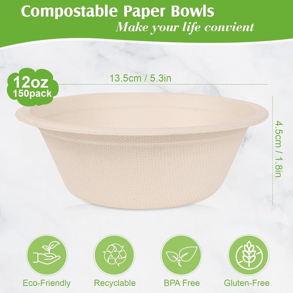 150 Pack Paper Bowls Disposable 12 OZ - Heavy-Duty 100% Compostable Eco-Friendly