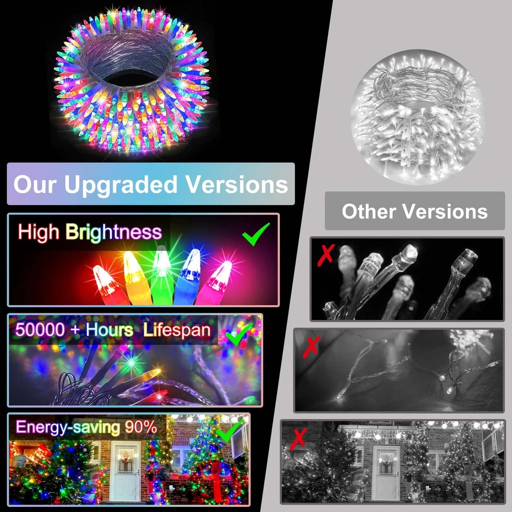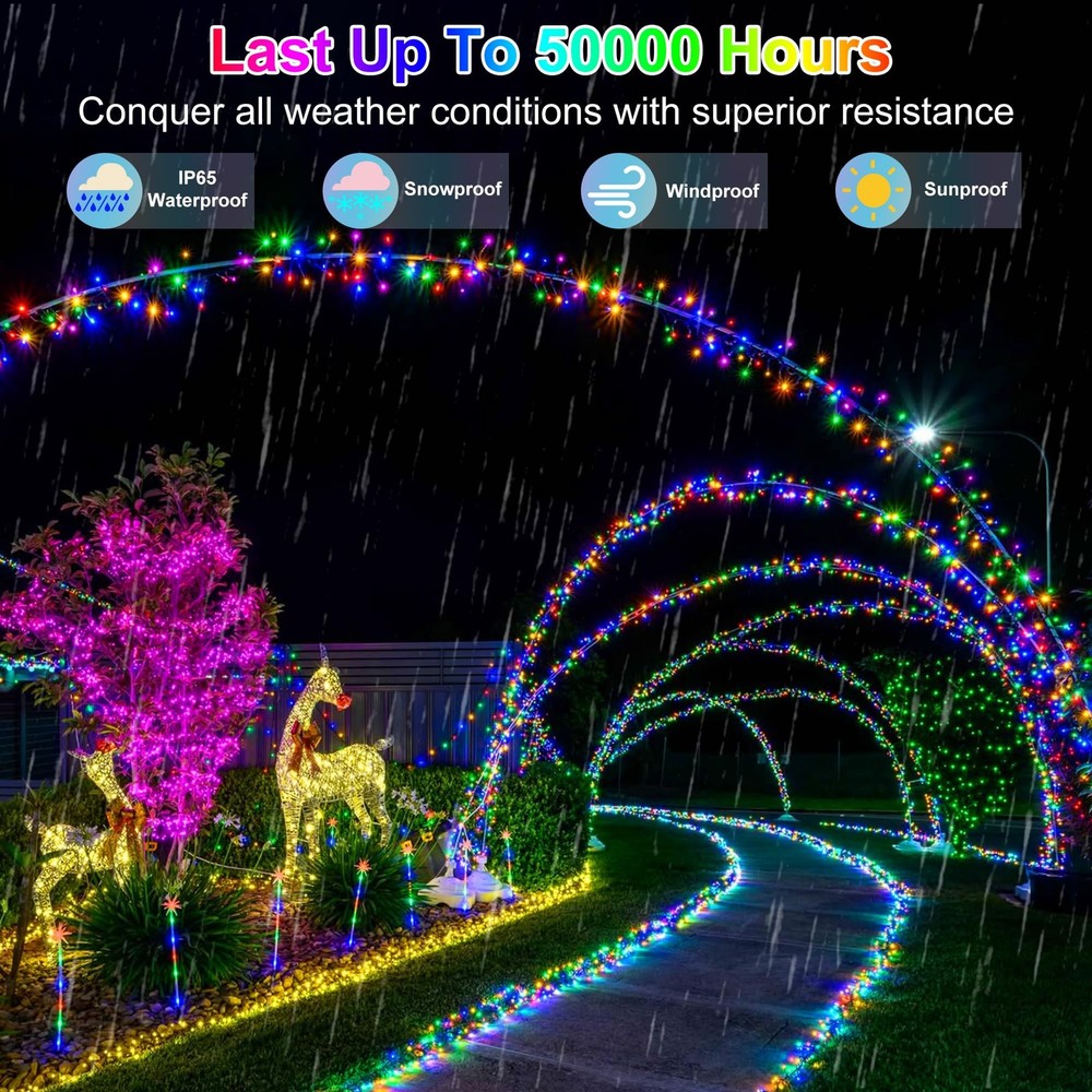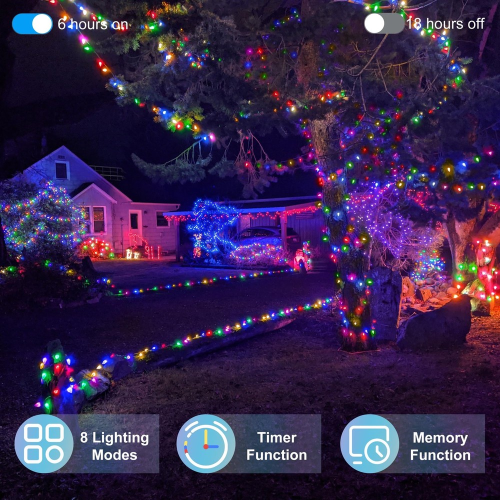 1500LED Christmas Lights: With a massive 492 feet of outdoor Christmas string lights, this string can beautifully decorate even a three-story home with a garage—no need for multiple strings. Let your entire house glow with festive magic, welcoming Santa and his reindeer. Whether wrapping your yard, roof, or windows, this long-lasting light string ensures your home stands out as a holiday beacon 8 Lighting Modes & Memory Function: Choose from 8 lighting modes (Combination, In waves, Sequential, Slow Glow, Chasing/Flash, Slow fade, Twinkle/Flash, Steady on)to set the perfect holiday scene, from warm steady glow to fun flashing patterns. Plus, the memory function remembers your last setting, so no need to reset it every time. Whether it’s a peaceful evening or a lively Christmas gathering, your home will stay lit just the way you want, capturing the spirit of the season LED Cheistmas Lights for Peace of Mind: Designed with low voltage, these LED Christmas lights are safe and energy-efficient, perfect for long-term use indoors or outdoors. They stay cool to the touch, making them ideal for homes with kids and pets. Enjoy a bright, glowing holiday display without the worry of high electricity bills or overheating, keeping your celebrations safe and sustainable Built-in Timer: This Christmas string lights includes a convenient timer function that allows you to set it and forget it! It automatically turns on and off at the same time each day, so your home stays lit even when you're away or busy with holiday prep. Perfect for keeping the festive atmosphere alive without any daily hassle, like having your own Christmas elf Weatherproof & No Extension Needed: With waterproof technology and a generous 492 feet length, this christmas fairy lights covers large areas without additional connections, even in harsh winter weather. Let your home sparkle through snow, rain, or wind, Whether it's a roof, patio, front porch, garden, fence, garage, or lawn. It’s the ultimate in hassle-free holiday decorating, with one string bright enough to handle it all.Plus, with our 12-month warranty and 30-day