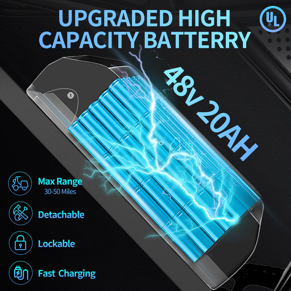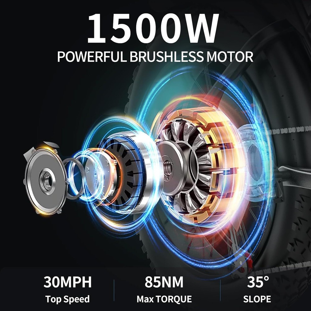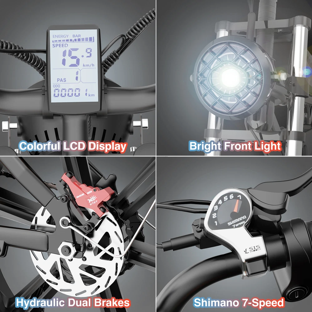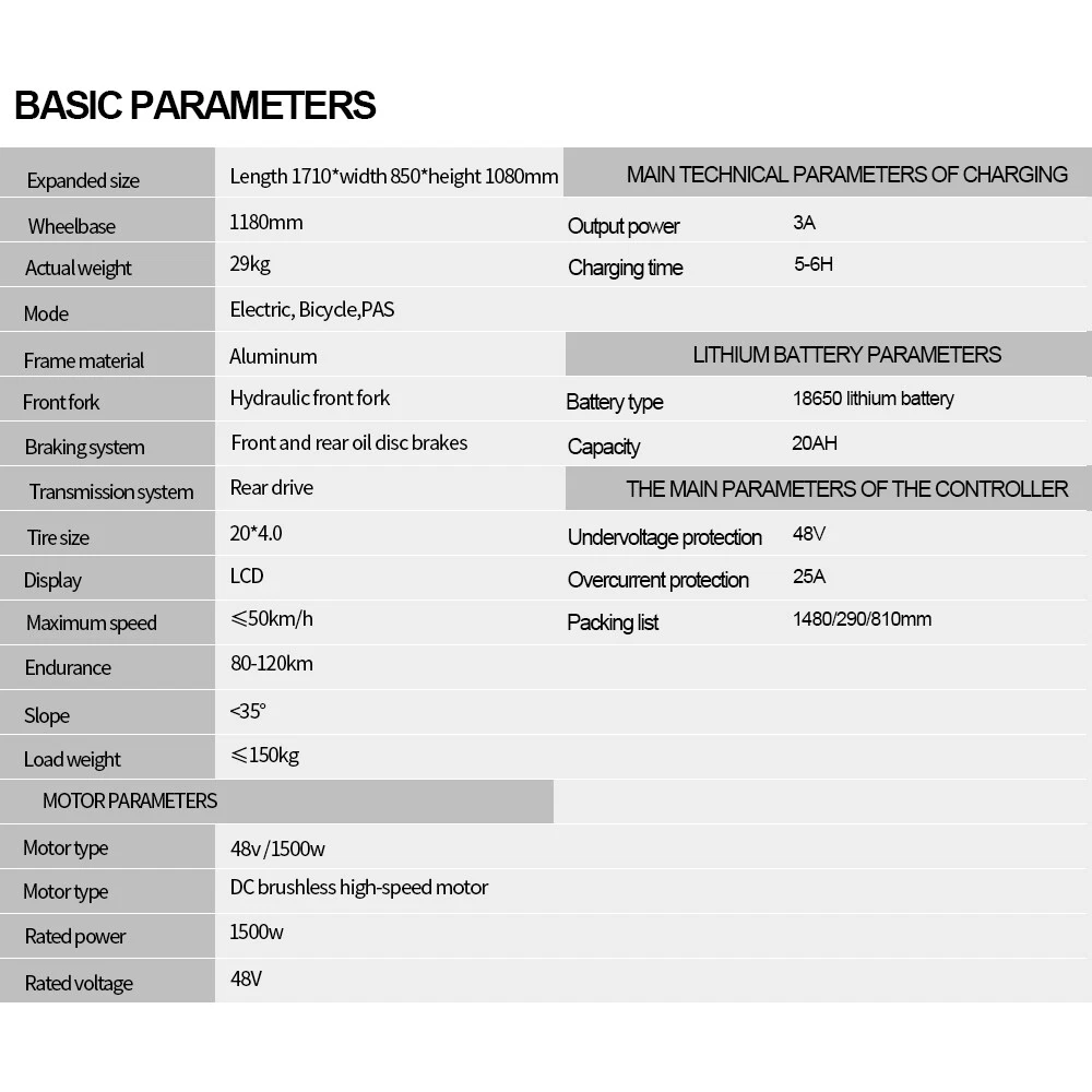Basic parameters ใ๐จ๐ป๐ถ๐พ๐๐ฒ ๐ฆ๐๐๐น๐ฒ & ๐ฆ๐ฎ๐ณ๐ฒ๐๐ ๐๐ฒ๐ฎ๐๐๐ฟ๐ฒ๐ใ- This electric bike for adults stands out with its distinctive design and stylish bike headlight for nighttime safety. The saddle provides a delicate and soft feel, while the strengthened pole and hollowed-out bracket enhance the sports adventure experience. Be the envy of others and embrace the latest fashion trend. ใ๐ฃ๐ผ๐๐ฒ๐ฟ๐ณ๐๐น ๐ญ๐๐ฌ๐ฌ๐ช ๐ ๐ผ๐๐ผ๐ฟ & ๐ฎ๐ฌ''๐ ๐ฐ.๐ฌ ๐๐ฎ๐ ๐ง๐ถ๐ฟ๐ฒ๐ใ- Conquer any terrain with ease using the e bike's powerful 1500W brushless motor, reaching speeds up to 30mph and tackling slopes up to 35ยฐ. The 20''x4.0 fat tires are suitable for snow, beach, mountains, and city roads. Enjoy precise gear shifting with the professional Shamano 7-speed system. ใ๐ฏ ๐ฅ๐ถ๐ฑ๐ถ๐ป๐ด ๐ ๐ผ๐ฑ๐ฒ๐ & ๐๐ ๐๐ฒ๐ป๐ฑ๐ฒ๐ฑ ๐ฅ๐ฎ๐ป๐ด๐ฒใ- Choose between pure electric, electric assist, and pedal modes for versatile riding options. The removable 48V 20AH lithium-ion battery provides a range of up to 50 miles in pure electric mode and up to 75 miles in pedal assist mode. The UL certified battery includes BMS security protection and offers fast charging in 4-6 hours. ใ๐๐ป๐ต๐ฎ๐ป๐ฐ๐ฒ๐ฑ ๐ฆ๐๐๐ฝ๐ฒ๐ป๐๐ถ๐ผ๐ป & ๐๐๐ฑ๐ฟ๐ฎ๐๐น๐ถ๐ฐ ๐๐๐ฎ๐น ๐๐ฟ๐ฎ๐ธ๐ฒ๐ใ- Navigate rough terrains effortlessly with the strengthened front suspension fork. Experience superior performance with the rear hydraulic shock absorber. The hydraulic dual brakes system ensures safer rides by reducing braking distance by 50% compared to mechanical brakes, even in wet conditions. ใ๐จ๐๐ฒ๐ฟ-๐๐ฟ๐ถ๐ฒ๐ป๐ฑ๐น๐ ๐๐ถ๐๐ฝ๐น๐ฎ๐ & ๐๐ป๐ต๐ฎ๐ป๐ฐ๐ฒ๐ฑ ๐ฆ๐ฎ๐ณ๐ฒ๐๐ใ- Stay informed with the advanced LCD display, providing real-time metrics, adjustable parameters, and trip-tracking options. Bright LED headlights and IP5 waterproof protection ensure safe riding in diverse road conditions. The electric dirt bike for adults has a maximum load capacity of 330 lbs. ใ๐๐ผ๐ป๐๐ฒ๐ป๐ถ๐ฒ๐ป๐ ๐๐ฒ๐ฎ๐๐๐ฟ๐ฒ๐ & ๐๐ฐ๐ฐ๐ฒ๐๐๐ผ๐ฟ๐ถ๐ฒ๐ใ- The electric mountain bike includes a 7.2'' phone holder and a spacious storage box. It features a multi-function LCD display, high brightness front light, and tail light for enhanced safety. With 90% pre-assembly, installation is quick and easy. Basic parameters Expanded size: length 1710*width 850*height 1080mm Wheelbase: 1180mm Actual weight: 34kg Mode: pure electric, electric assist, pedal Front fork: hydraulic front fork Braking system:Front and rear red oil disc brakes Transmission system: rear drive Tire size: 20*4.0 Display: LCD Maximum speed โค50km/h Endurance 80km Slope <35ยฐ Load weightโค150kg Motor parameters: 48v1500W Motor type: DC brushless high-speed motor Rated voltage 48V Main technical parameters of charging Output power 3A Charging time 4-6H Lithium battery parameters Battery type: 18650 lithium battery Capacity 20AH The main parameters of the controller Undervoltage protection: 39V Overcurrent protection: 28A Packing list Electric bicycle*1 Battery *1 Bicycle bags*1 Fenders*2 Multi-function tool*1 round headlight*1 Charger*1 Pedal*1 The item is UL 2849 certified with a link to the UL Product iQ < https://productiq.ulprospector.com/en >