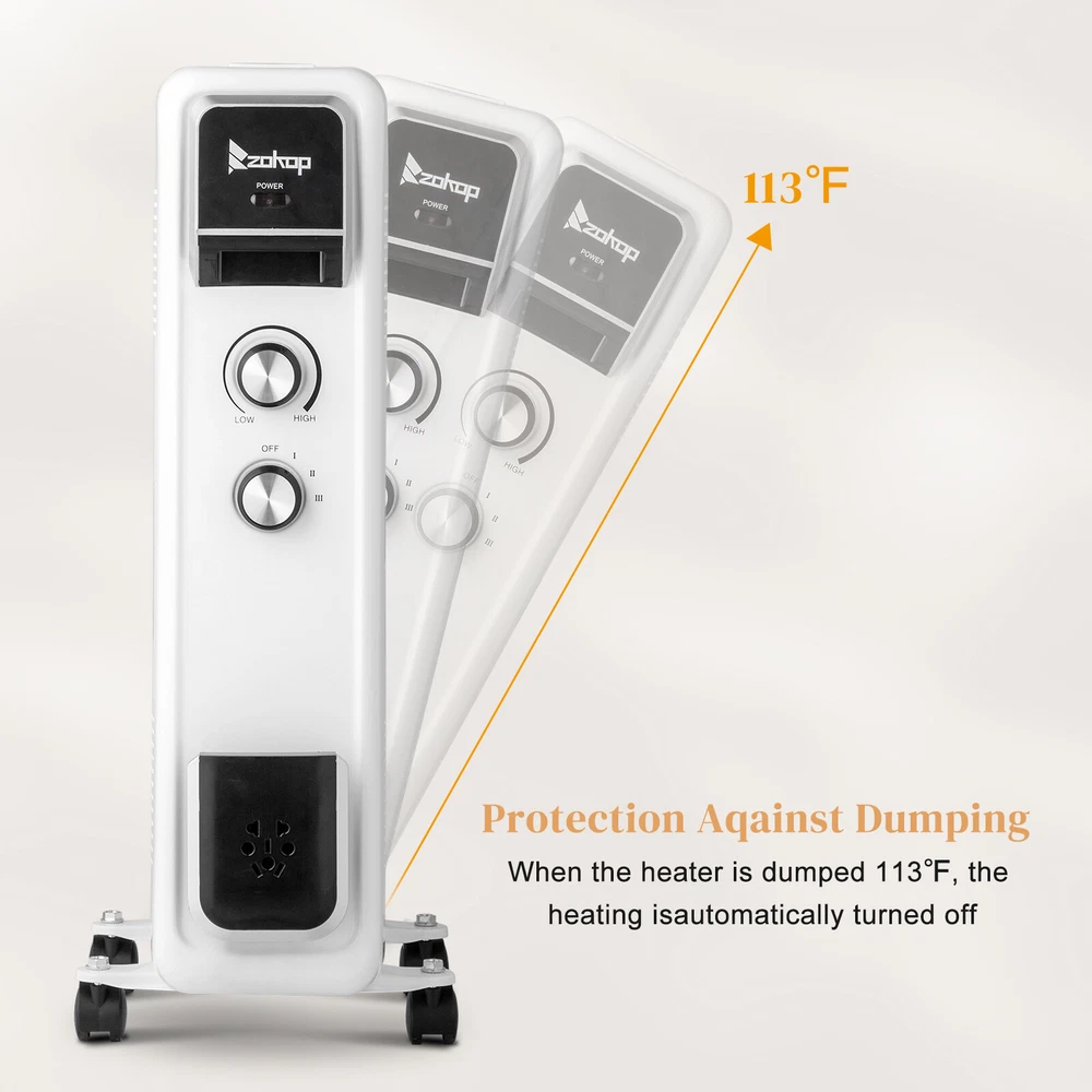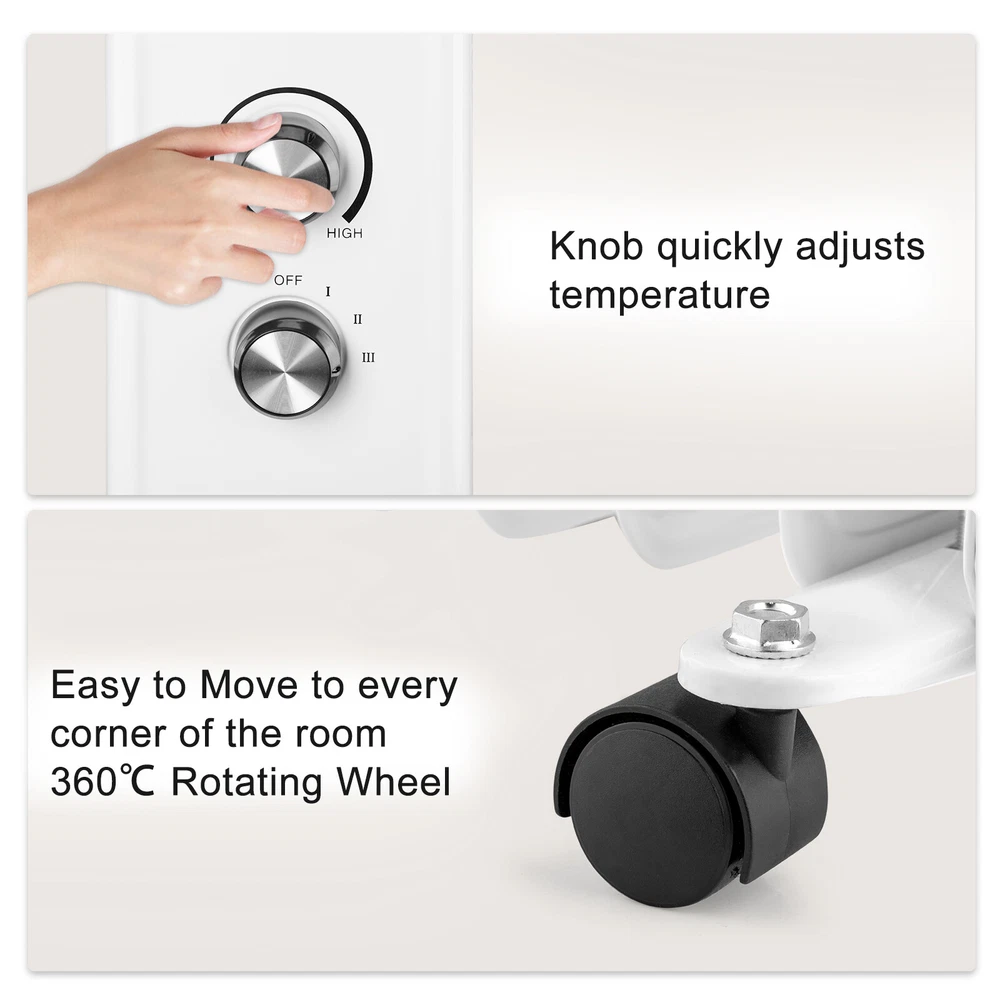 Introductions: Stay warm and cozy throughout the winter with this 1500W Oil Filled Radiator Heater. Designed for optimal comfort, this portable electric space heater is perfect for heating up bedrooms, offices, and other indoor spaces up to 200 sq.ft. With three heat settings, you can easily customize the temperature to your liking. Built with safety in mind, it features overheat and tip-over, ensuring peace of mind while you enjoy consistent warmth. Its quiet operation and portable design make it a practical and versatile addition to any home. Features: 1. Powerful and Efficient Heating: This 1500W oil-filled radiator heater quickly warms up rooms up to 200 sq.ft. The oil-filled fins efficiently retain heat to ensure consistent warmth throughout the day. With three heat settings and an adjustable thermostat, you can easily set the perfect temperature for your space. 2. Whisper-Quiet Operation: Enjoy a serene and cozy environment with this ultra-quiet heater. It operates with minimal noise, making it ideal for bedrooms and offices where silence is essential. 3. Overheat & Tip-Over: If the unit overheats or is accidentally knocked over, it will automatically shut off to prevent any potential hazards. This makes it a safe choice for households with children or pets, giving you peace of mind while staying warm. 4. Cord Storage Rack: Keep your space tidy and organized with the built-in cord storage rack. When the heater is not in use, simply wrap the power cord around the storage rack for easy, clutter-free storage. 5. Portable Design with Wheels: Effortlessly move this heater from room to room with its four 360° swivel wheels. Whether you need extra warmth in your bedroom, living room, or office, this heater's portable design makes it easy to transport and use wherever it's needed most. Specifications: 1. Voltage: 120V/60Hz 2. Rated Power: 1500W 3. Coverage Area: 15-20 sq.m / 200 sq.ft 4. Heating Element: Heating Tube 5. Timer: No 6. Heat Settings: Low - High 7. Digital Display: No 8. Base Included: Yes 9. Remote Control: No 10. Certification: FCC 11. Warranty: 1 year 12. Product Dimensions: (12.6 x 5.9 x 15) in / (32 x 15 x 38) cm 13. Weight: 7.5 lbs / 3.4 kg Package Includes: 1 x Radiator Heater 4 x Wheels 1 x User Manual