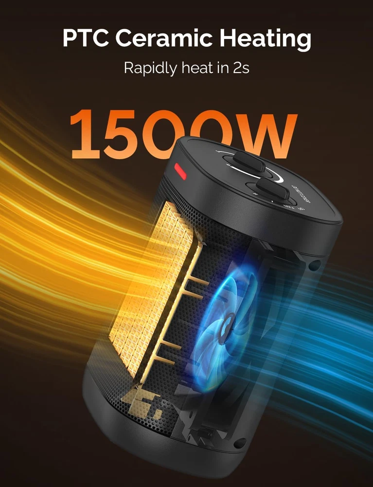 【Large 1500W Heat Outport】: There are three modes, Natural wind, Low heating 900W, and High heating 1500W. Quickly heats up a small area in minutes. With strong heat output, you can feel the warmth immediately. 【2S Fast Heating】: Heat up efficiently and reaches the desired temperature instantly. Advanced Ceramic heaters are faster and more efficient than traditional fan heaters. You could put this electric space heater in the den/living room to keep the chill away while you watch TV. Great for a personal heater. 【Adjustable Thermostat】: An easy-to-use adjustable thermostat is built into the small heater. The thermostat keeps it comfortably warm and saves you money on heating bills in the winter. Lightweight and easy to use. Gives an adequate amount of heat as a small unit used in a normal size bedroom. 【 Portable Heater】: Has an attractive look, and is easy to carry with a built-in handle. Ideal gift for yourself and your loved ones this winter. Small but powerful, noise is not intrusive. No need to worry about the fan sound keeping you awake. Applicable all year round and is suitable for dorms, bedrooms, offices, etc. Dimensions: 6.29” x 4.72” x 8.78”. 【Advanced Safety】: Overheat protection and an enhanced tip-over switch ensures this indoor electric heater shut off instantly in any unsafe situation. Safety fall-over feature is a must. Automatically turns the unit off if overturned or lifted. Product Description 1 Overheat Sensor 2 Tilted Auto Shut Off 3 Safety Protection 4 Upgraded Material Electric Space Heater MEET OUR SPACE HEATER 6.3" x 4.73" x 8.78" Size (inch) 6.3" x 4.73" x 8.66" 1500W Heat Output 1500W Knob Control Control Knob Control Overheat Protection Tip-over Protection Plug Operated Powered Way Plug Operated 6.3" x 4.73" x 8.78" Size (inch) 5.51" x 3.94" x 7.6" 1500W Heat Output 1000W Knob Control Control Knob Control Overheat Protection Tip-over Protection Plug Operated Powered Way Plug Operated 6.3" x 4.73" x 8.78" Size (inch) 4.33" x 4.33" x 6" 1500W Heat Output 500W Knob Control Control Button Control Overheat Protection Tip-over Protection Plug Operated Powered Way Plug Operated Electric Space Heater Portable Space Heater Mini Desk Heater