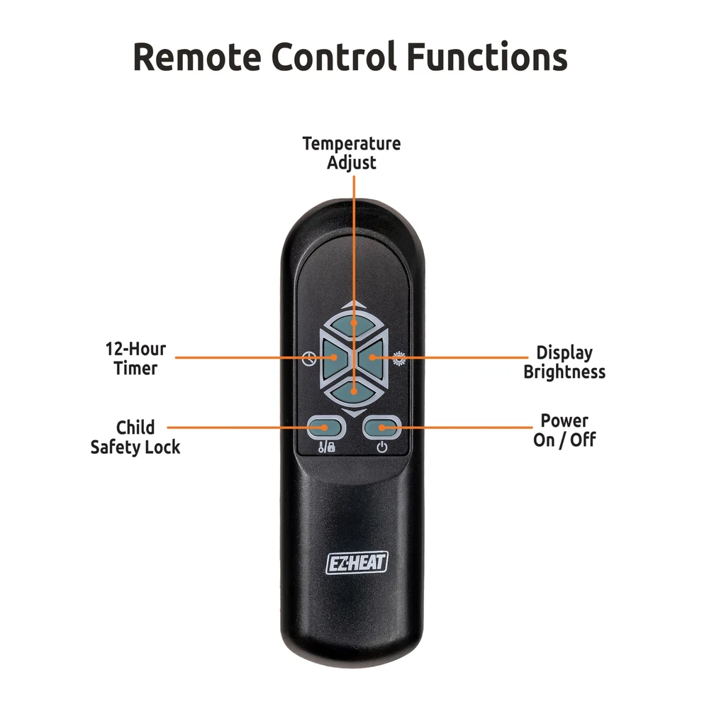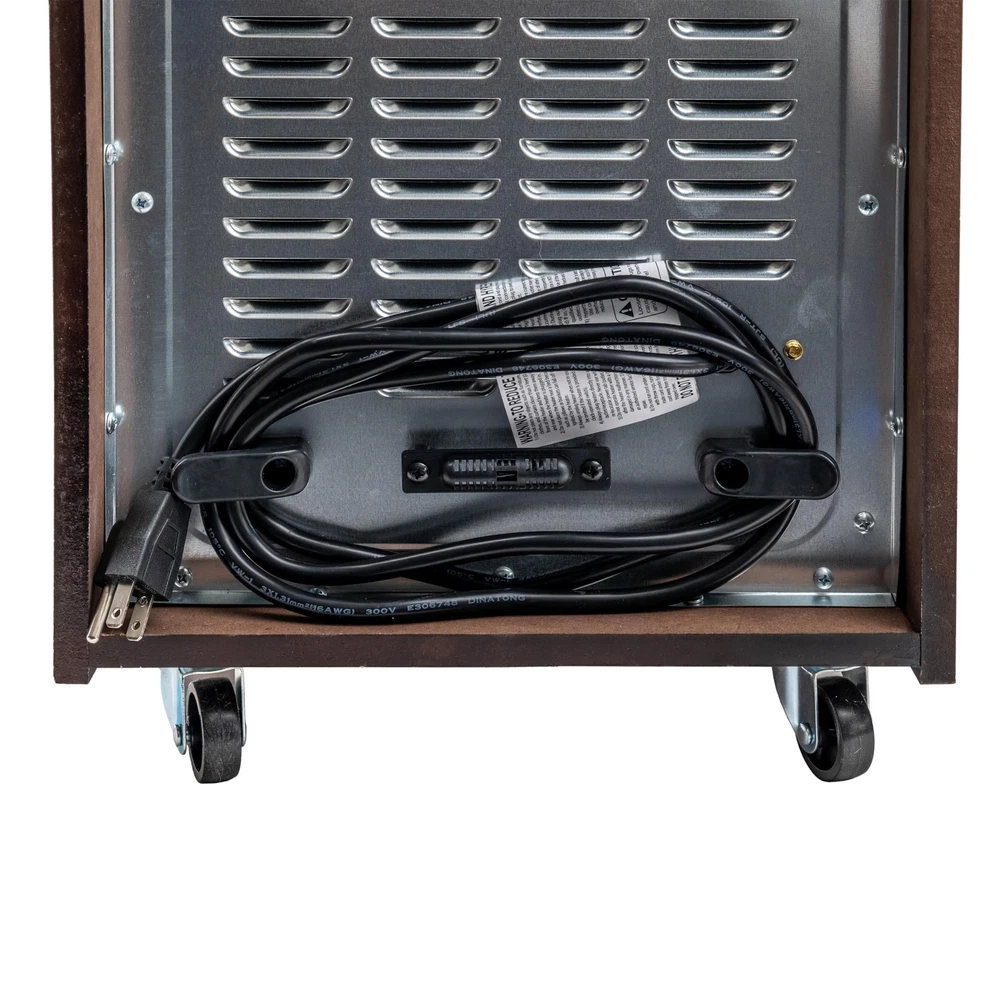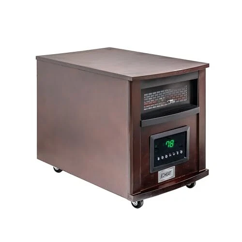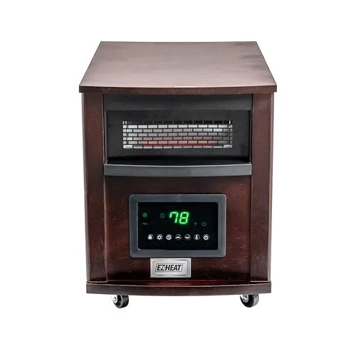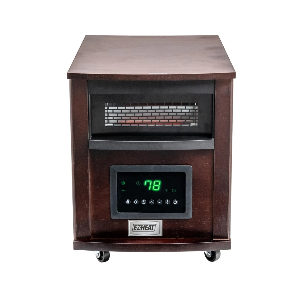 With six high-power quartz infrared heating elements, the Premium Wood Cabinet Infrared Heater by provides even, room-wide comfort. It has two heat settings and an energy saving ECO mode with a 12-hour on/off timer. The digital thermostat display makes room temperature easy to read and the full function remote allows electronic control from across the room. Safety features include swivel casters for easy movement, tip-over switch, child-lock safety measure and overheat protection system. CUSTOMIZABLE TEMPERATURE CONTROL: Easily set your preferred temperature with the control panel arrows or the provided remote. The adjustable thermostat covers a range from 50℉ to 90℉ (10℃ to 32℃). Once your desired temperature is chosen, the heater stays active until the room matches the displayed temperature. Utilizing a seamless cycle of activation and deactivation, it reliably maintains the chosen room temperature. This adaptability guarantees maximum comfort, as the heater dynamically adjusts to uphold the preset conditions. VERSATILE HEAT OPTIONS: Explore the heater's versatility with 3 distinct heat settings. High Mode maximizes warmth with 1500W, providing a robust heating solution. Transition to Low Mode for a more energy-conscious approach, utilizing 750W without compromising comfort. The ECO mode introduces an Economic Energy Saving Function, where the heater intelligently adjusts the temperature to an efficient 68°F (20℃). This automatic regulation in ECO mode optimizes energy consumption, promoting a sustainable cost-effective heating solution. CONVENIENT TIMER & REMOTE CONTROL: After starting the unit, press the timer button on the control panel or remote. Each button press will increase the timer length by 1 hour up to 12 hours. To cancel the timer, cycle through the lengths until the value is “00”. The timer light is on when timer–power-off is set. Under power-off mode, press the timer button on the control panel or remote. Digital display will indicate the time value for the timer. Each button press will increase the timer length by 1 hour up to 12 hours. INFRARED HEATING: Please note that infrared heaters do not heat like traditional heaters. They do not blow hot air. They heat objects and not the air in your room. They are intended to supplement rooms that are insulated and already heated by your home or building. They tend not to work well in un-insulated garages, RVs, or unheated basements. They take a little longer to warm a room, but do a much better job maintaining a desired temperature. ENSURED SAFETY MEASURES: Incorporating a tip-over safety mechanism, this heater automatically powers down upon being tipped over. Once returned to an upright position, the heater resets, requiring reactivation either through the provided remote control or the heater's control panel. With an overheat safety feature, the heater proactively shuts off if internal components approach a temperature that may lead to overheating or fire risk. To reset, turn off the heater, switch the master power switch off, unplug it, & allow a 20-minute cooldown.